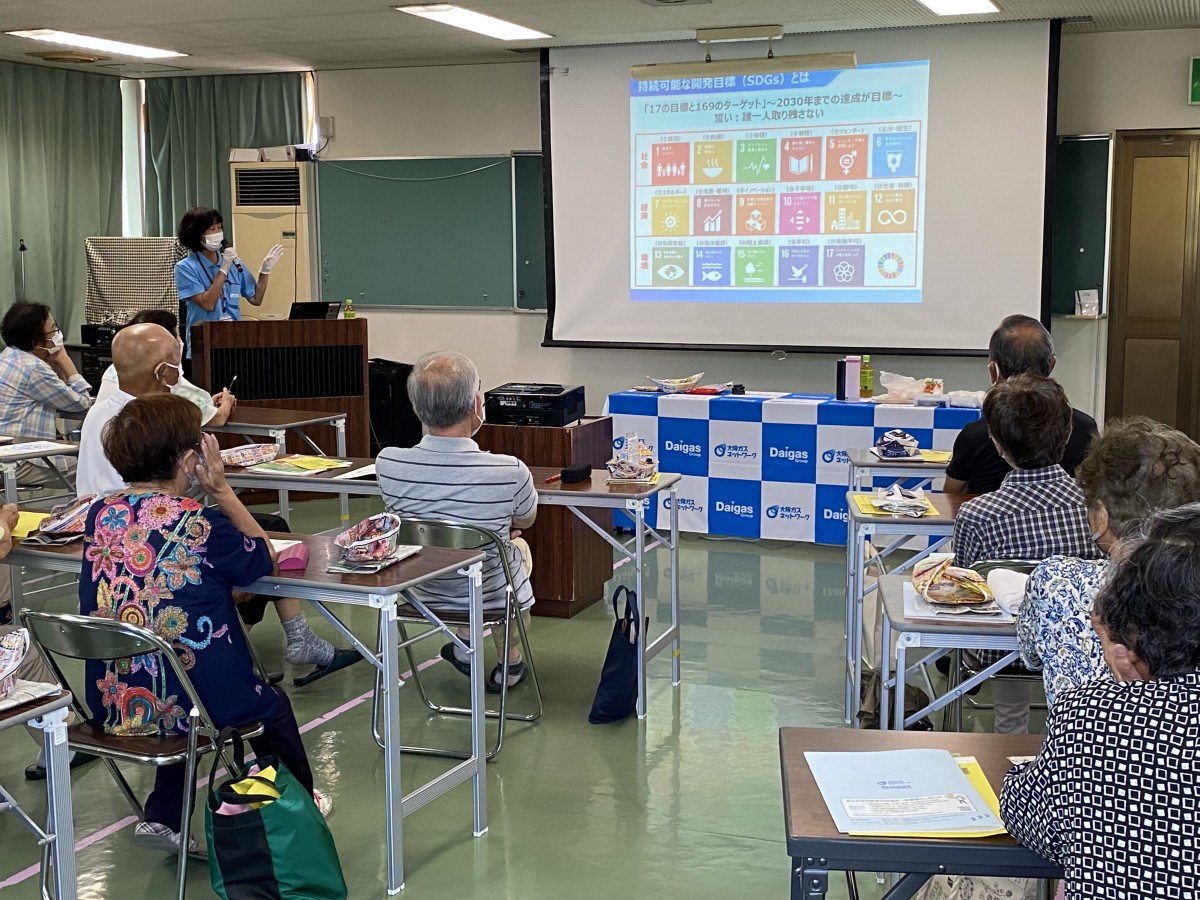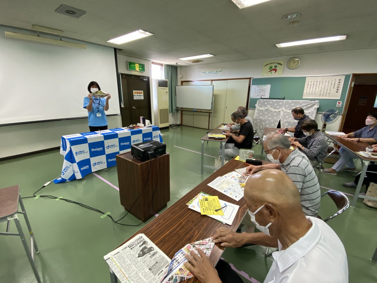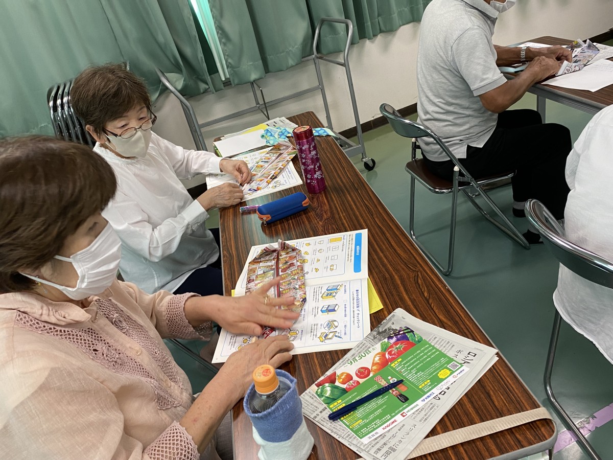 9月13日、大阪ガスネットワーク(株)京滋事業部からお二人の講師をお招きし「その時、あなたを守れる、あなたになろう」をテーマに防災教室を開催しました。近年、温暖化が進む地球。この日本でも多くの自然災害が発生しています。災害に備えましょうと言われていますが、何を備えて良いのかわからない!いざとなると何も出来ない!そんな状況を減らすために、冊子と映像を使って「自分を守る」ための備えや、イザという時に役立つ身の回りの防災アイテムとして、チラシを使っての食器作りと、新聞紙のスリッパ作りを体験しました。簡単につくれた上に、スリッパは暖かく「へえ~なるほど」「凄い!」などの声がたくさんあがりました。わからない所は教えあったり、たくさんの笑顔がありました。また、食器つくりに再挑戦する方もあったりと、「普段から自分を守れる、自分になりたい」そんな意識の高まった講座でした。