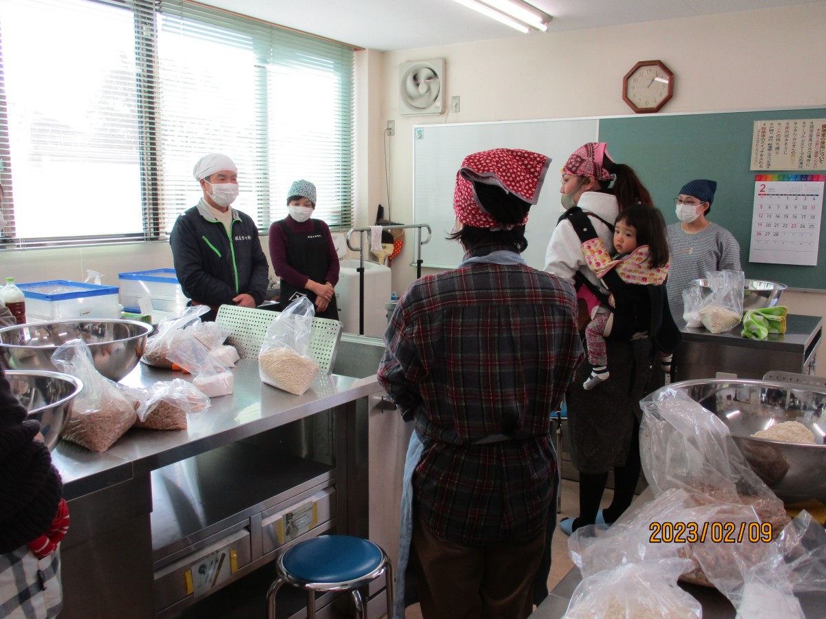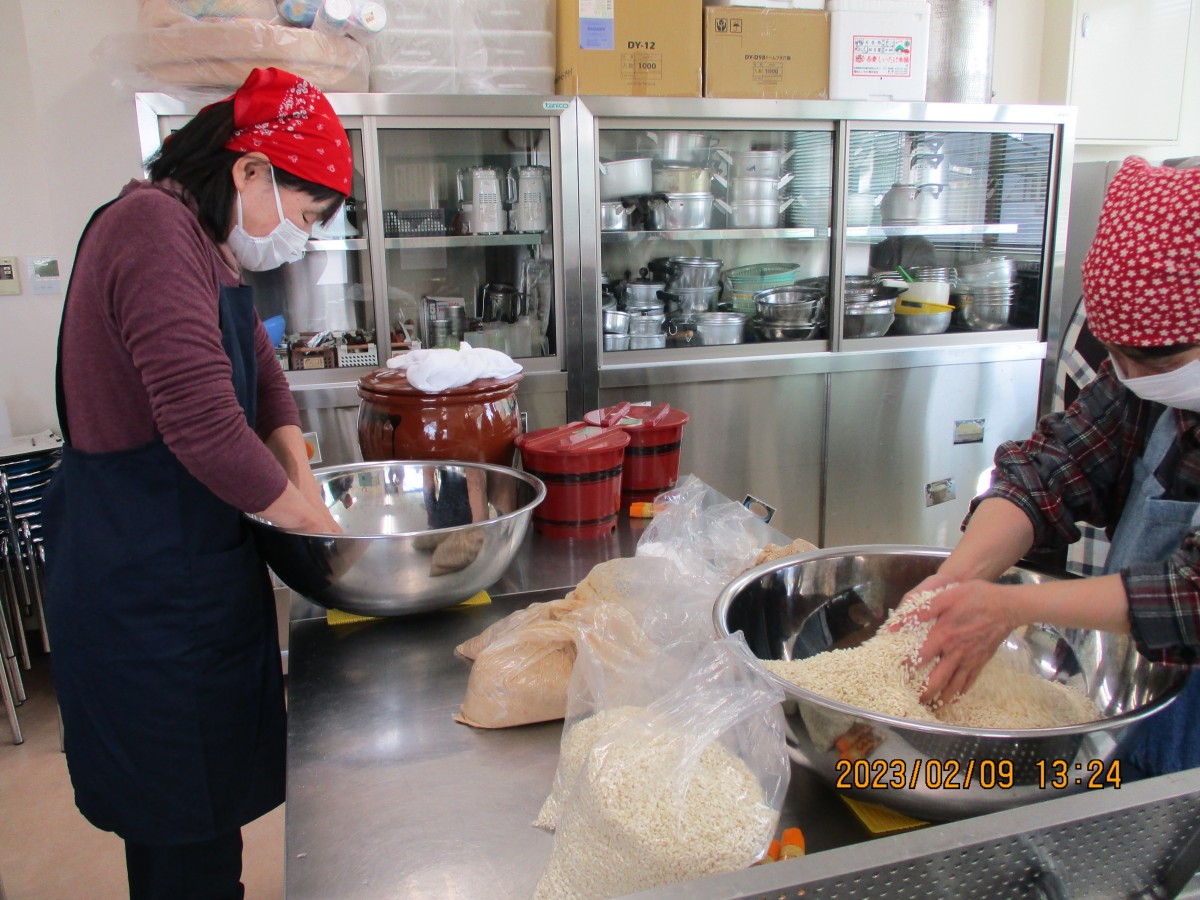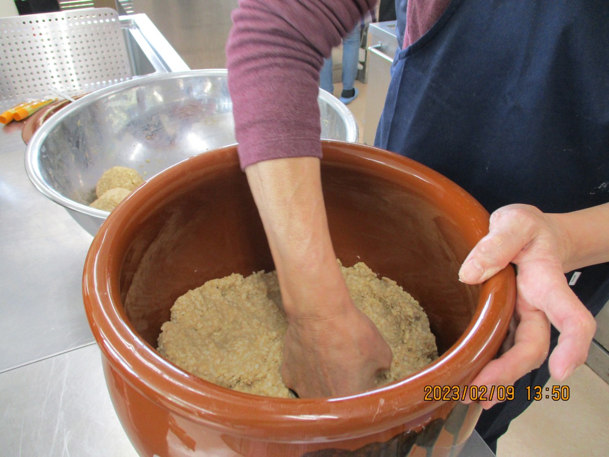 2月9日、糀屋吉右衛門 山崎豊彦さんを講師に迎え、センター講座「手作り味噌講座」を開催しました。毎年恒例になっている人気の講座です。まず煮豆を袋の上からつぶします。ほぐした糀と塩をよく混ぜたものにつぶした豆を入れ、よく練り上げます。味噌ボールを作り、空気が入らないよう容器にきちっと詰めます。半年後の仕上がりが楽しみです。