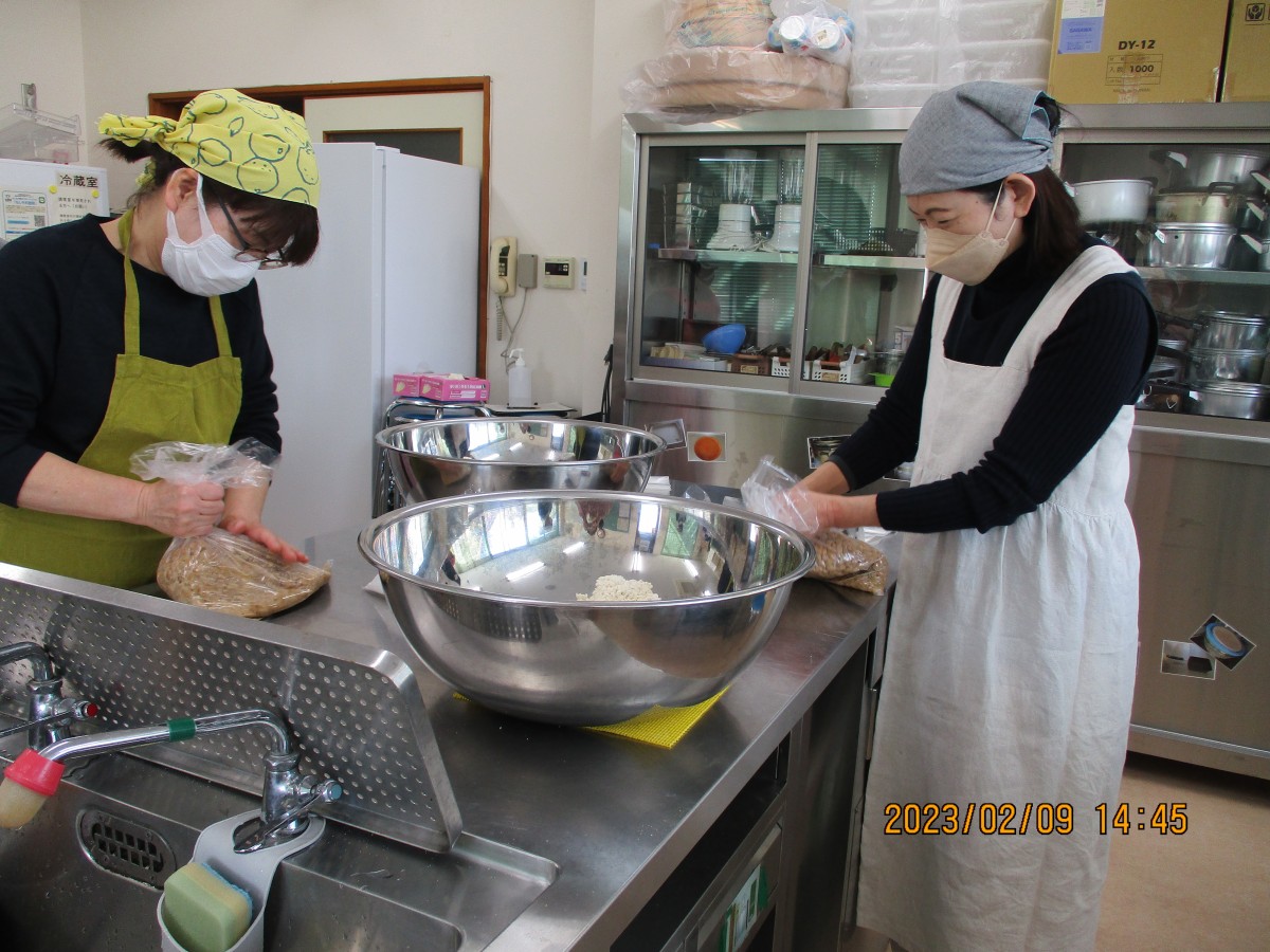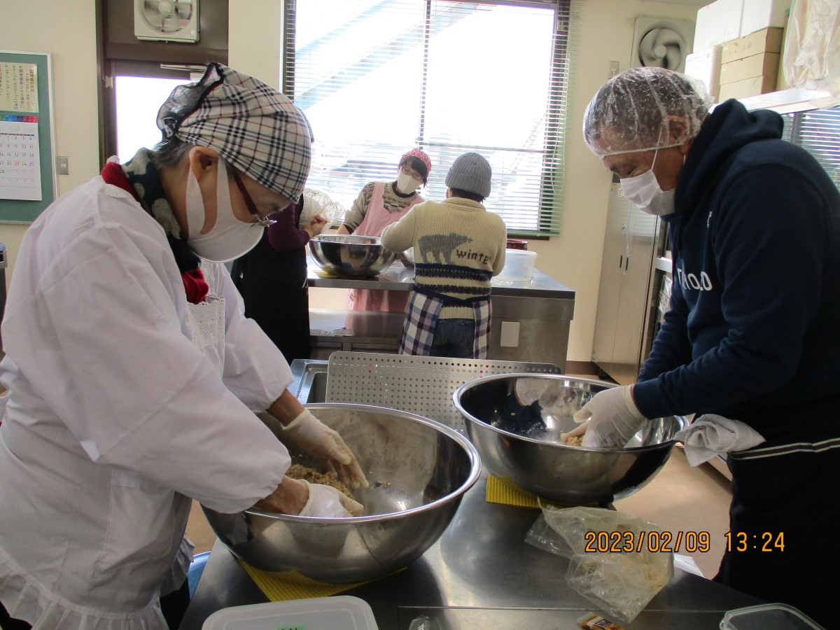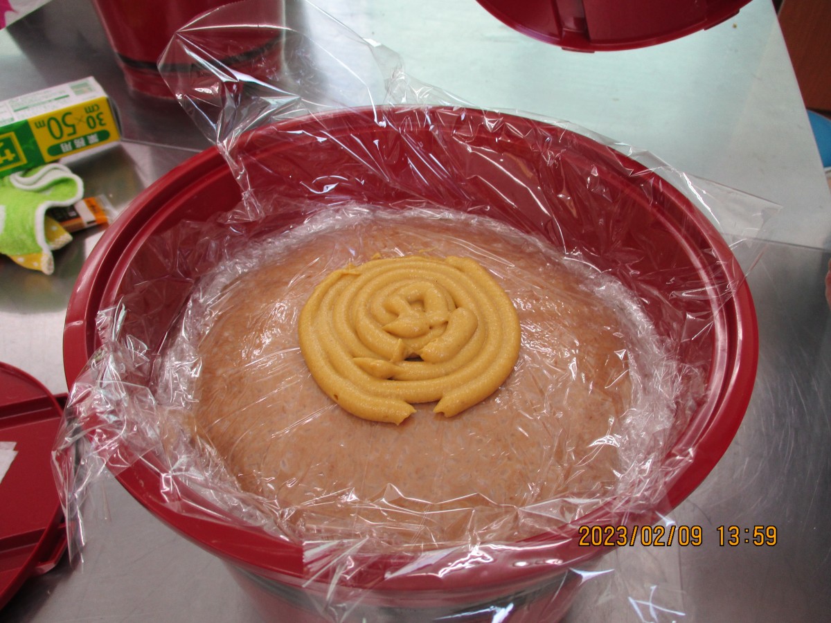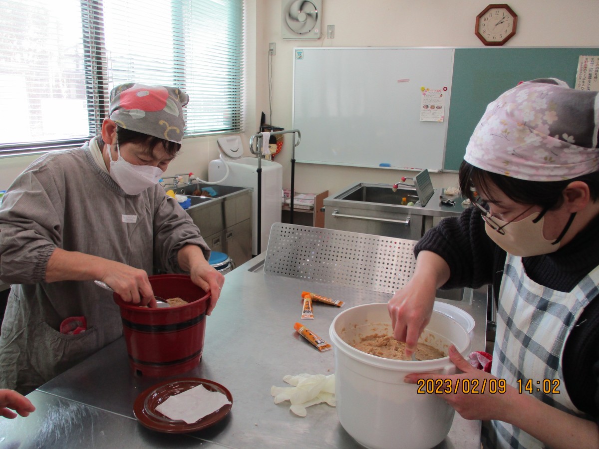2月9日、糀屋吉右衛門 山崎豊彦さんを講師に迎え、センター講座「手作り味噌講座」を開催しました。毎年恒例になっている人気の講座です。まず煮豆を袋の上からつぶします。ほぐした糀と塩をよく混ぜたものにつぶした豆を入れ、よく練り上げます。味噌ボールを作り、空気が入らないよう容器にきちっと詰めます。半年後の仕上がりが楽しみです。