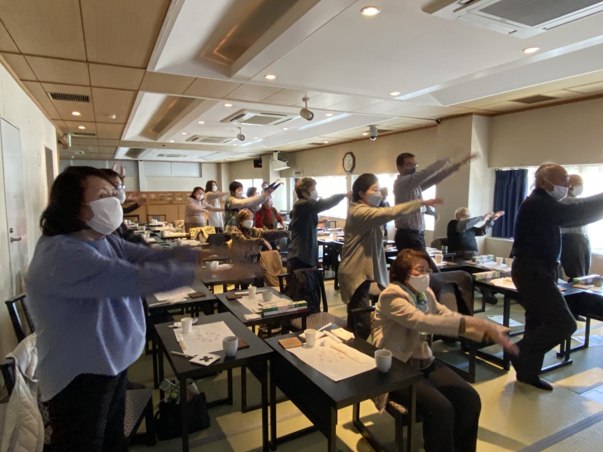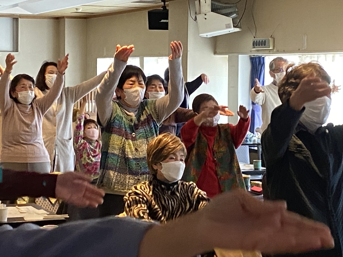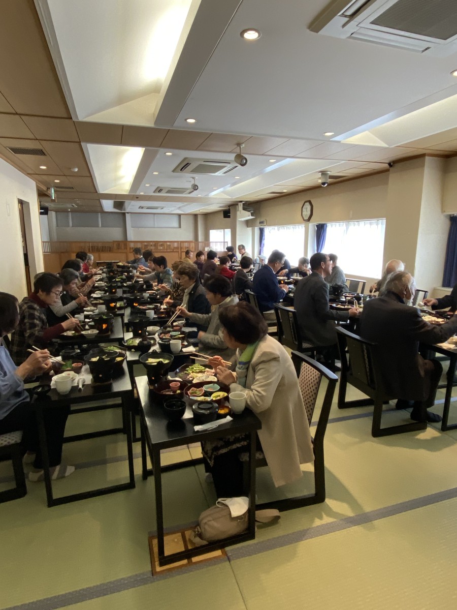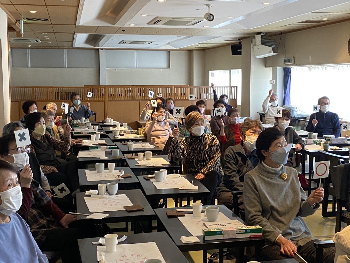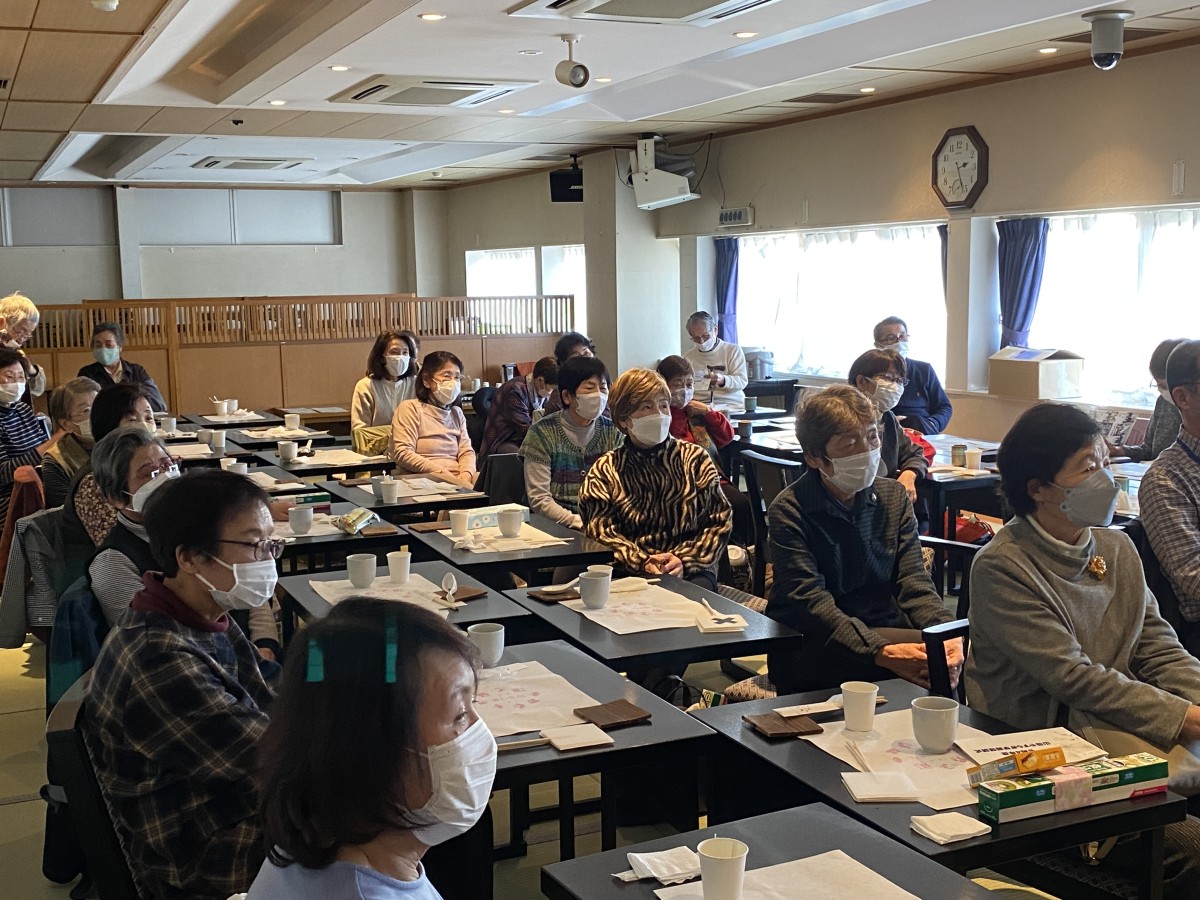 日、今回はセンターで集合、武道館の駐車場から参加者30名を乗せたバスは会場の「大津温泉おふろcafeびわこ座」に向かいました。閉講式はセンター長のあいさつで始まり、今年度ご尽力頂いた運営委員の方々への感謝の後、楽しい食事会が始まりました。そこここから笑顔やにぎやかな会話の声を聞きながら舌鼓を打つ様子は、コロナ禍の影響が少しづつ緩和されていくのを感じました。その後は第7講座は「お楽しみ講座」まずは懐かしい歌謡曲に合わせて手足をのばしたり、立ったままその場で足踏みをしたりと、食後の運動をしました。20分を経過するころには、額に汗がにじんでくる様子が見られました。体操の後は豪華景品が当たる〇✕クイズやじゃんけん大会で大盛り上がり!景品をもらって席に戻る際には周りから拍手が起こっていました。時間はあっという間に過ぎ、来年度また元気な顔で会えるのを楽しみにしています。皆さんお疲れさまでした。