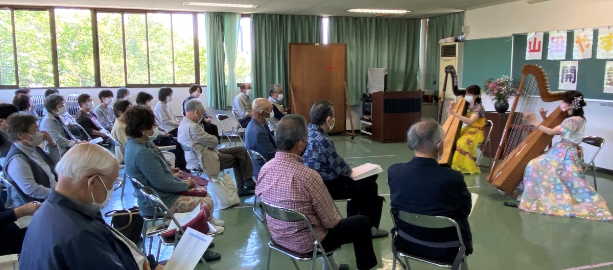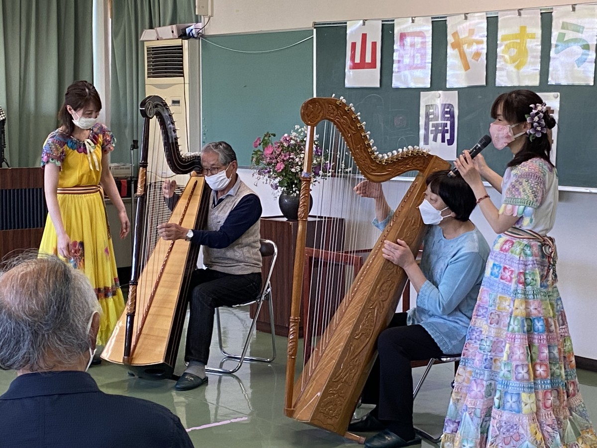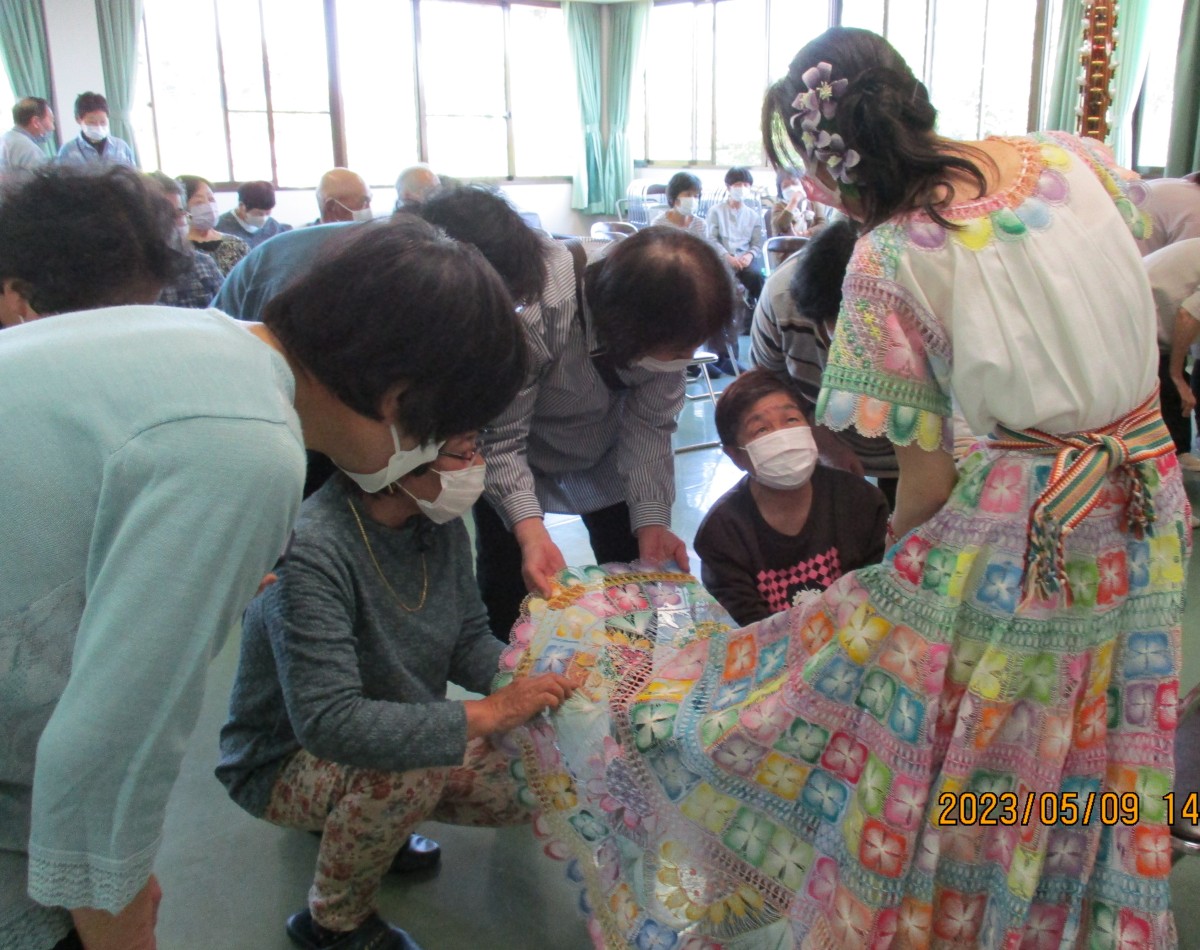 第1講座は今年もsnowdropさんによる南米パラグアイの楽器、アルパの演奏会でした。楽器の音色を活かすために作られたラテンアメリカ調の曲や、お琴での演奏をイメージするように「さくら」を演奏されました。その後懐かしい歌謡曲や唱歌・季節の歌のメドレーなどが続きました。昨年はコロナの影響で曲に合わせて歌ったり出来ませんでしたが、今年はみんなで歌うことができました。また、楽器や衣装に触れたりと新しい体験ができました。特に衣装は女性陣に人気があり、「すごく手の込んだ衣装やね!」「見た目より薄いね~」など講師の方の周りには人だかりができていました。