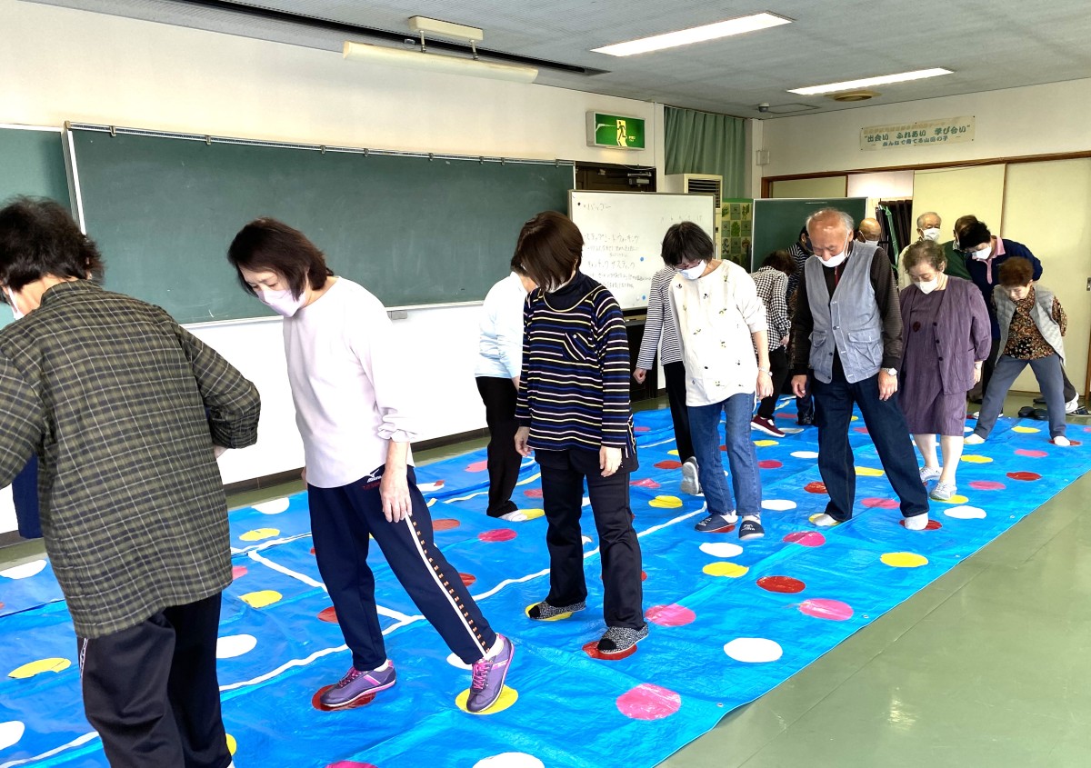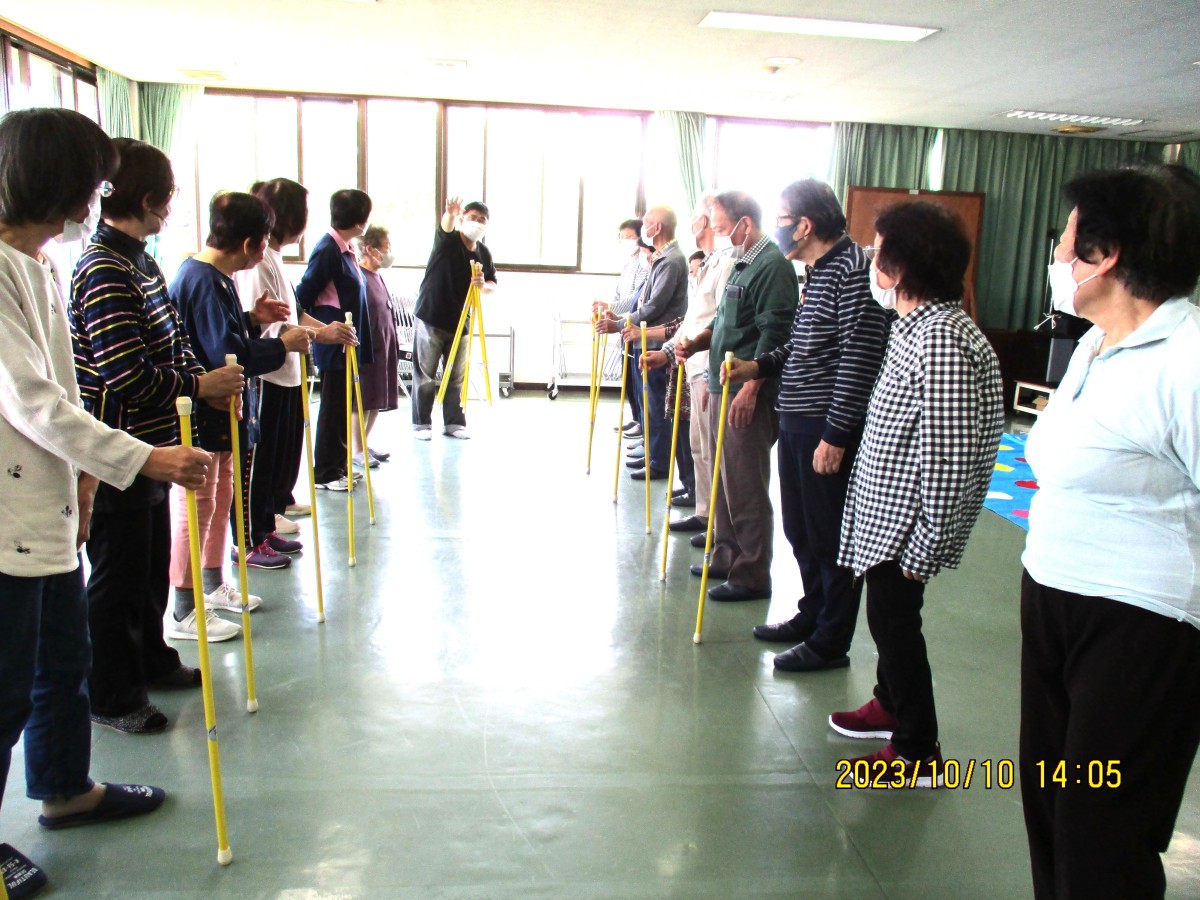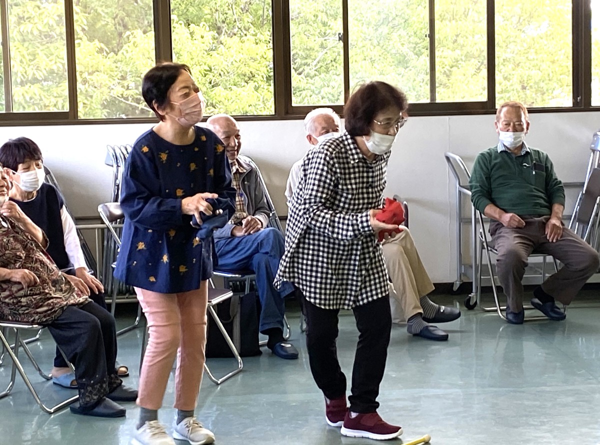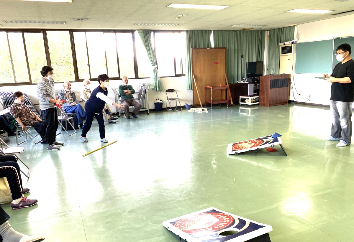 準備体操の後は『キャッチング・ザ・スティック』です。10人が横一列に並び合図で人は位置を変えながら、スティックを倒さずにその場に残し、何回受け渡しできるかを競います。最初はスティックを持ったまま動いてしまったり、手を離すタイミングも難しかったようですが、皆さんあれこれ言いながら、ワイワイと楽しんでいました。その後、音楽に合わせて色のついた円の上を歩いていく『ステップシートウオーキング』や輪投げのような『バッゴー』を体験しました。『バッゴー』は皆さん上手で「これ、楽しいわ!」と好評でした。