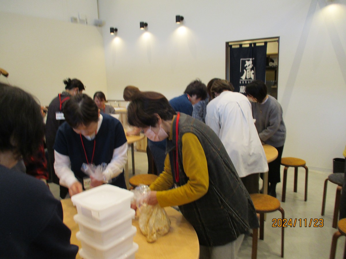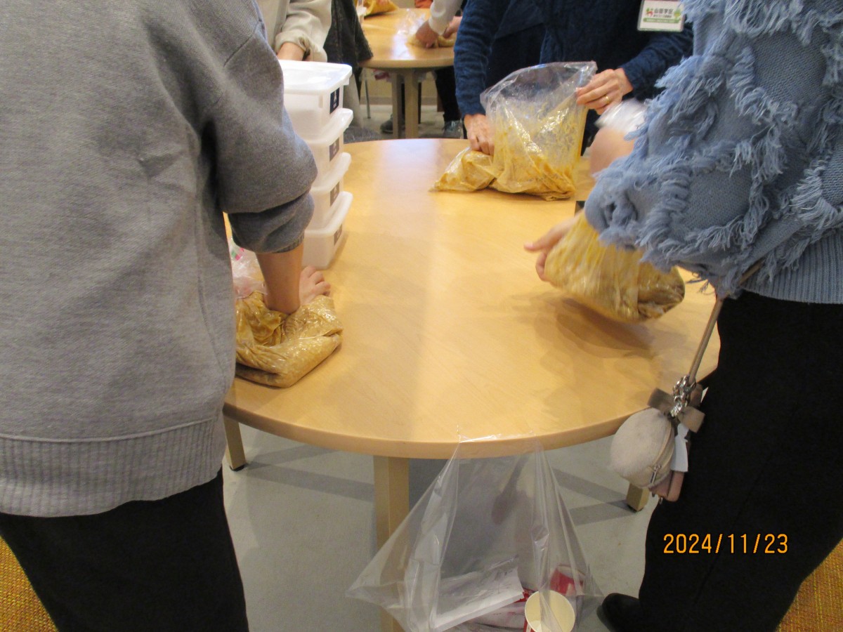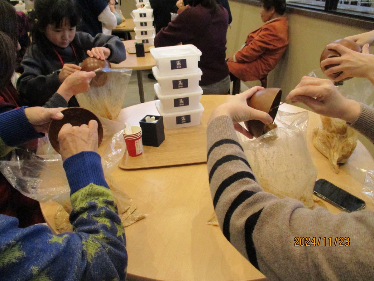 昼からは、味噌専門店「蔵乃屋」さんで、担当スタッフの方から味噌に関する種類等の説明をしていただきました。この説明により味噌作り(蒸かした大豆、米こうじ、塩、種みそをしっかり混ぜて作る)に一層興味が湧き、楽しくなったのではないかと思います。大豆をつぶすところから、工程毎にその都度味見をしながら、参加者同士楽しそうに感想を言い合っていました。微生物が多く含まれる種みそを混合することで、発酵して美味しい味噌になるそうです。出来上がりの4か月後が楽しみですね!熟成して美味しくなぁれ!
