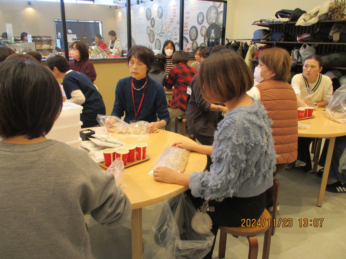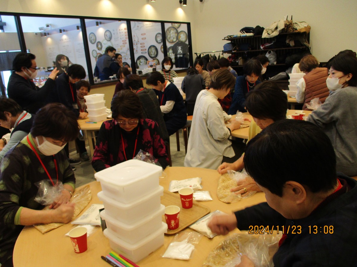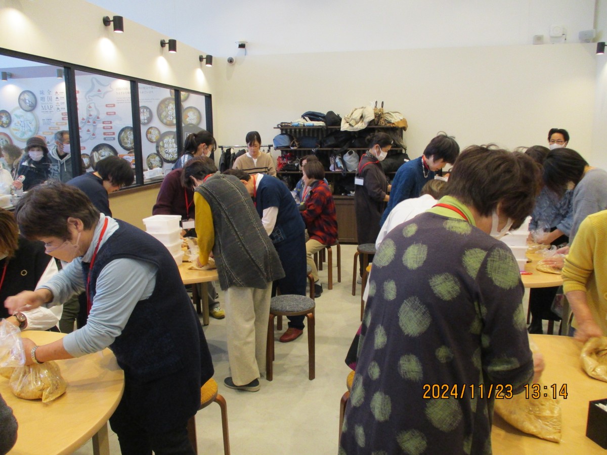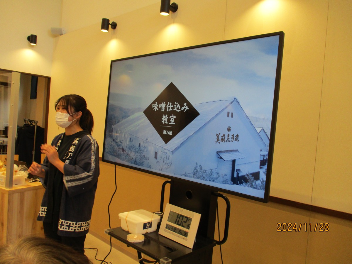昼からは、味噌専門店「蔵乃屋」さんで、担当スタッフの方から味噌に関する種類等の説明をしていただきました。この説明により味噌作り(蒸かした大豆、米こうじ、塩、種みそをしっかり混ぜて作る)に一層興味が湧き、楽しくなったのではないかと思います。大豆をつぶすところから、工程毎にその都度味見をしながら、参加者同士楽しそうに感想を言い合っていました。微生物が多く含まれる種みそを混合することで、発酵して美味しい味噌になるそうです。出来上がりの4か月後が楽しみですね!熟成して美味しくなぁれ!