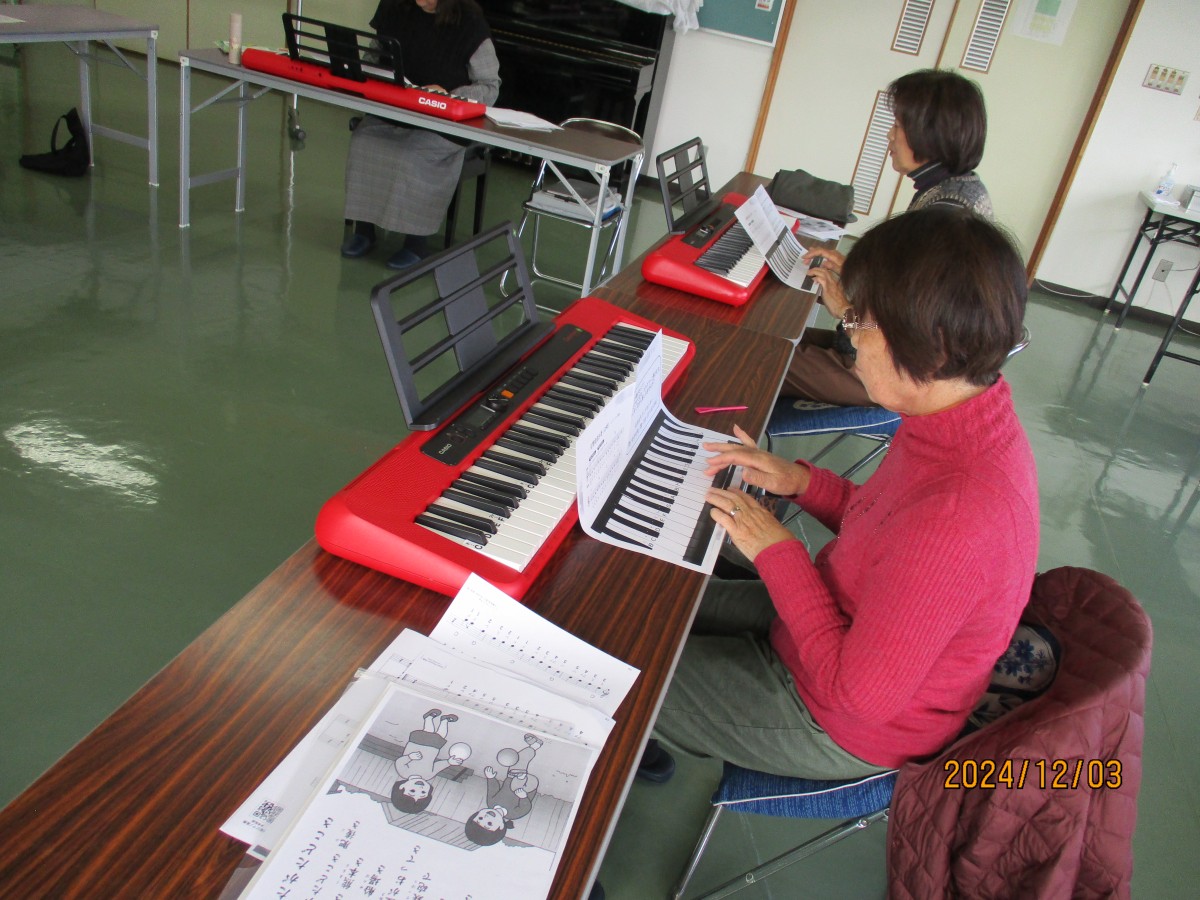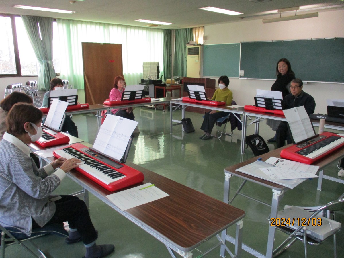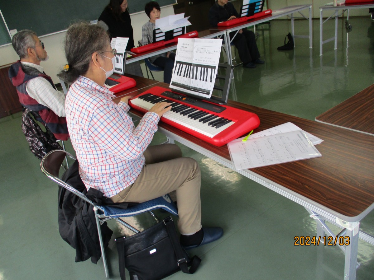 10月1日に「大人ピアノ体験講座」を開催しましたところ、全員の参加者から再度開催のお声をいただき、12月3日に「大人ピアノ体験講座Ⅱ」を実施しました。前回同様、髙井ゆう子先生を講師としてお招きし、前半の部(初心者の方)・後半の部(前回の参加者、経験者)に分かれ各6名ずつ、ピアノに興味のある方々が集合されました。まず最初は、2コースとも、童謡のメロディに合わせて歌ったり、手をたたいたり、まさに脳トレや指ほぐしからスタートし、次にいよいよキーボードに触れるため、指番号やコードの説明がありました。いずれのコースも約1時間のレッスンで、前半の部では、片手から両手を使って演奏されるまでレベルアップされました。