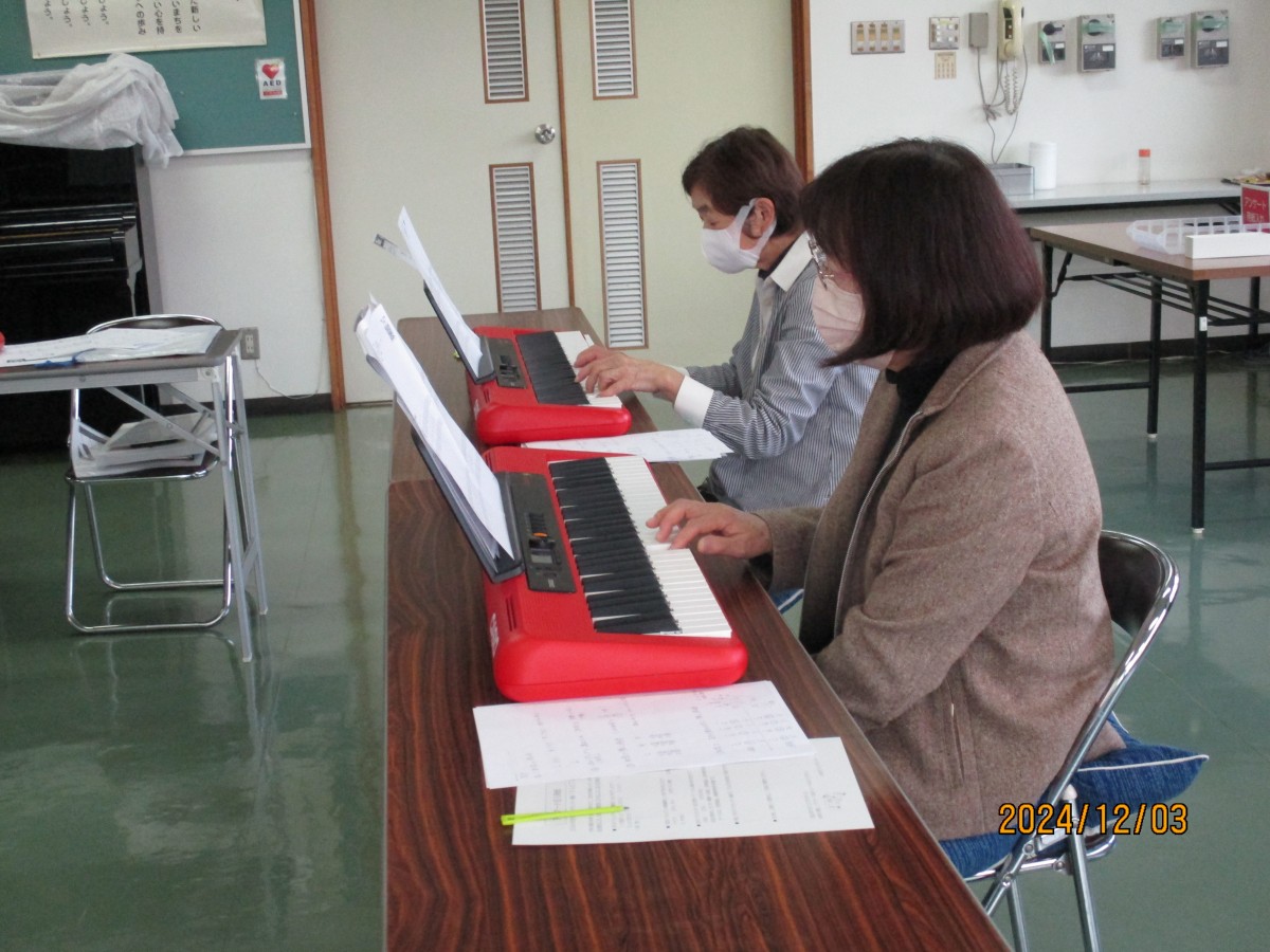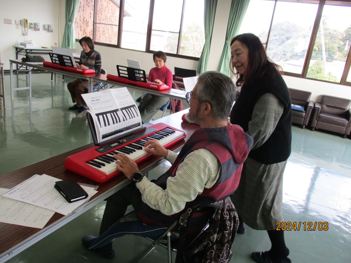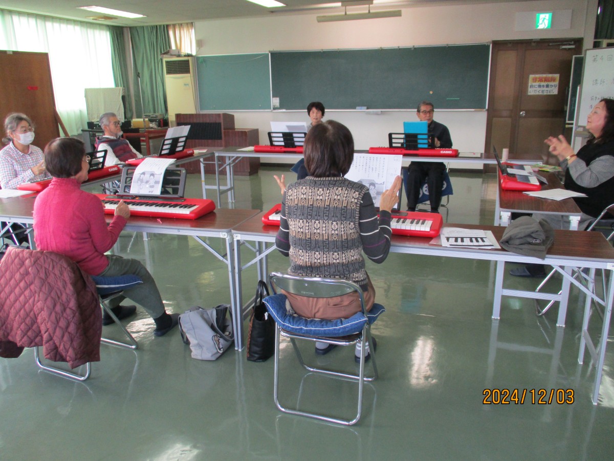 10月1日に「大人ピアノ体験講座」を開催しましたところ、全員の参加者から再度開催のお声をいただき、12月3日に「大人ピアノ体験講座Ⅱ」を実施しました。前回同様、髙井ゆう子先生を講師としてお招きし、前半の部(初心者の方)・後半の部(前回の参加者、経験者)に分かれ各6名ずつ、ピアノに興味のある方々が集合されました。まず最初は、2コースとも、童謡のメロディに合わせて歌ったり、手をたたいたり、まさに脳トレや指ほぐしからスタートし、次にいよいよキーボードに触れるため、指番号やコードの説明がありました。いずれのコースも約1時間のレッスンで、前半の部では、片手から両手を使って演奏されるまでレベルアップされました。