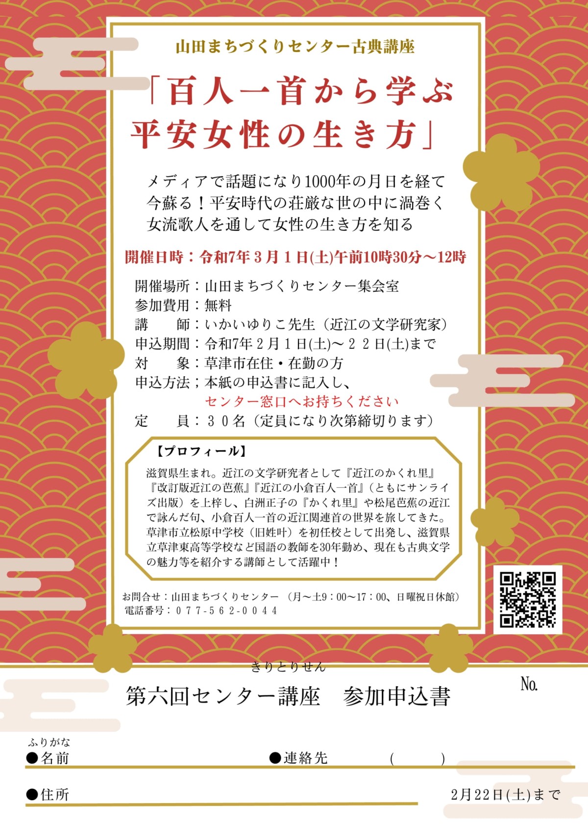 令和6年度の第6回目のセンター講座は、メディアで話題になった平安時代を百人一首の女性歌人を通じて、当時の生き方をわかり易く解説していただき、今なお受け継がれている魅力に迫ります。