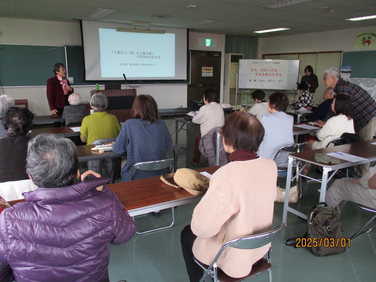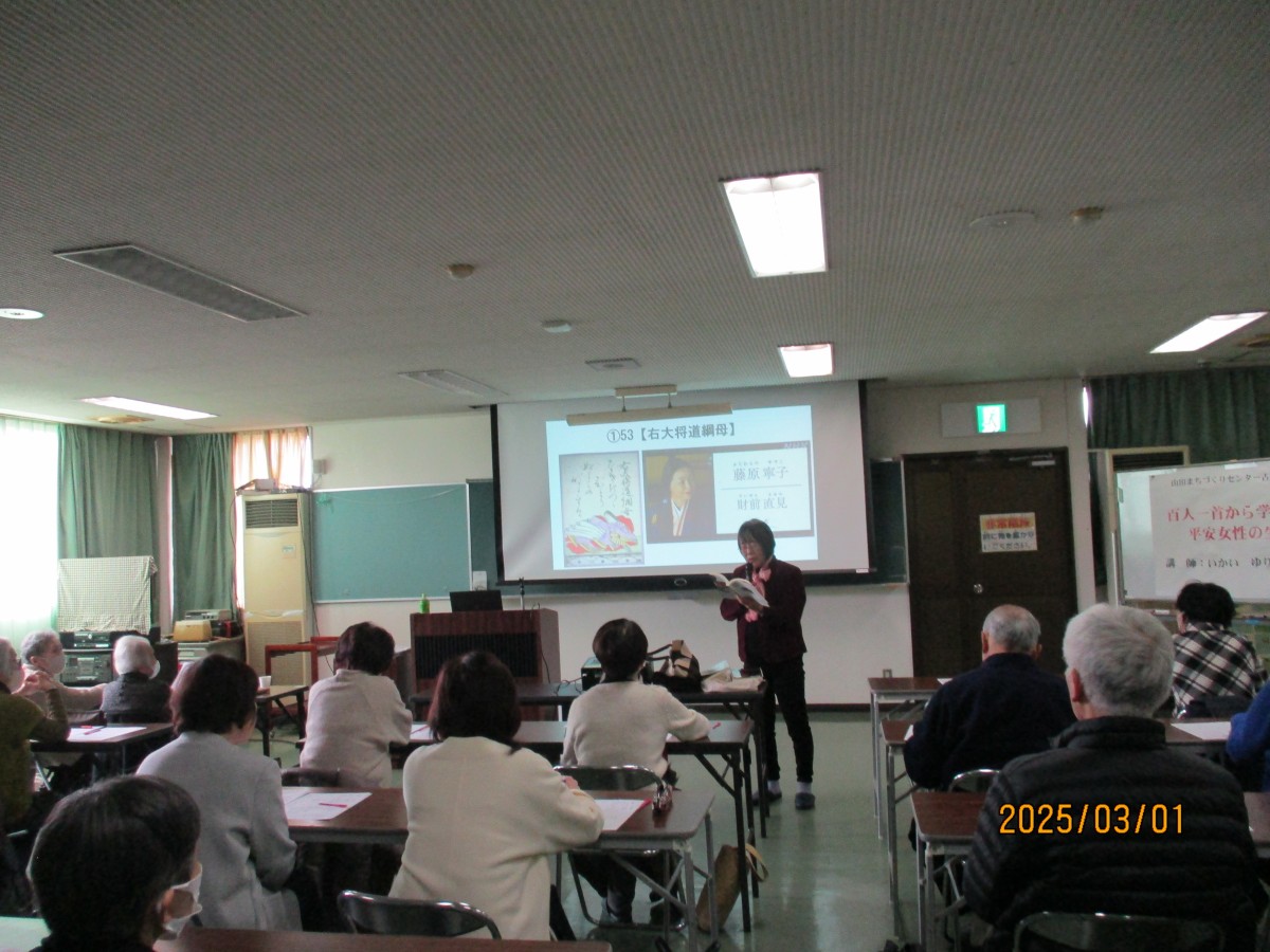 「百人一首から学ぶ平安女性の生き方」について解説をしていただきました。理解しやすいようにドラマで話題となった内容で、登場されていた女流歌人をユーモアを交えてスクリーンで多く紹介され、ドラマでは知りえなかった人間関係等の情報もこの講座を通じて奥深い視点から勉強ができ、難しい古典も身近に感じることができました。