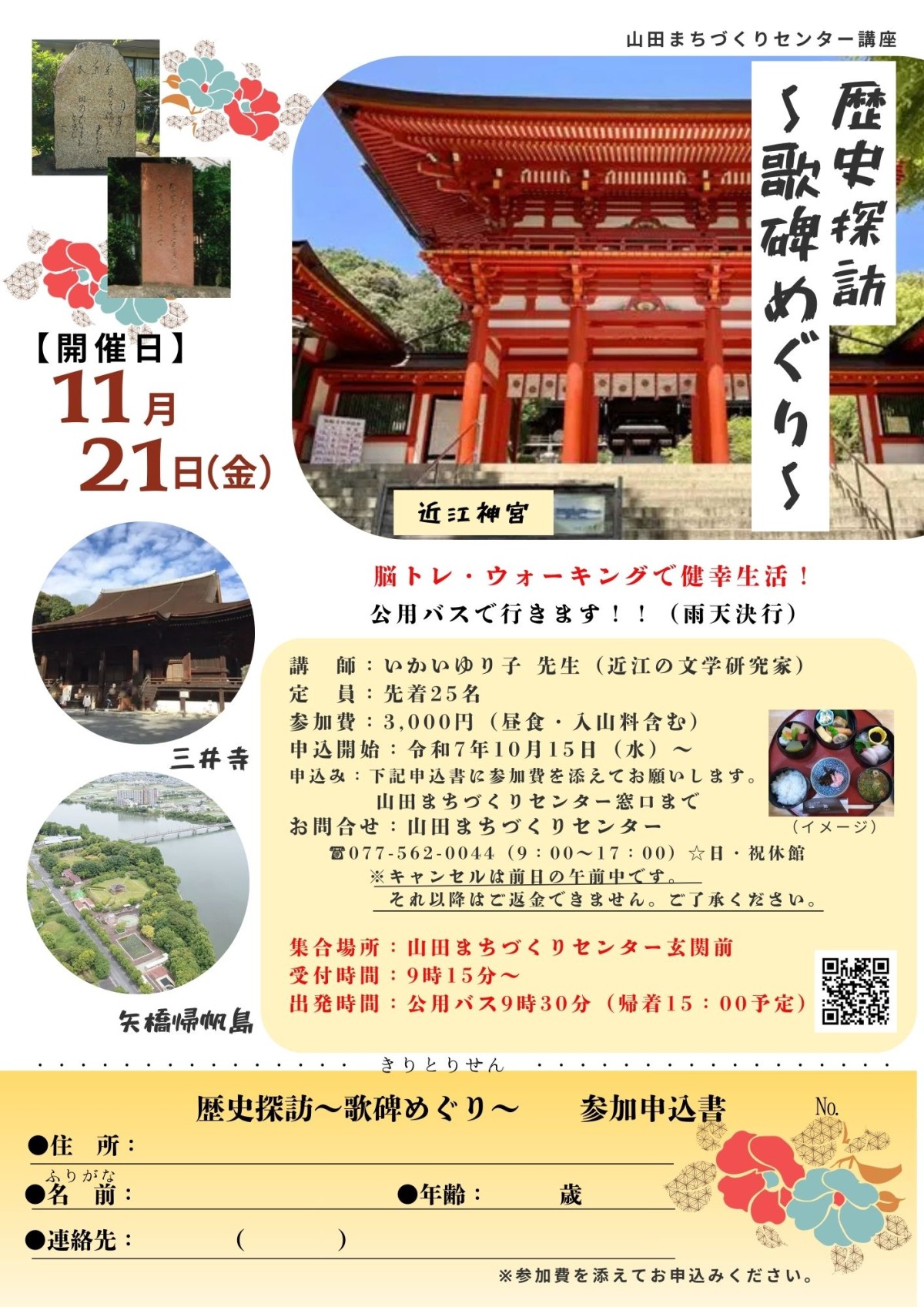 令和7年度第4回山田まちづくりセンター講座を11月21日(金)に開催します。古典に触れる楽しさ、また寺社巡りをすることで脳活・ウォーキングと健康維持も兼ねています。普段なにげなく見落としている場所に、古くからの石碑にきざまれた短歌にふれることは新しい発見になります。公用バスで皆様と行きますのでお気軽にご参加ください。