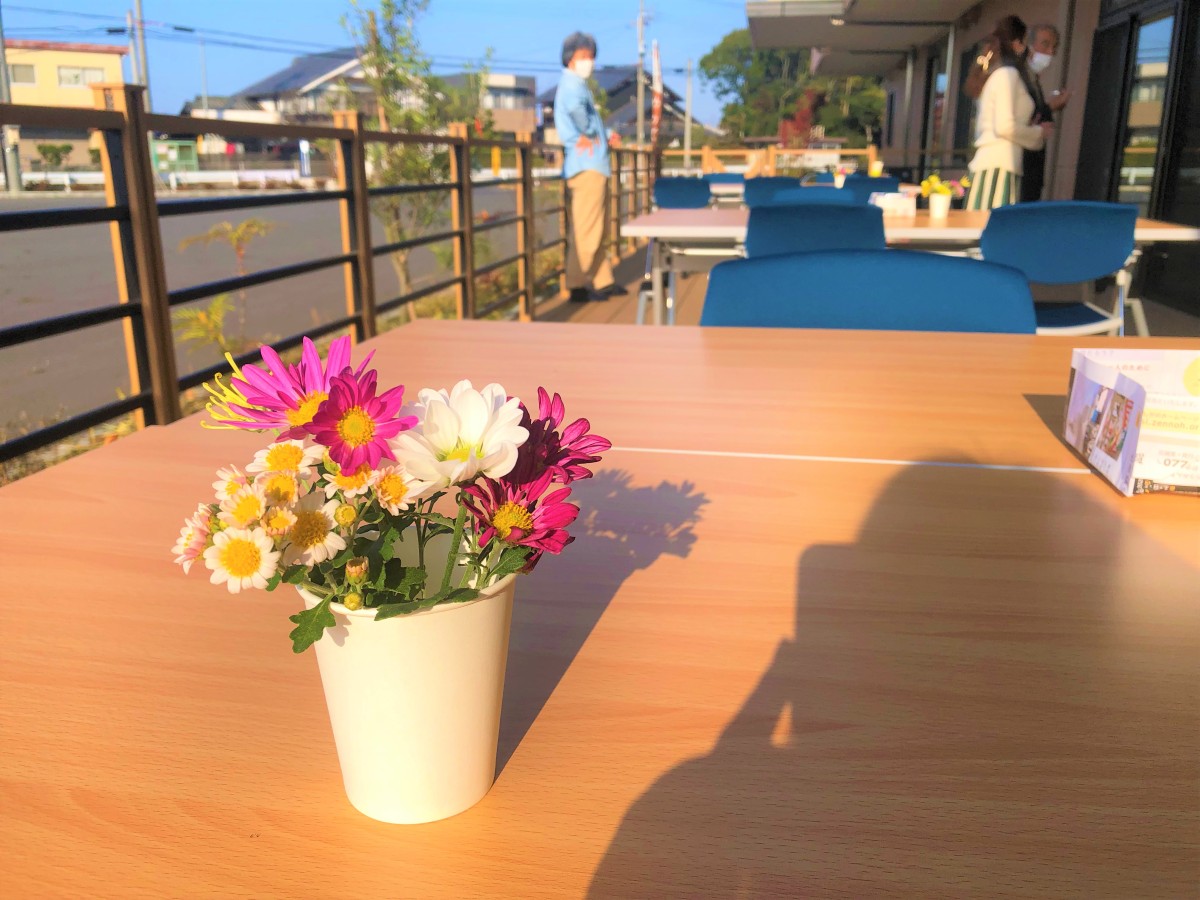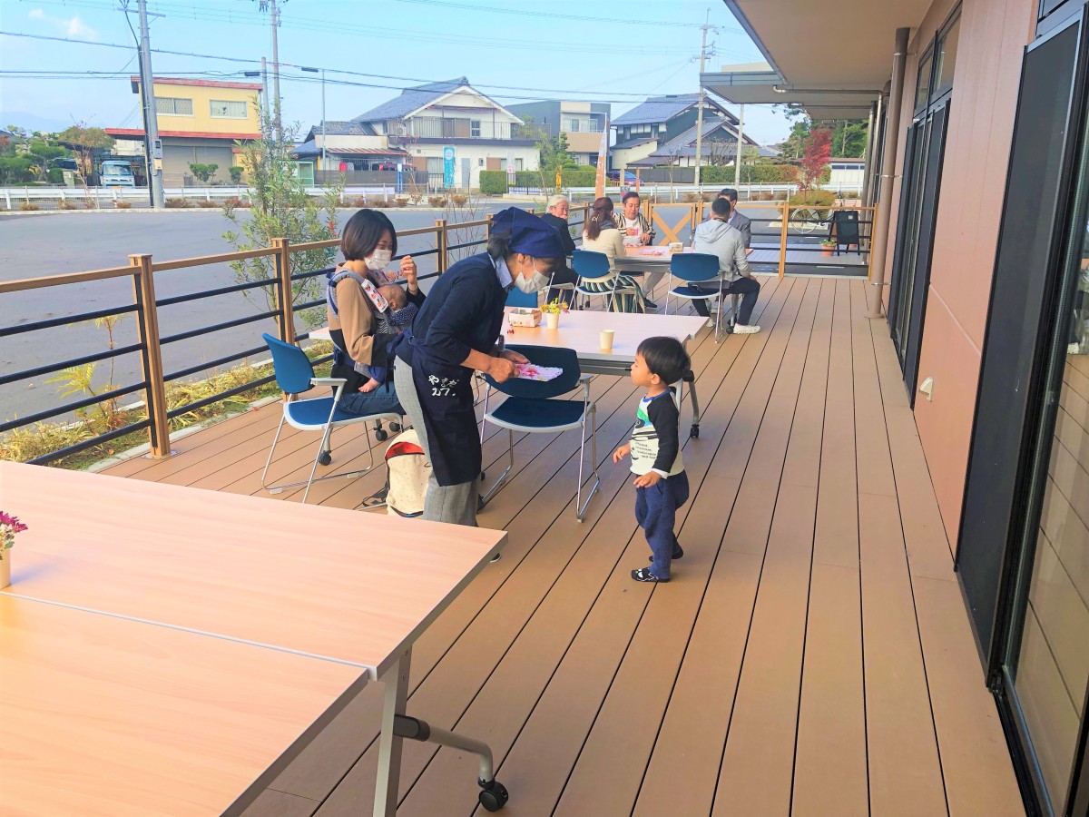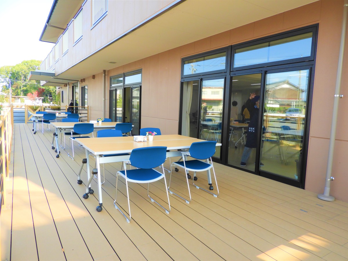 13時よりオープニングセレモニーがあり、たくさんの人で賑わっています。広いデッキを利用したオープンカフェスペースも人気です。