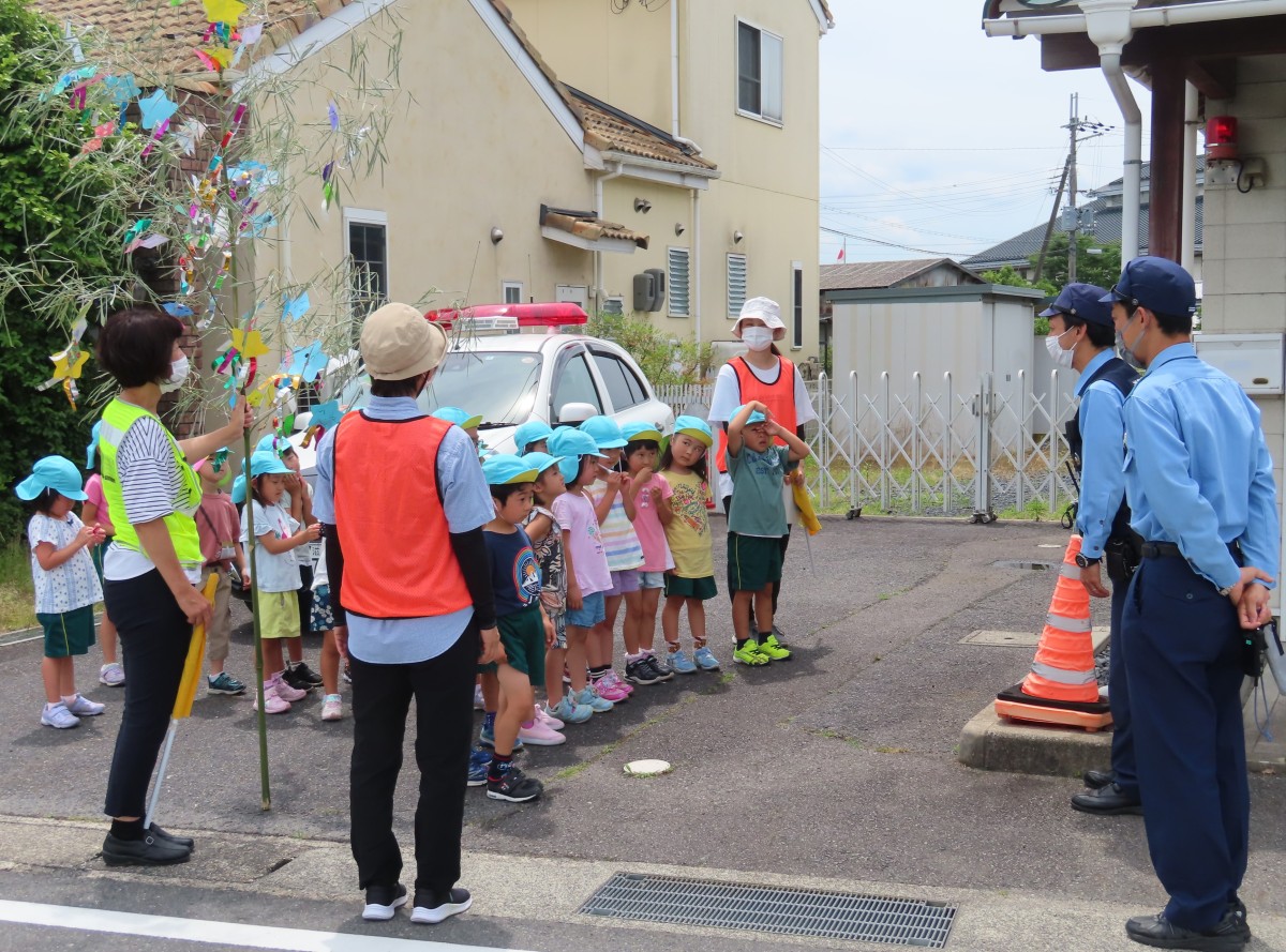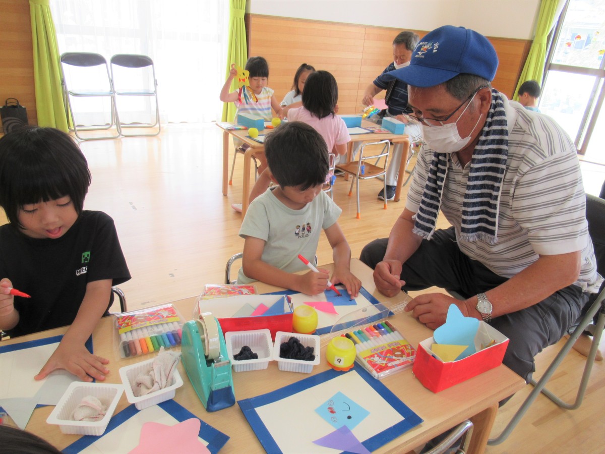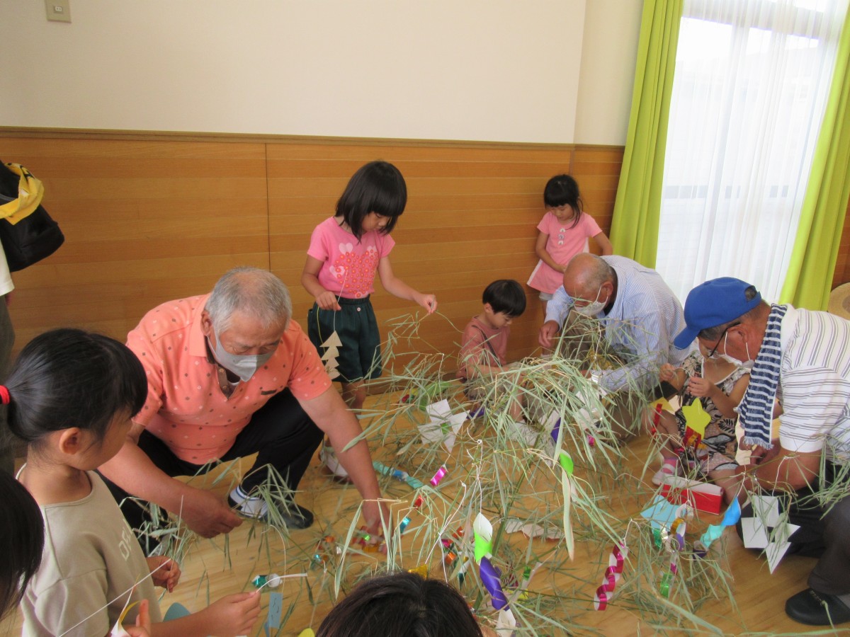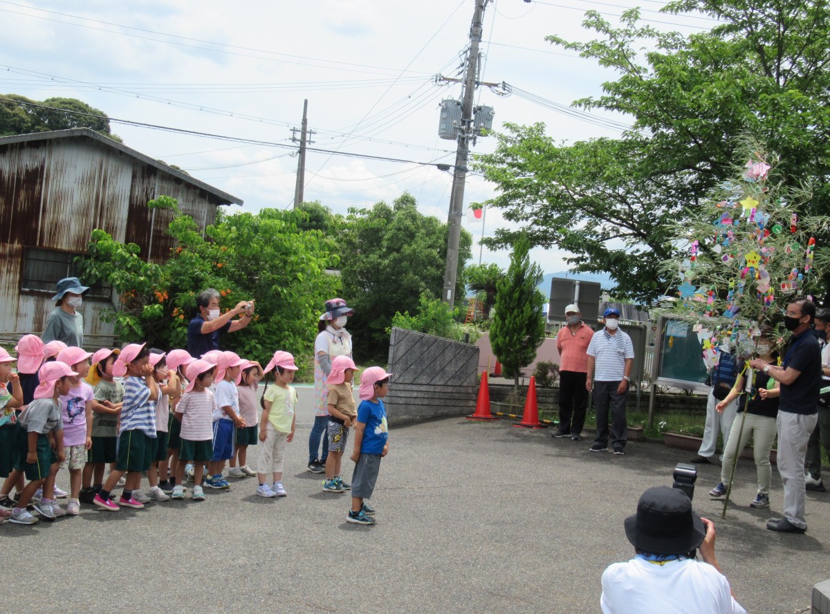 6月27日(月)、山田学区老人クラブの方との『七夕交流会』を実施しました。当日は、5歳児が老人クラブの方と一緒に笹飾りを作ったり、4歳児が完成した笹飾りを老人クラブの方と一緒に山田まちづくりセンターへ届けたりしました。その他にも、3歳児・4歳児・5歳児がそれぞれ歌を披露したり、一緒に手遊びを楽しんだりと、盛りだくさんの七夕交流会。老人クラブの方や友だちと七夕飾りを一緒に作ることを楽しむだけでなく、地域の方の温かな見守りに感謝の気持ちを込めて笹送りができました。
