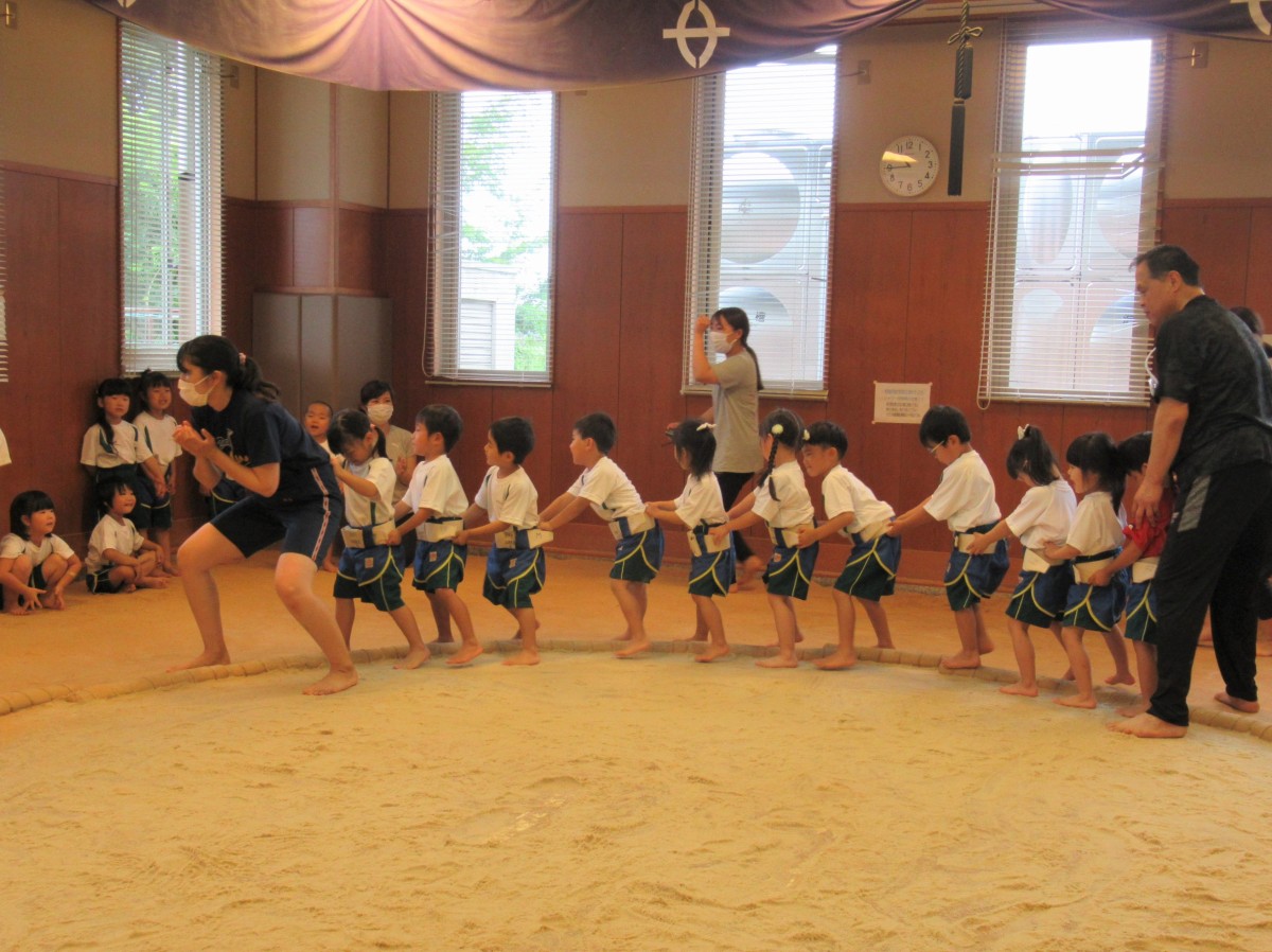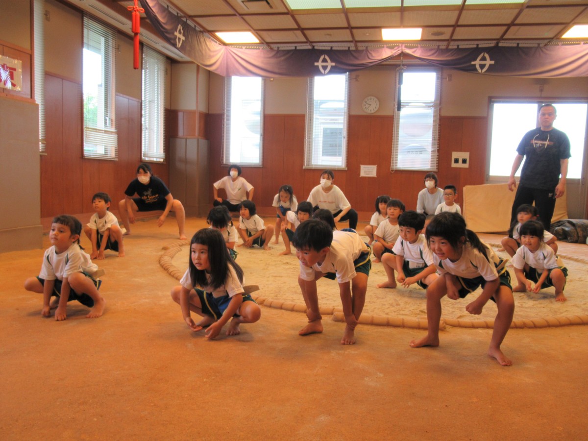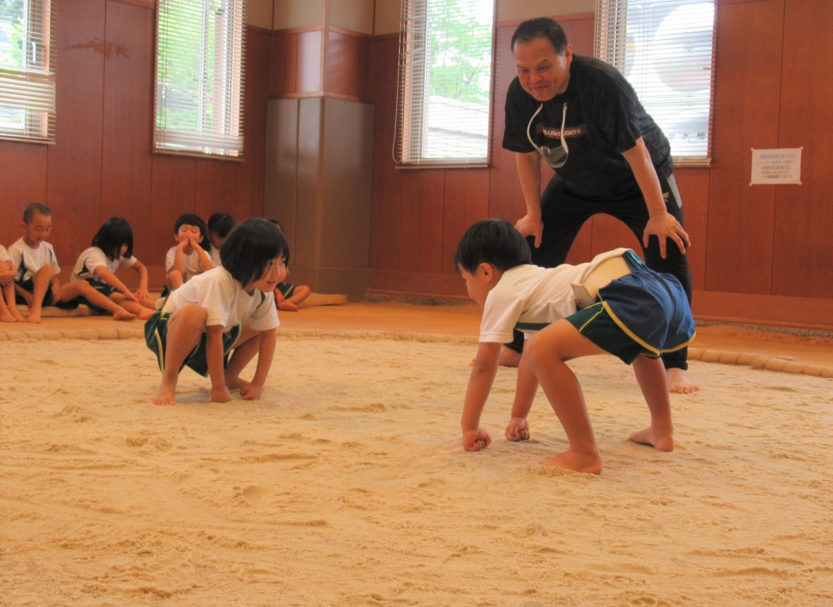 山田こども園では、子どもたちに「しなやかな心と体を育む」ことをねらいとして、相撲体験に平成25年度より継続して取り組んでいます。今年度も、草津市立武道館の相撲場をお借りし、元大相撲力士の方や大学相撲部の方を招いて、4歳児・5歳児を対象に年間6回の相撲体験を実施しています。