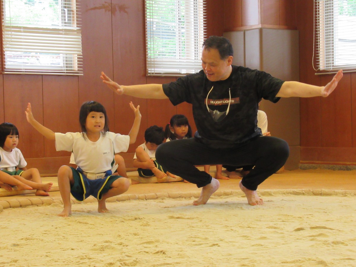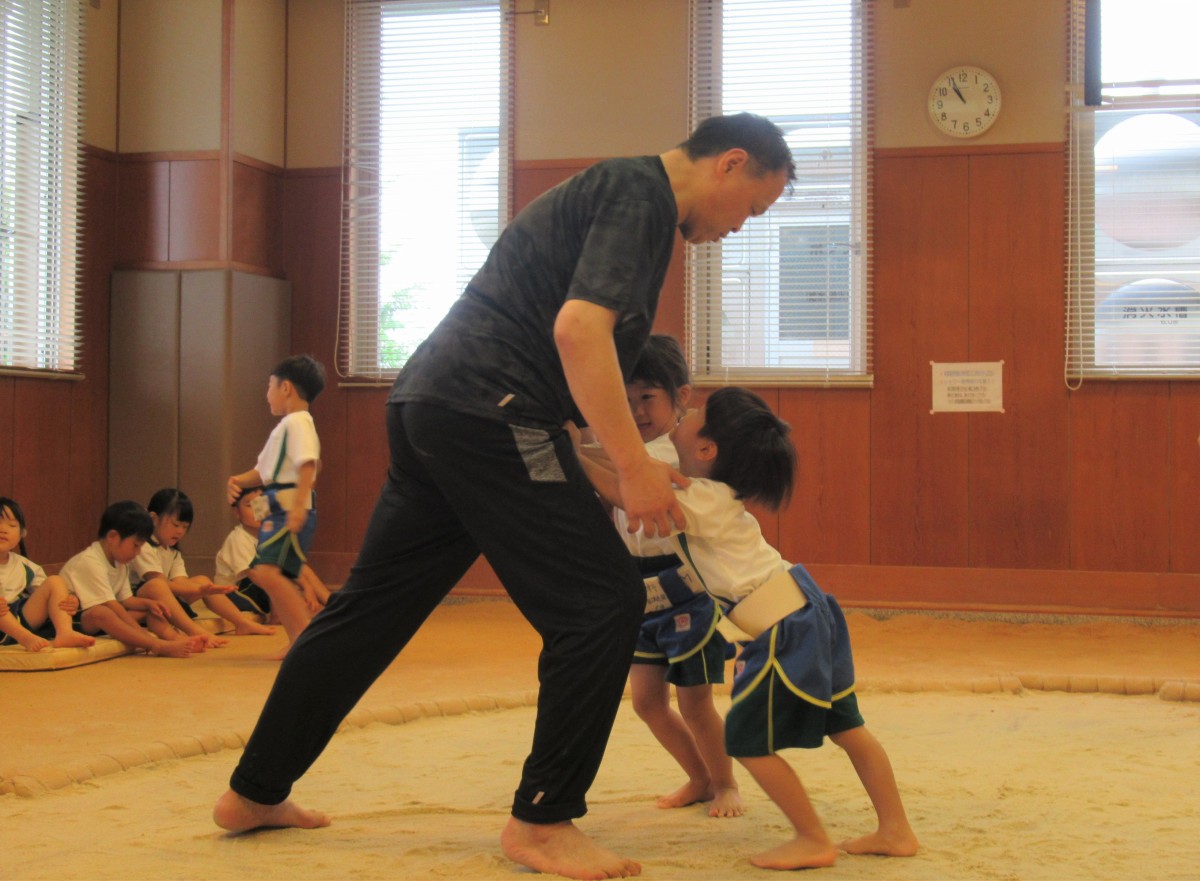 7月4日(月)、今年度2回目となる相撲体験では、前回に引き続き、元大相撲力士の横江英樹さんを講師にお招きし、素足で相撲体操や様々な相撲の動きを体験しました。横江さんの力強さやほんものの相撲に触れながら、最後はグループや2人組での取組にも挑戦し、みんな「のこった、のこった!!」と大はりきりでした。