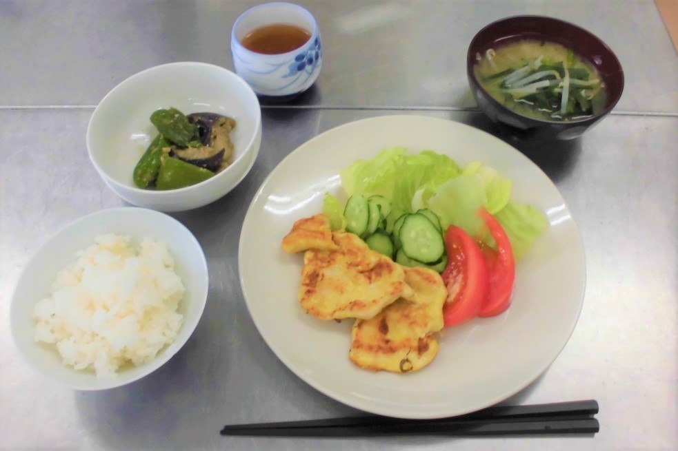 メニューはささ身のピカタ、なべしぎ、ニラともやしのみそ汁です。