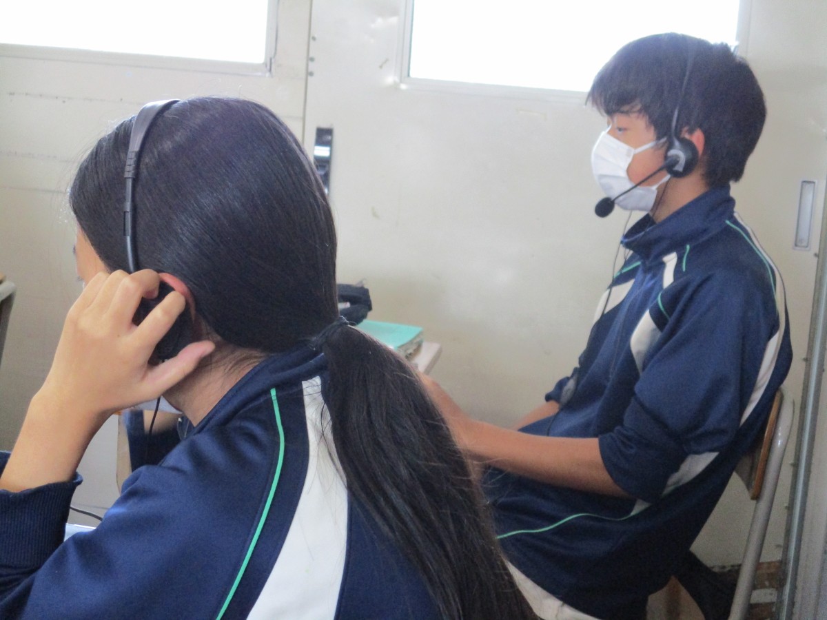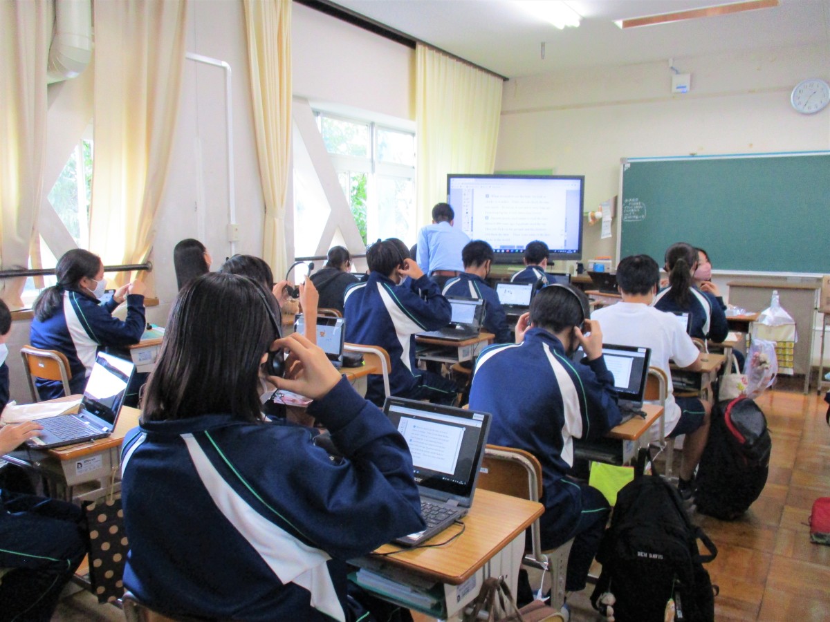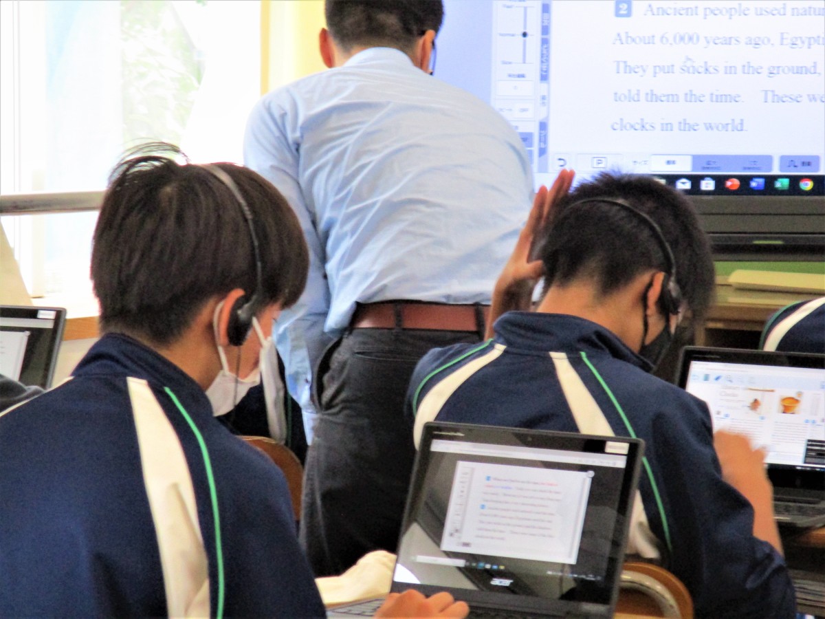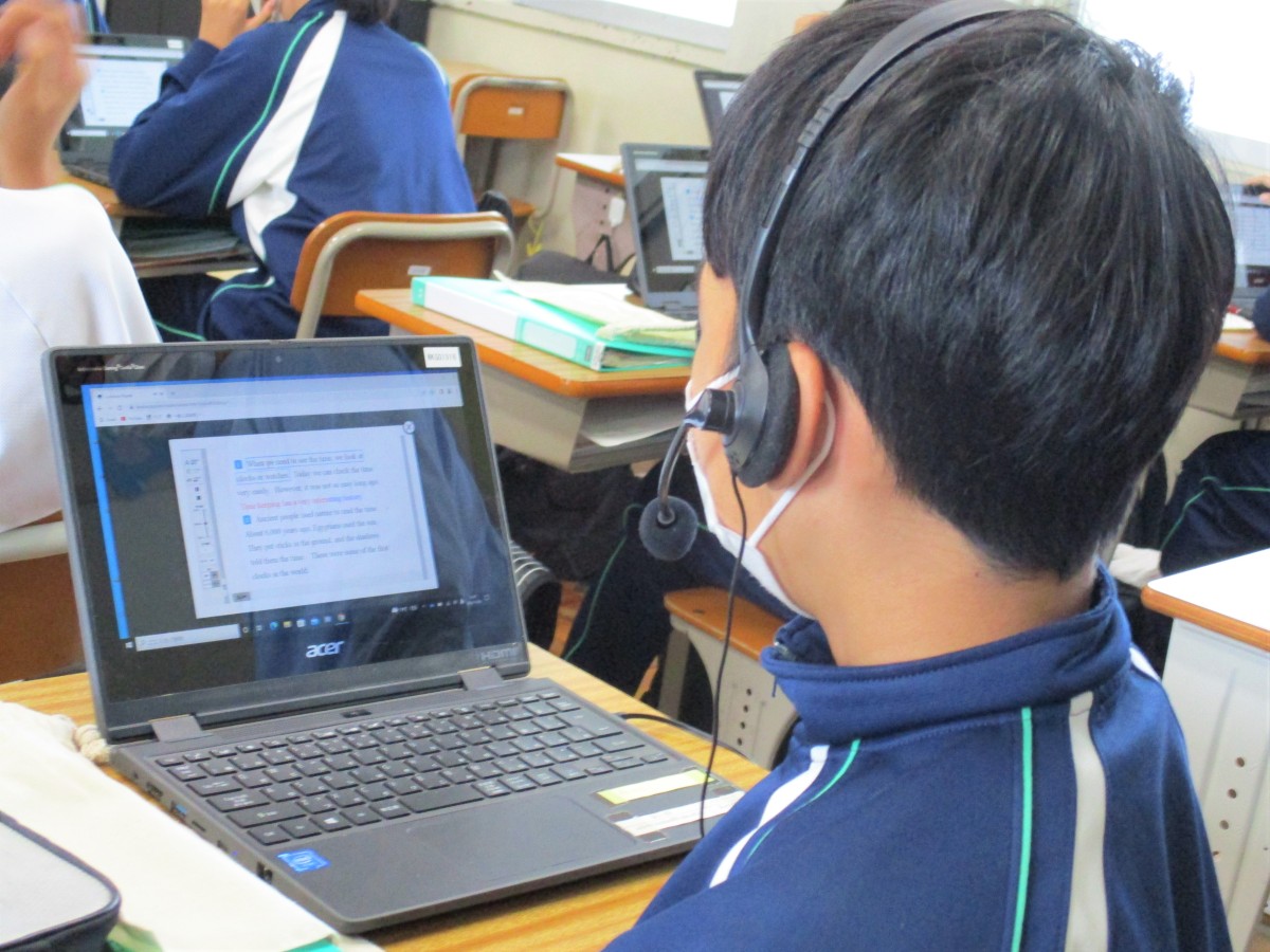 まずは、パソコン内のデジタル教科書を開き、各々がヘッドフォンから自分の好みの音量やスピードで何度も英語を聞き取ります。分からない部分だけをリピートすることもできます。その後の話す練習では、生徒が発音した英文が個人マイクからパソコンに取り込まれ、マイクロソフトによる自動採点システムで瞬時に評価されるという画期的かつ最新の授業でした。