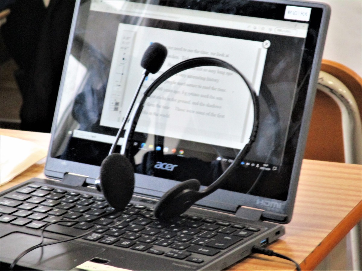 この取り組みは、個々の学習用端末にインストールされたTeamsというツールとヘッドセットマイクを活用した英語科の授業になります。