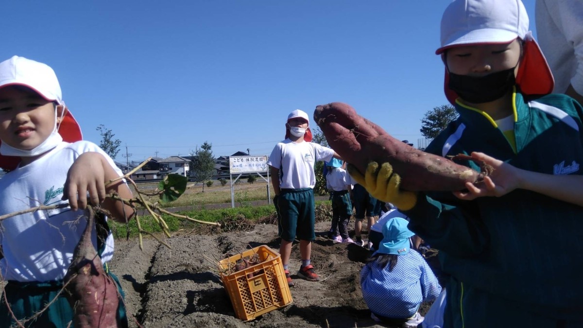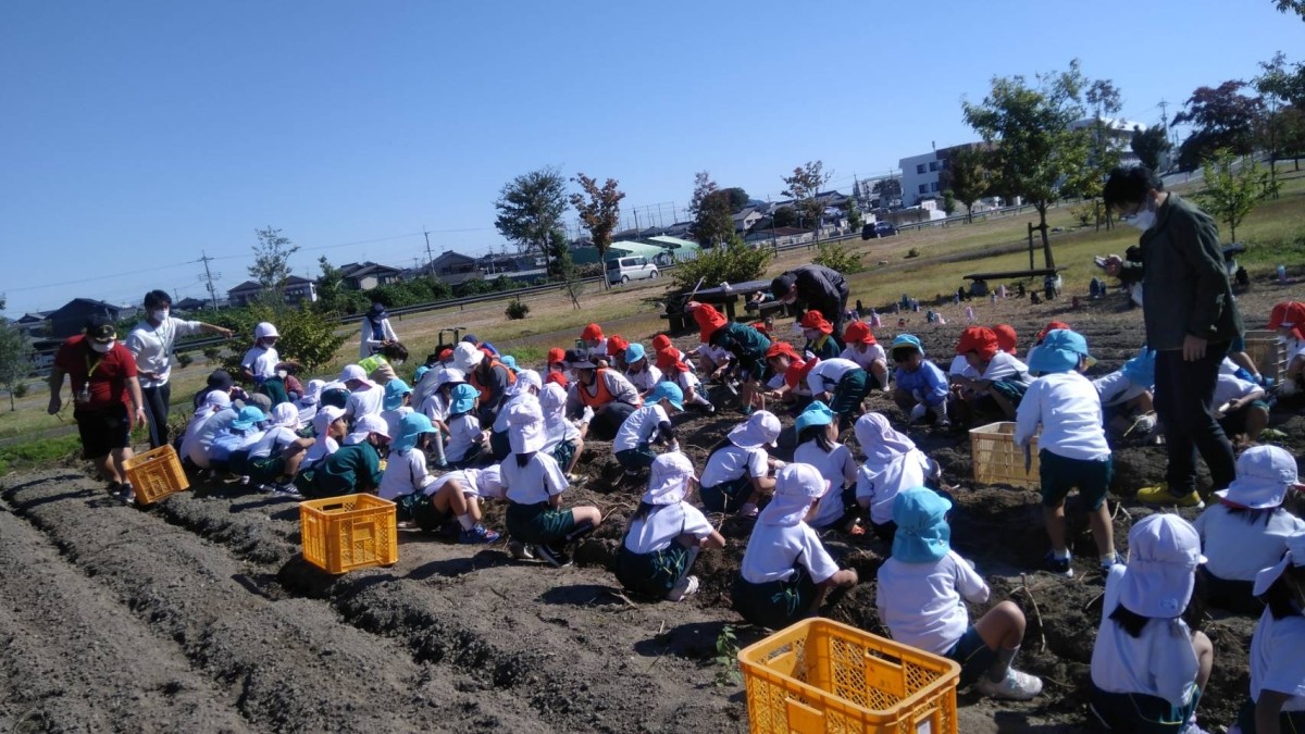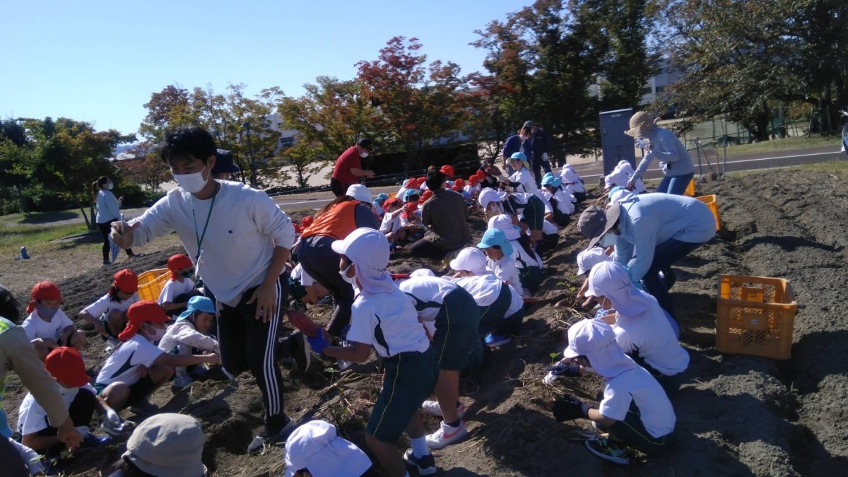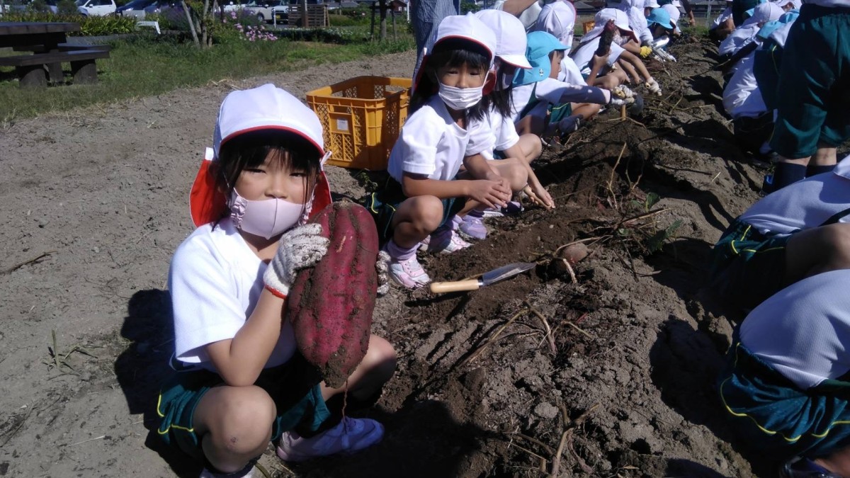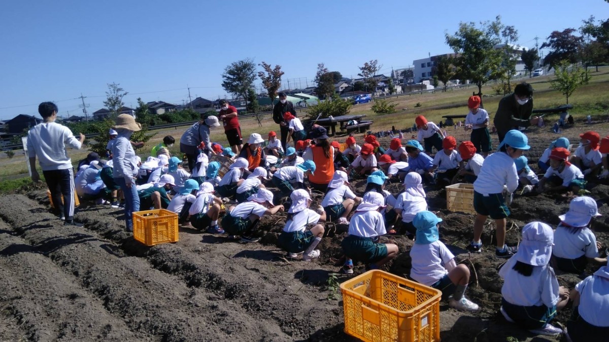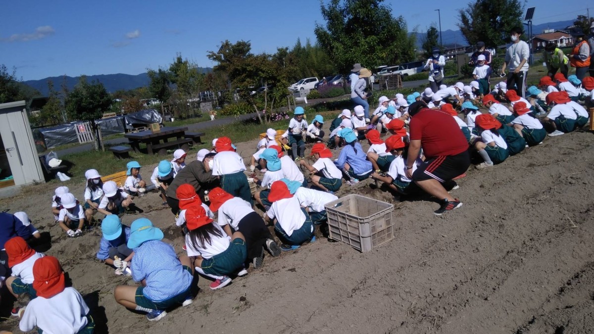 10月20日、山田こども園5歳児と山田小学校2年生、スタッフ、山田こども園・山田小学校教育後援会、更生保護女性会の皆さんの応援にて