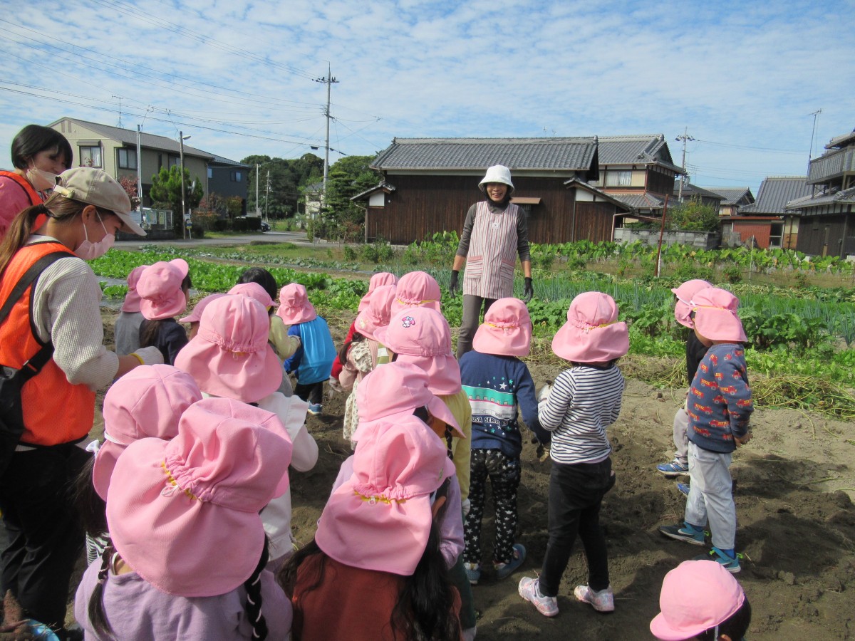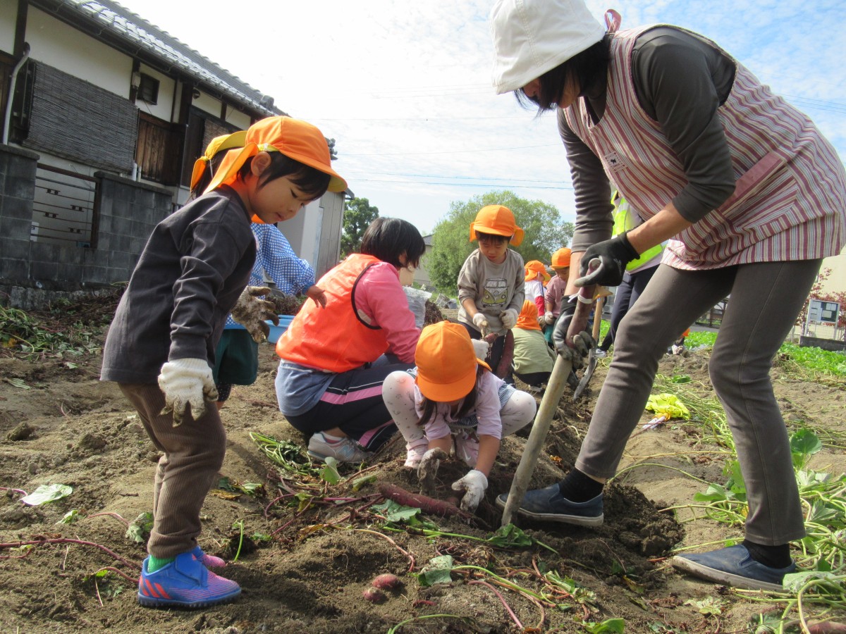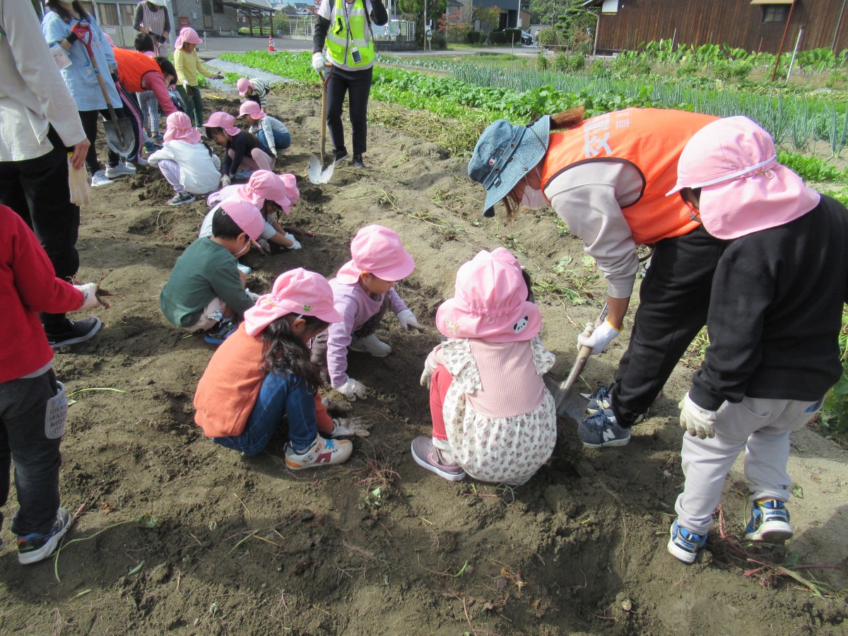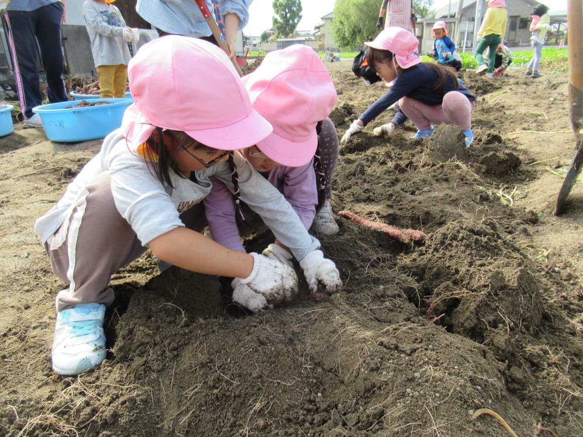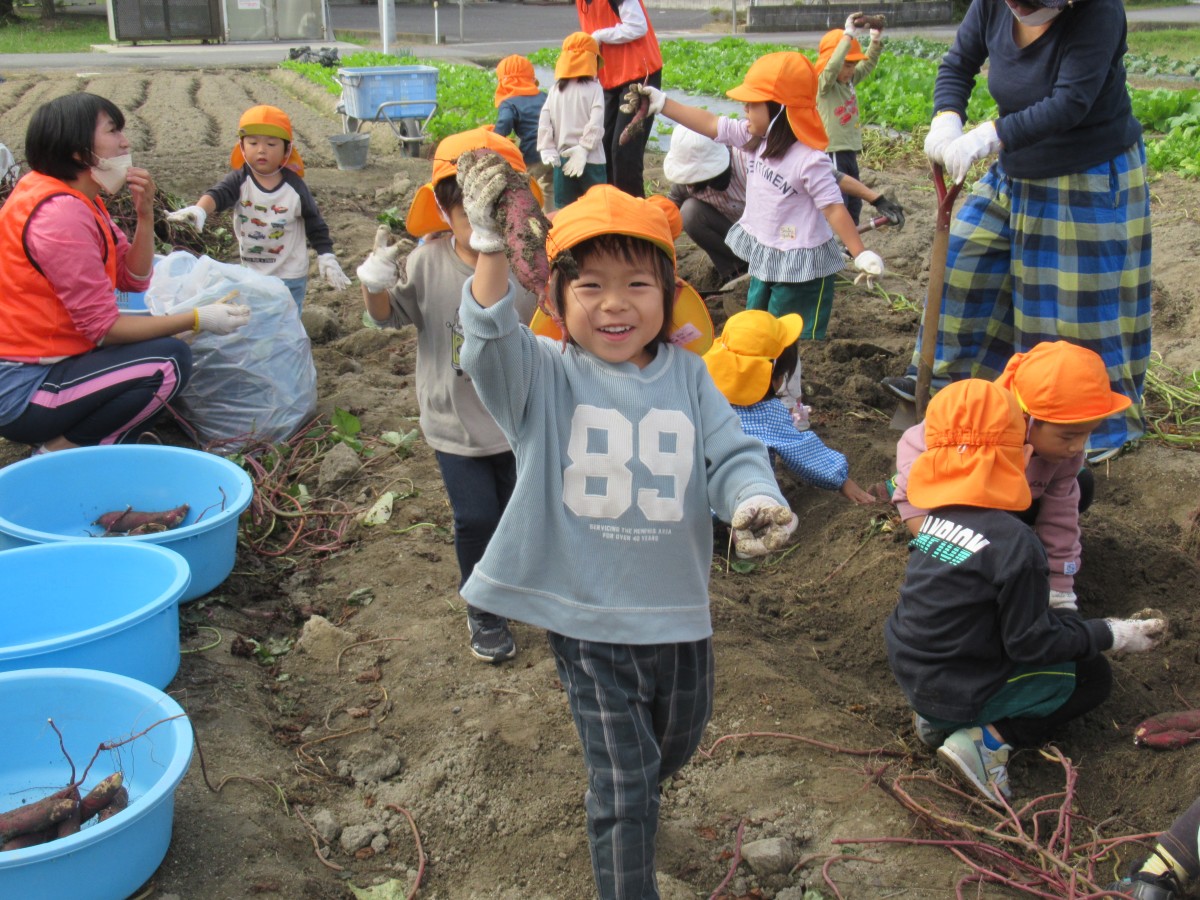 10月21日(金)、山田学区主任児童委員の中瀬清美さんの畑で、3歳児・4歳児がサツマイモ掘りをさせていただきました!園の畑で経験済みの子どもたちは、軍手をはめた両手を一生懸命動かして土をかき分け、次から次へとサツマイモを掘り出していきます。「これは大きいね!」「バナナみたいな形だ!」「小さくてかわいい!」など、収穫したサツマイモ一つひとつに言葉をかけながら嬉しそうに見せ合う子どもたちの笑顔がとっても微笑ましかったです!大量に収穫させていただいたサツマイモは、各家庭に持ち帰ったり、来週行う焼き芋パーティーで食べさせてもらったりと、秋の味覚を楽しんでいきたいと思います。