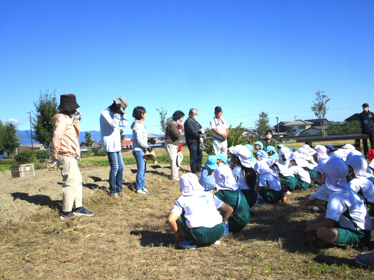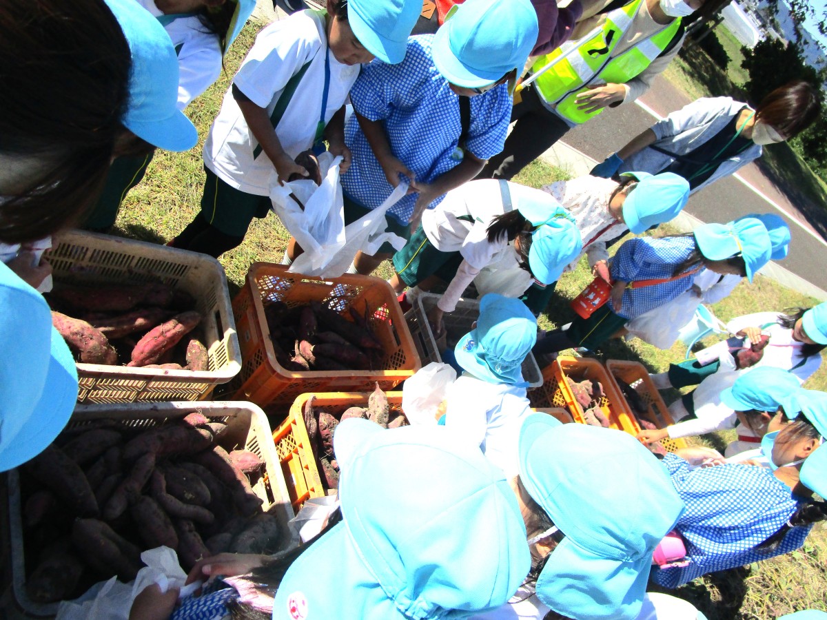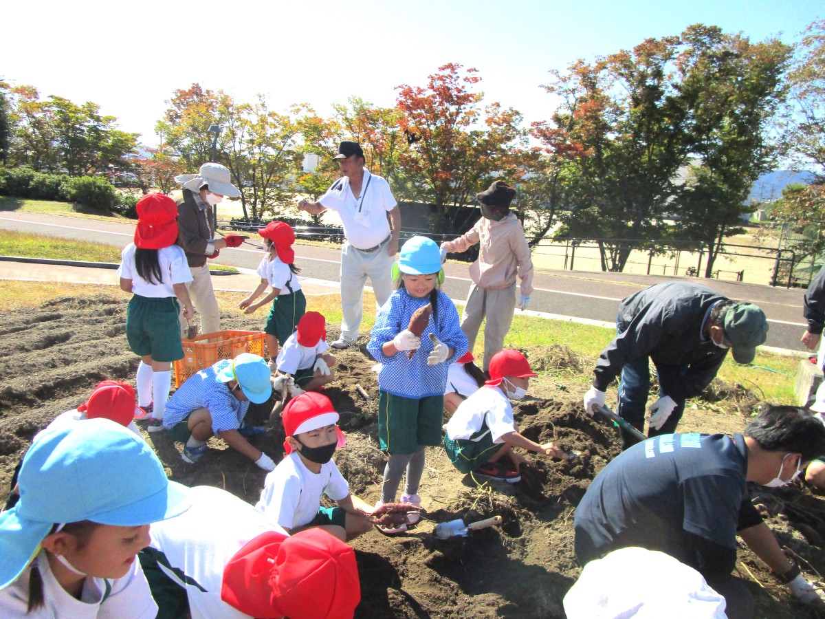 土をかき分けサツマイモの姿を見つけると、目を輝かせて掘り進める子どもたち。たくさんのサツマイモを収穫することができ、秋晴れのai彩広場に子どもたちの大歓声が響き渡りました。お土産にそれぞれサツマイモをいただき、5歳児と1年生は山田園小教育後援会の皆様や応援に来てくださった更生保護女性会の方々にお礼を言って、今年度の交流の幕を閉じました。