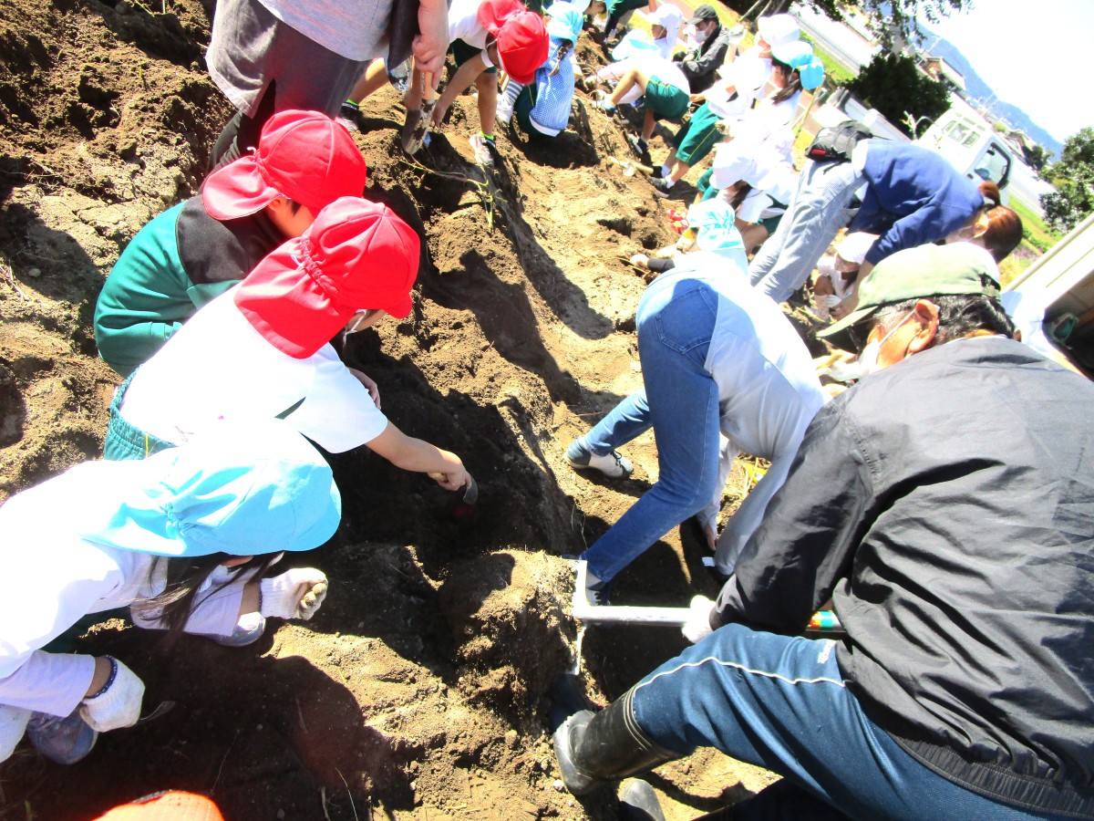 ai彩広場の一角(スクールガーデン)で山田園小教育後援会の皆様と5月に苗植えをし、夏の間もずっと大切に世話をしていただいたサツマイモたちがすくすく大きく育ちました。収穫の時期を迎えた10日20日(木)、山田こども園5歳児と山田小学校1年生の子どもたちが、サツマイモ掘り交流を行いました!