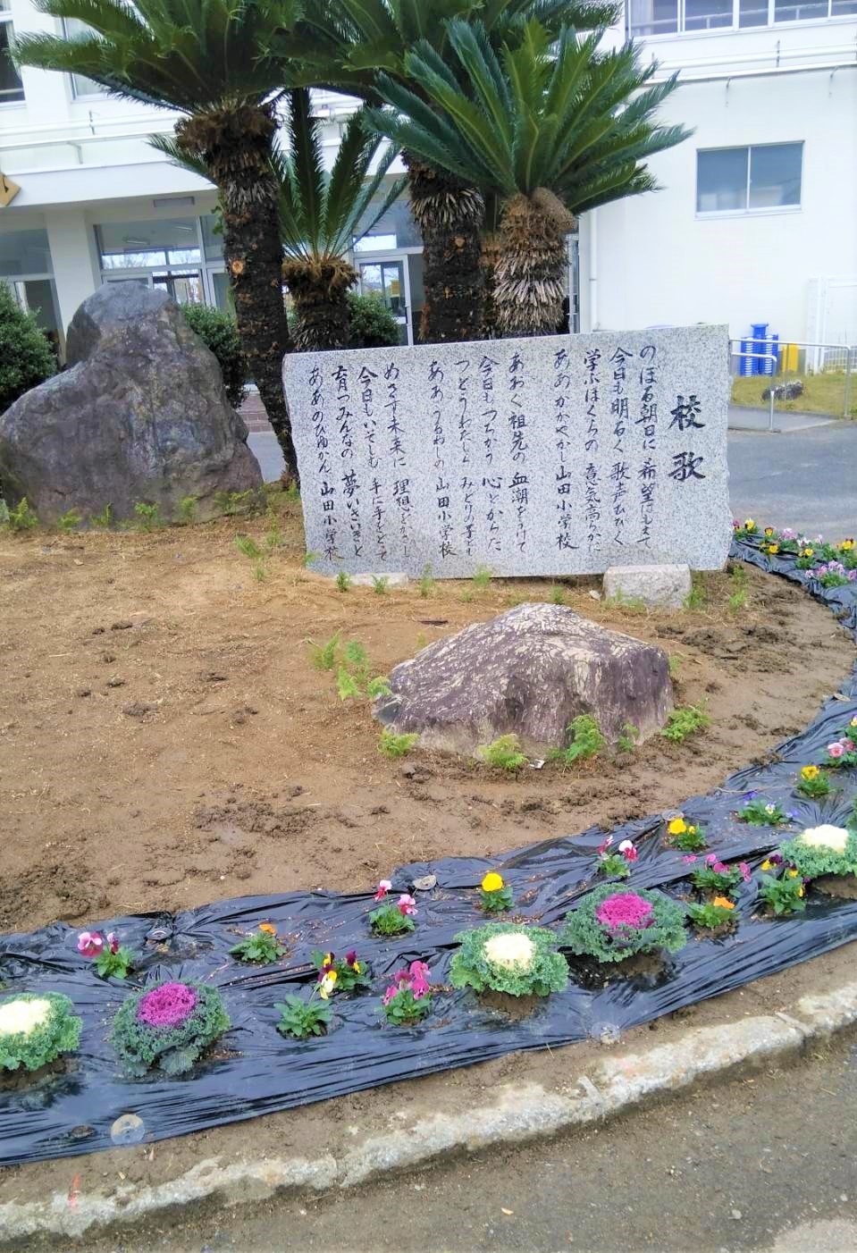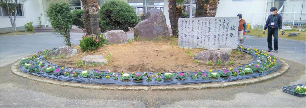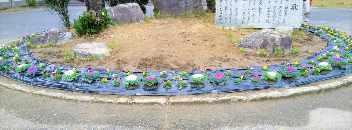 11月22日、山田小学校正面花壇に葉牡丹、パンジーを植えました。