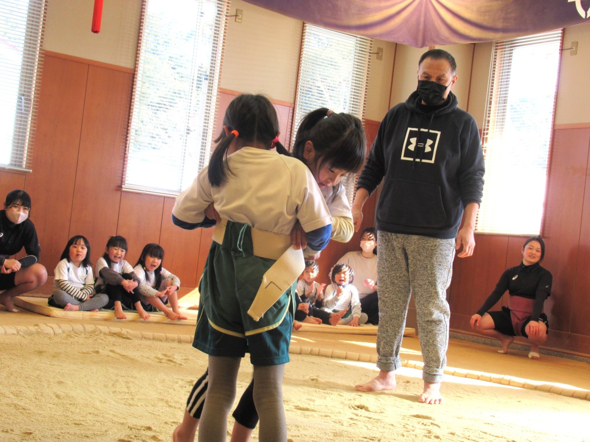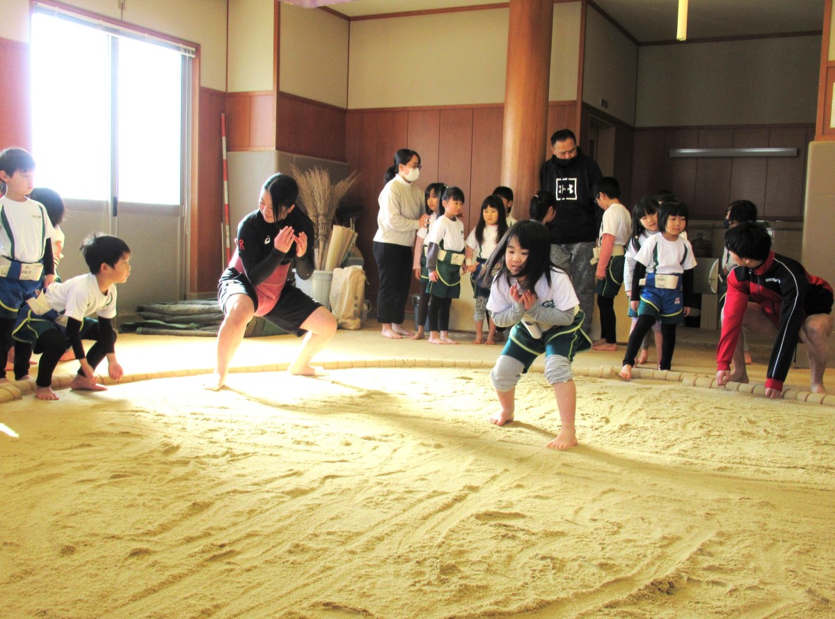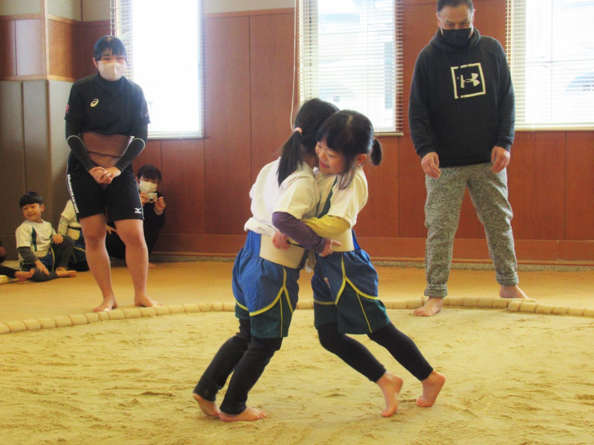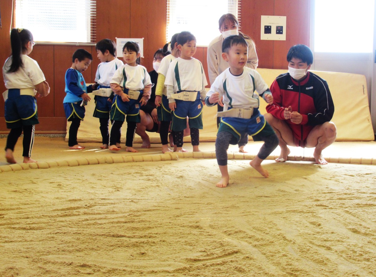 山田こども園では、子どもたちに「しなやかな心と体を育む」ことをねらいとして、相撲体験に平成25年度より継続して取り組んでいます。今年度も、草津市立武道館の相撲場をお借りし、元大相撲力士の方や大学相撲部の方を招いて、4歳児・5歳児を対象に様々な相撲体験を実施してきました。2月9日(木)、今年度7回目となる相撲体験では、年間通して指導いただいている元大相撲力士の横江英樹さんをはじめ、数年前から相撲体験で交流させていただいている立命館大学体育会相撲部のみなさんをお招きしました。相撲部のみなさんによる取組披露をはじめ、基本稽古を一緒にさせてもらうことで、“ほんものの相撲”に触れた子どもたち。最後には横江英樹さんの行司による、東西に分かれての取組も行い、1年間取り組んできた相撲体験の成果を存分に発揮しました。最後まで諦めずに相手と向き合う姿勢と、相撲ができることへの感謝の気持ちを育んできた子どもたちの姿は、「継続は力なり」の言葉がぴったりでした!