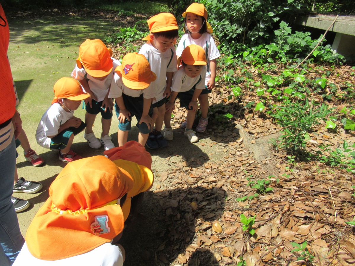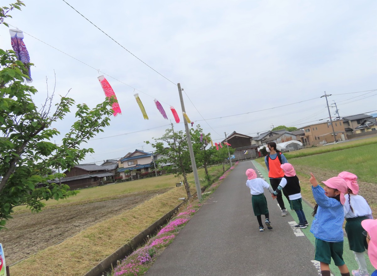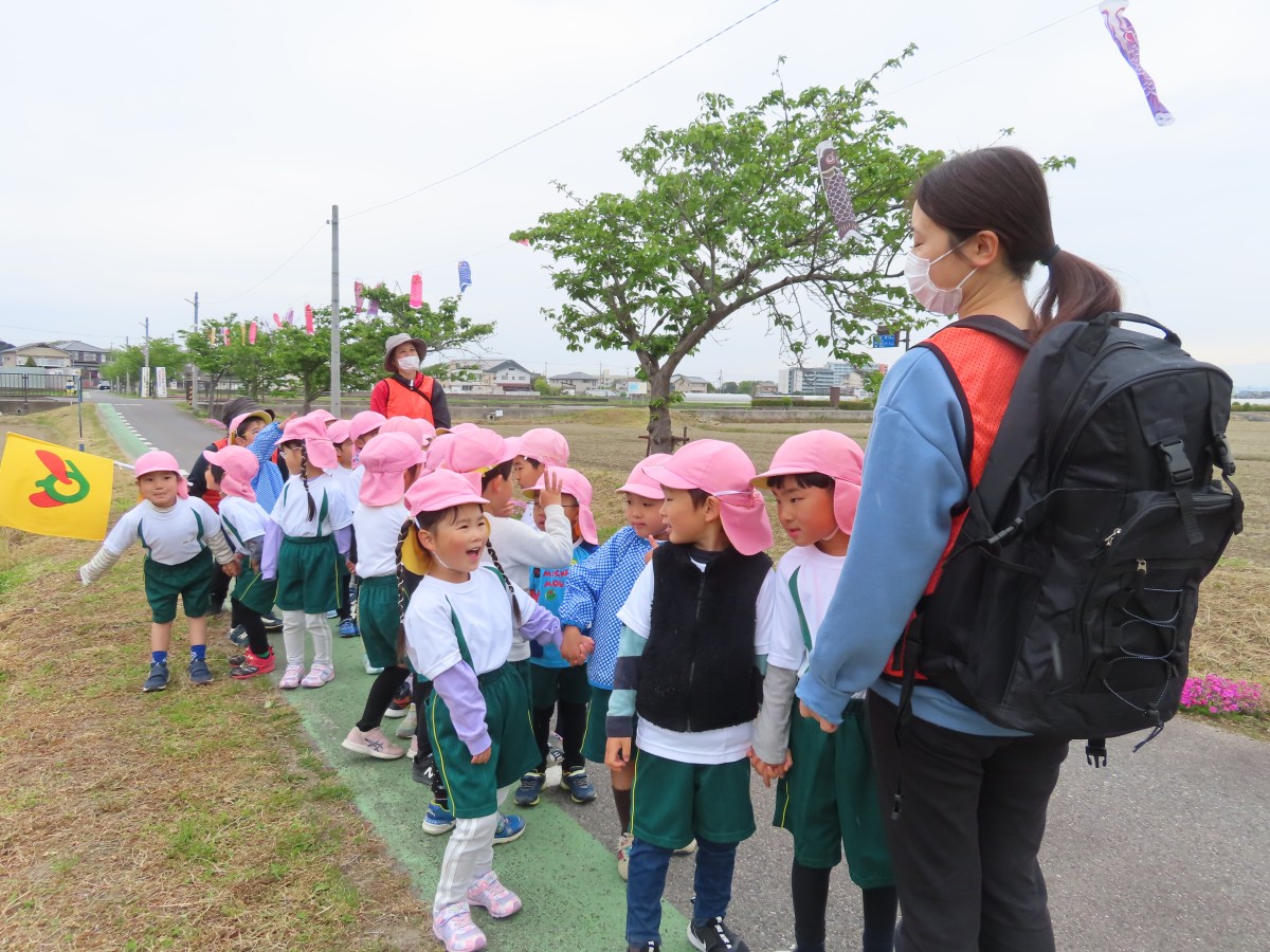 山田こども園では、「わくわく探検」と名付けた園外保育を定期的に実施し、地域に出かけています。3歳児・4歳児は園周辺や山田八幡宮、天神社、木川町グランドに出かけて自然を存分に感じながら過ごし、5歳児は少し遠方の山田小学校やai彩広場まで出かけて、こいのぼりを見たり小学生と交流したりして過ごすこともあります。子どもたちの歩く力を育むだけでなく、いろいろな人やもの、ことがらとの出会いから、子どもたち自身が多くのことを学んでいます。