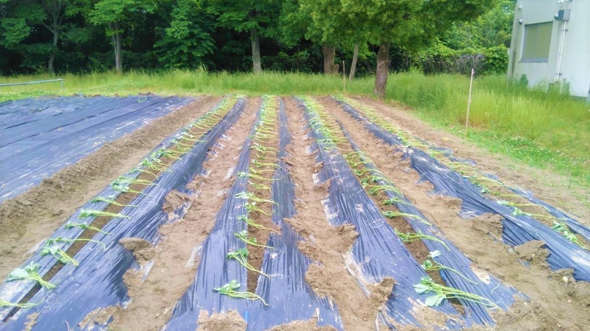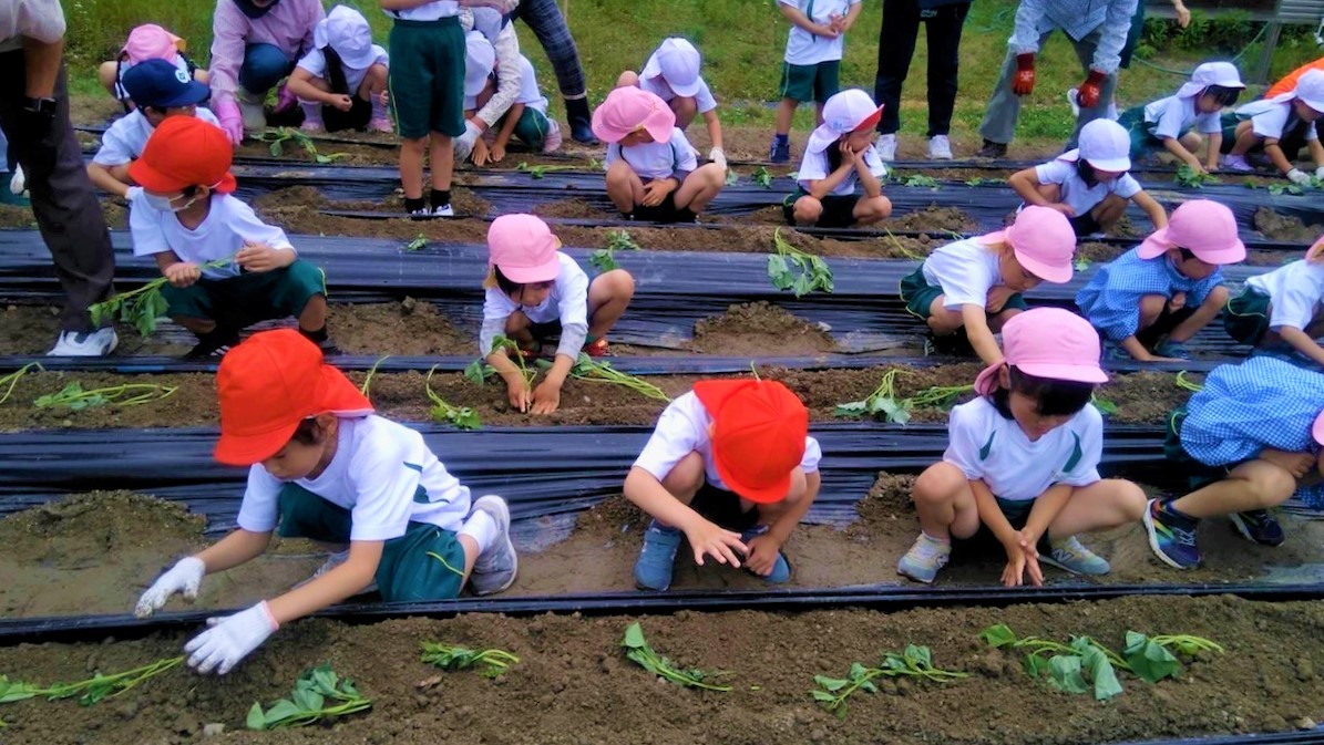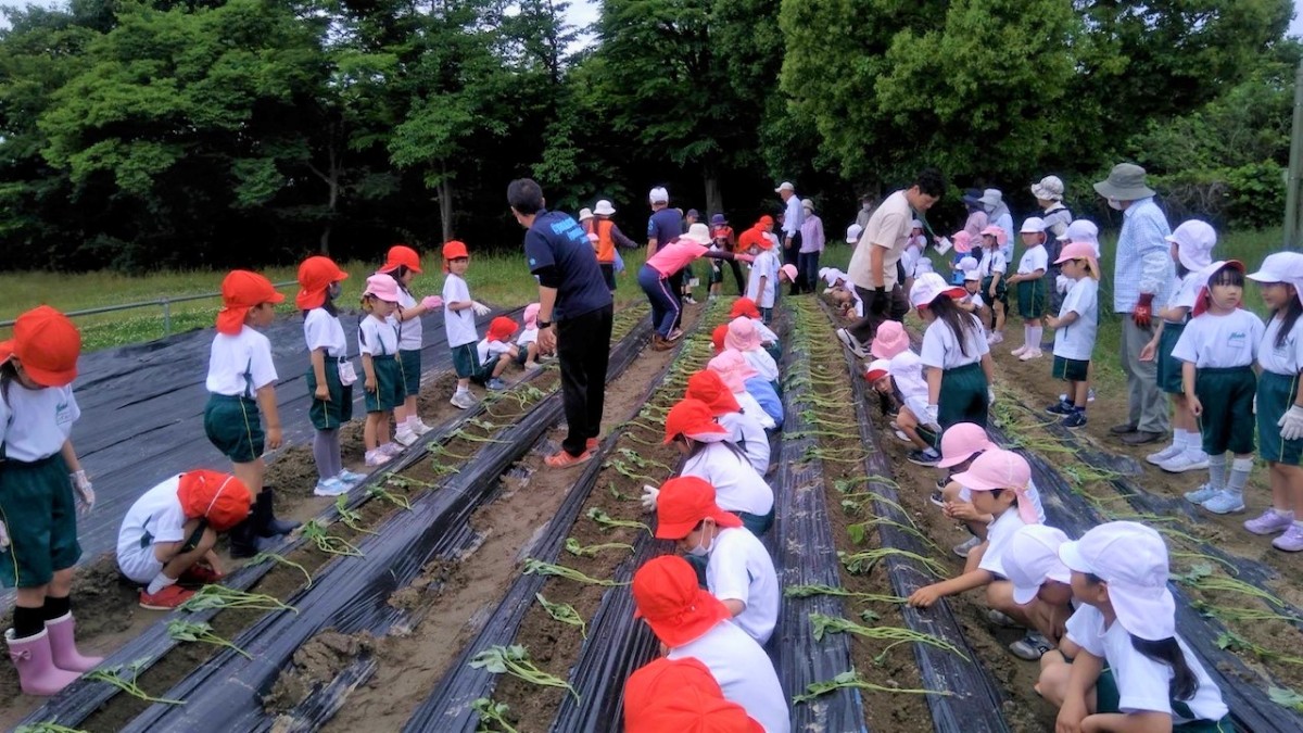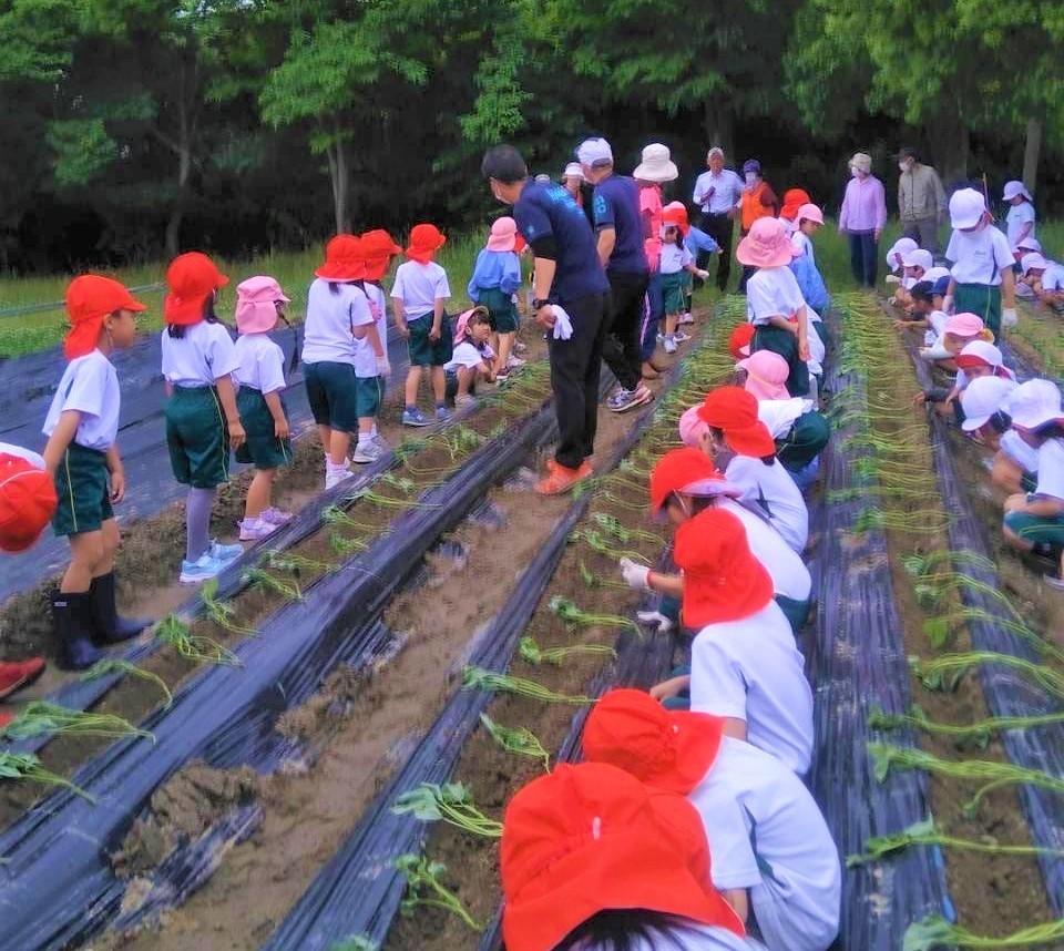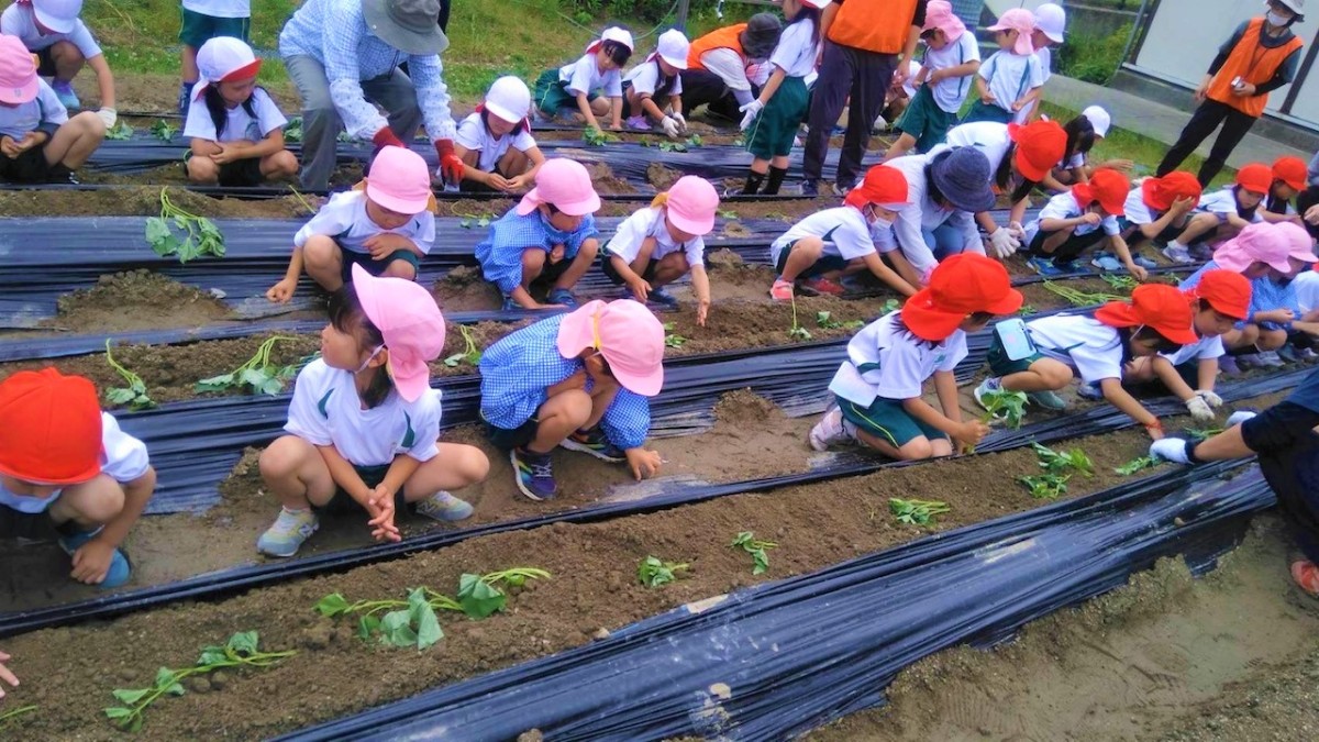 5月31日(水)、山田小学校1年生、山田こども園と一緒にサツマイモ植えを体験しました。
