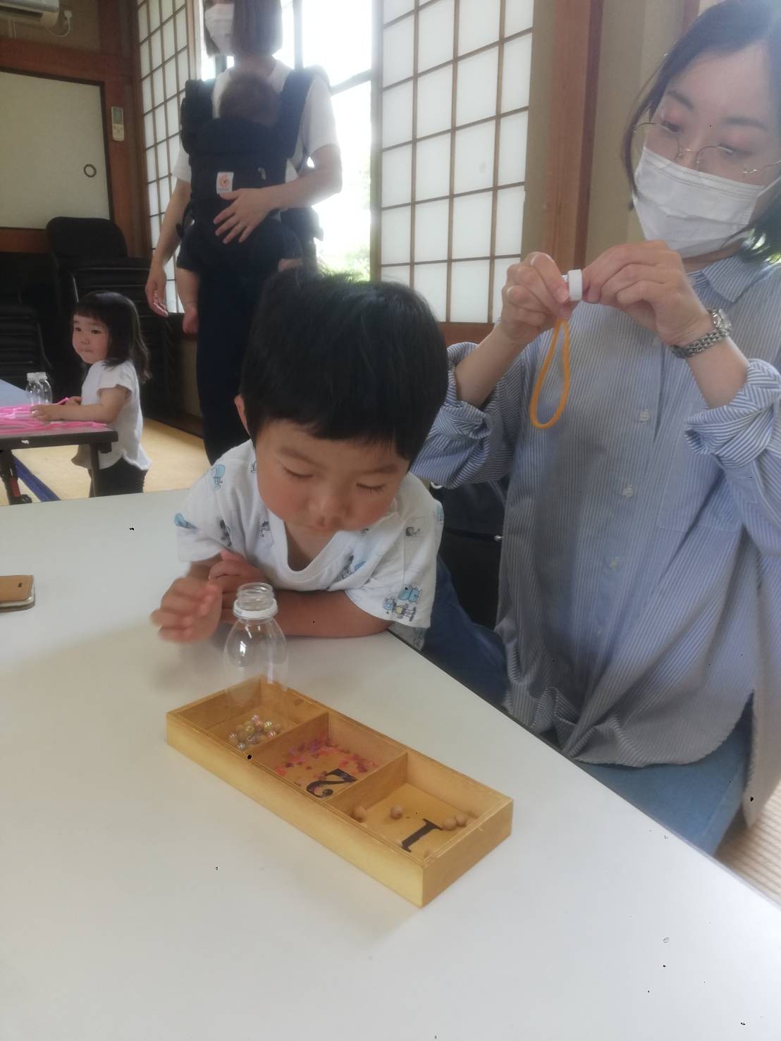 続いておもちゃ作り!容器にビーズや大豆を入れるとガラガラおもちゃのできあがり。