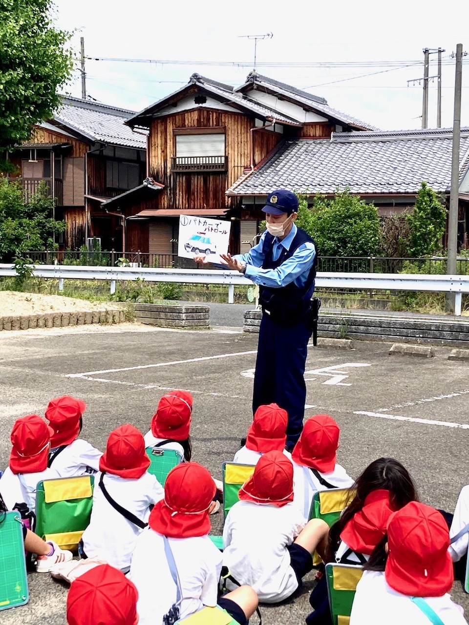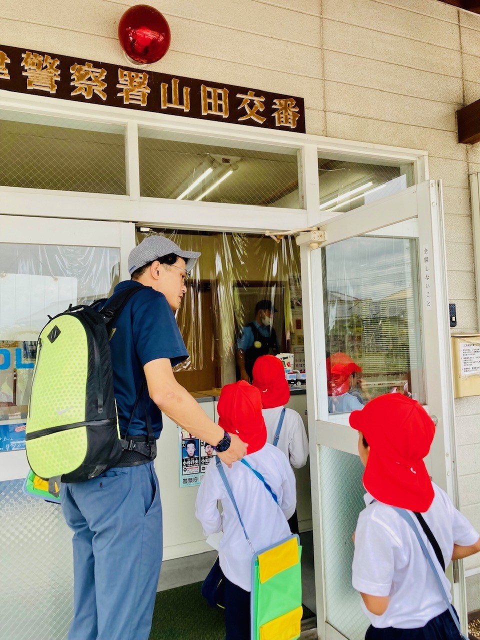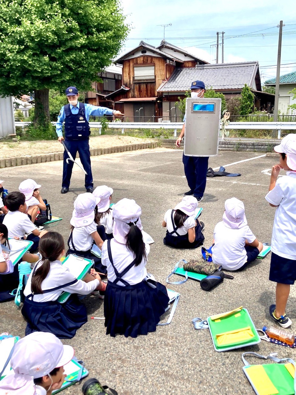 6月7日(水)2年生が【町たんけん】で、山田交番とまちづくりセンターを訪れました。交番の中を見学した後、まちづくりセンター前の駐車場に集合して、山田交番の3人のお巡りさん(玉川さん、岩永さん、今西さん)から交番の仕事についてお話を聞きました。