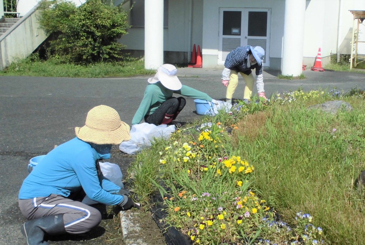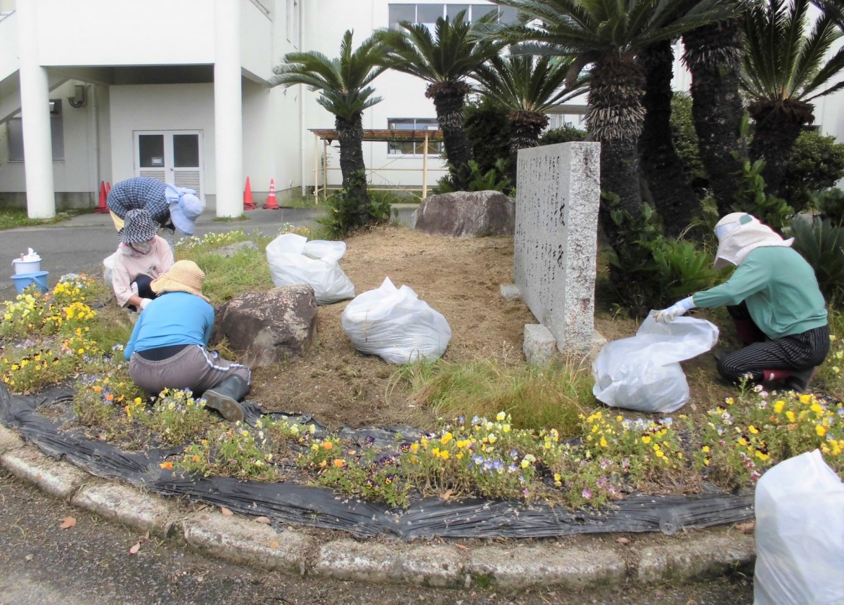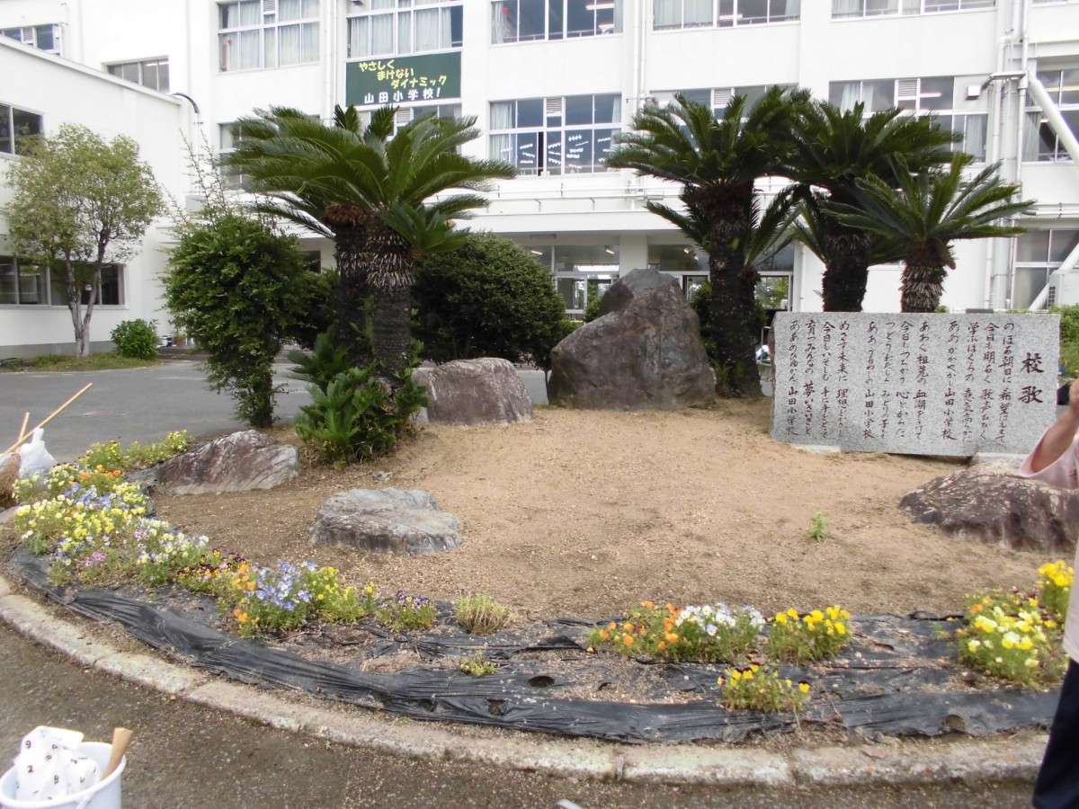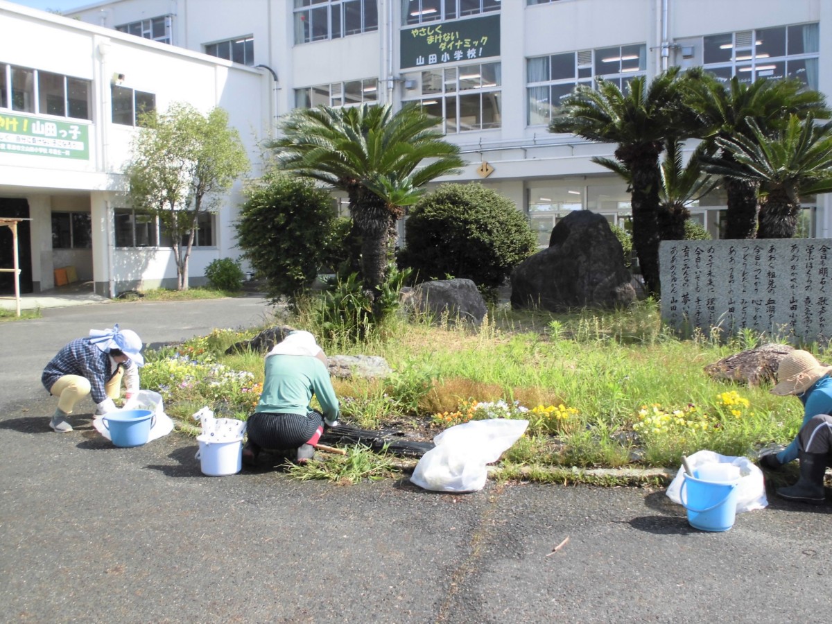 6月16日(金)早朝より山田小学校校舎正面にある花壇の草引きをしました。