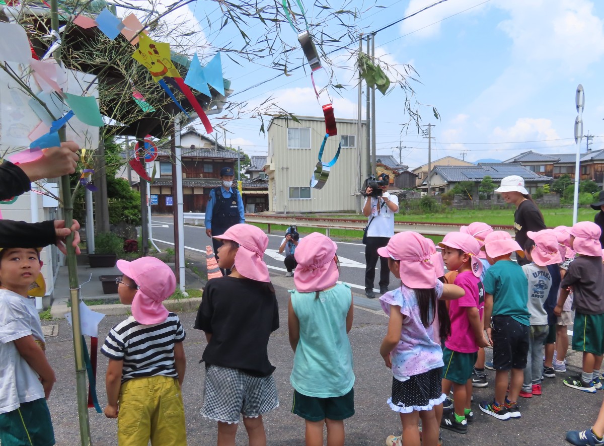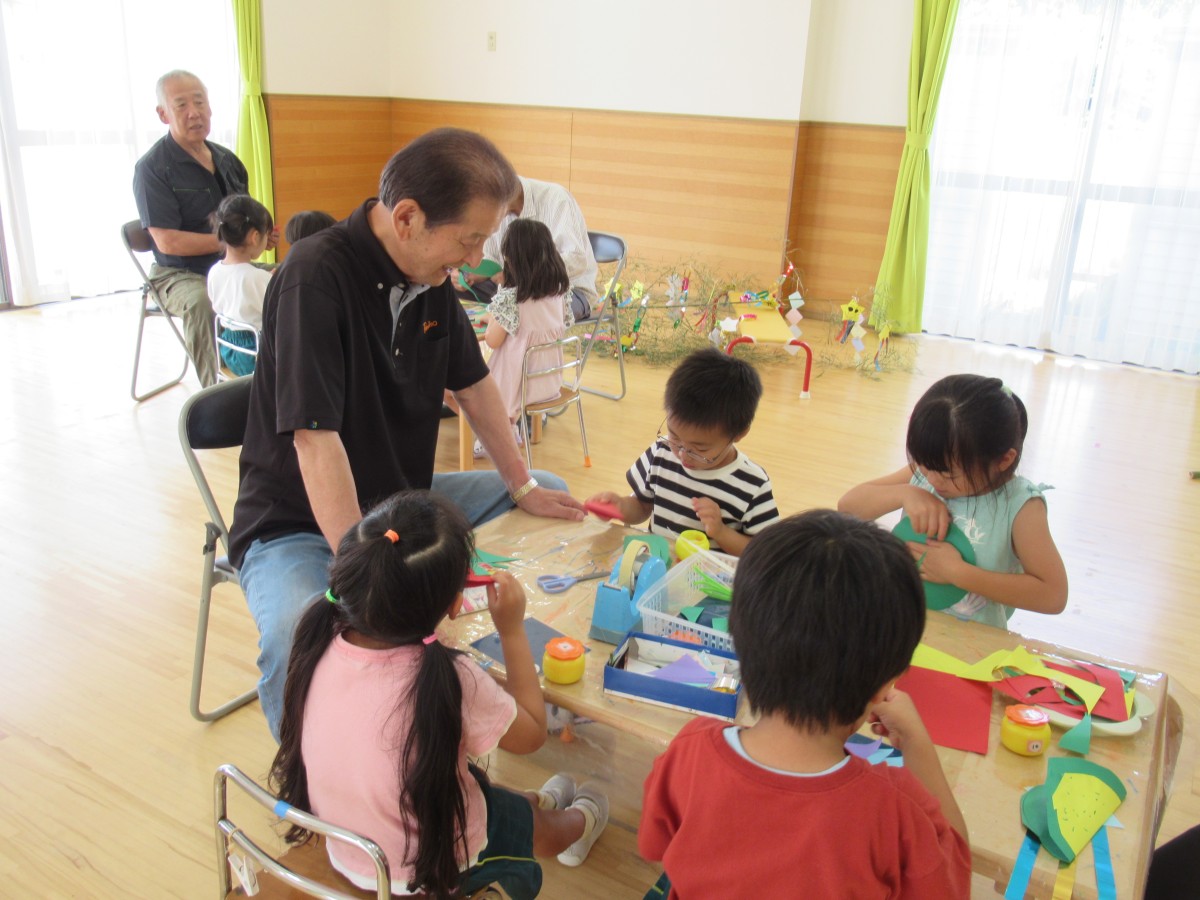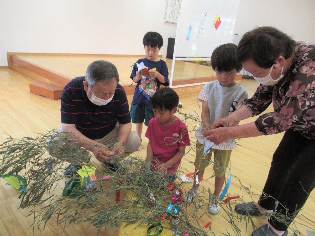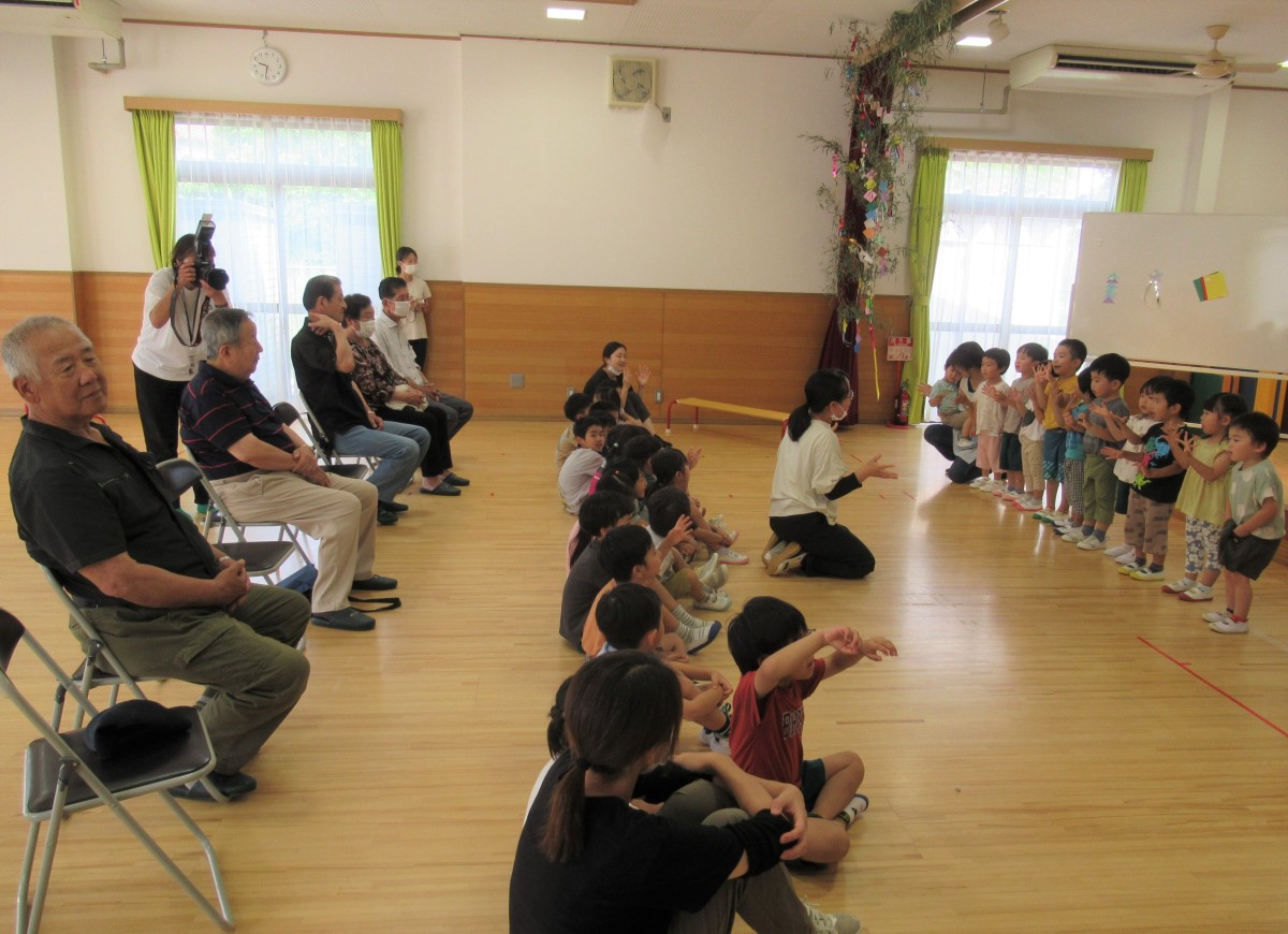 七夕が近づく中、山田こども園では6月29日(木)に山田学区老人クラブの方との『七夕交流会』を実施しました。3歳児・4歳児・5歳児がそれぞれ歌を披露したり、一緒に手遊びを楽しんだりした後、5歳児が老人クラブの方と一緒に笹飾りを作りました。また、4歳児が完成した笹飾りを老人クラブの方と一緒に山田まちづくりセンターへ、5歳児は山田交番へ、地域の方の温かな見守りに感謝の気持ちを込めて笹送りをしました。