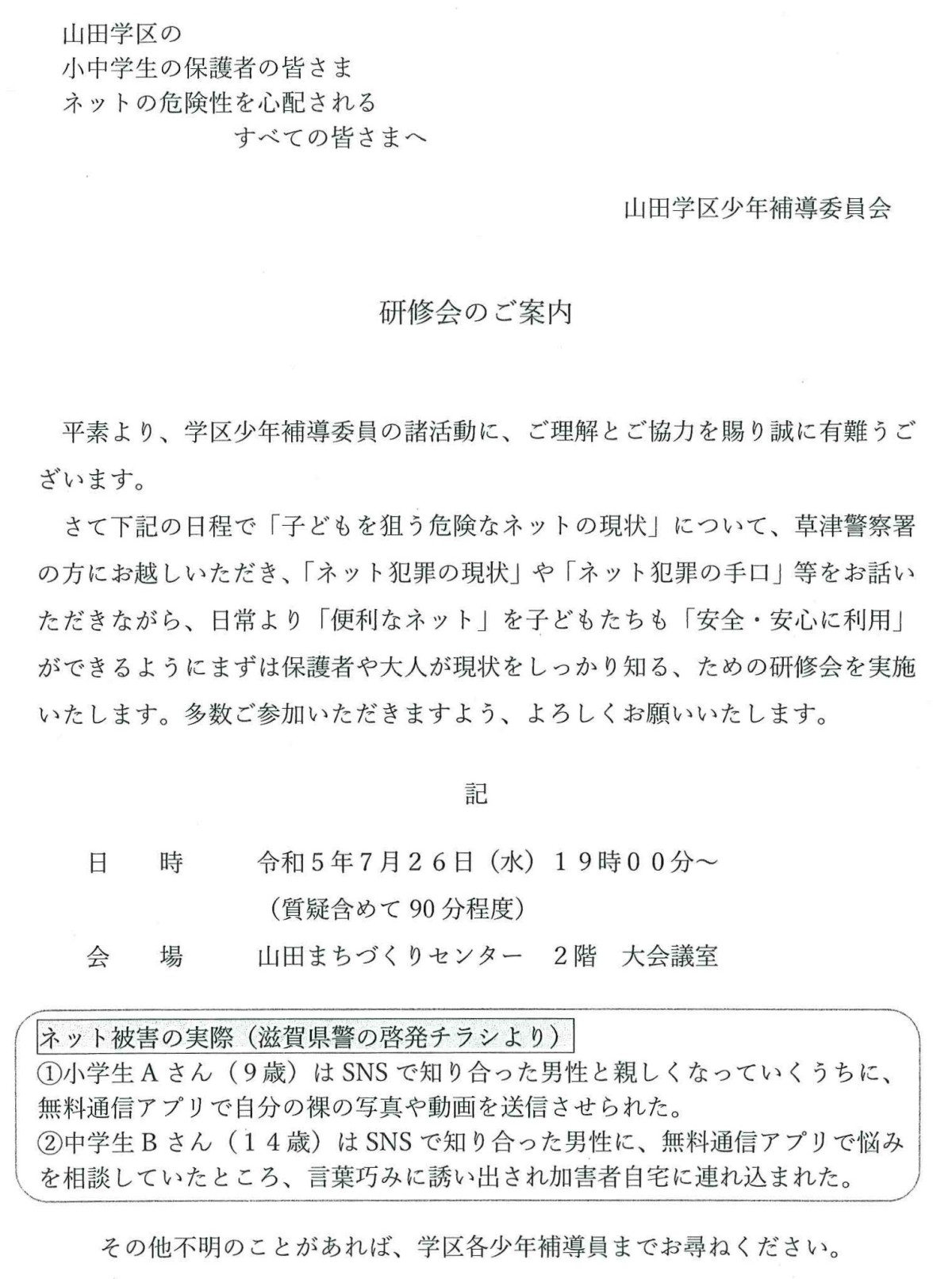 少年補導委員会よりお知らせです。 7月26日(水)19:00~「子どもを狙う危険なネットの現状」について、山田まちづくりセンターにて研修会を開きます。当日は草津警察署の方にお話しいただきます。小中学生の保護者の方をはじめ、多くの方の参加をお待ちしております。詳しくは下の案内文をご覧ください。