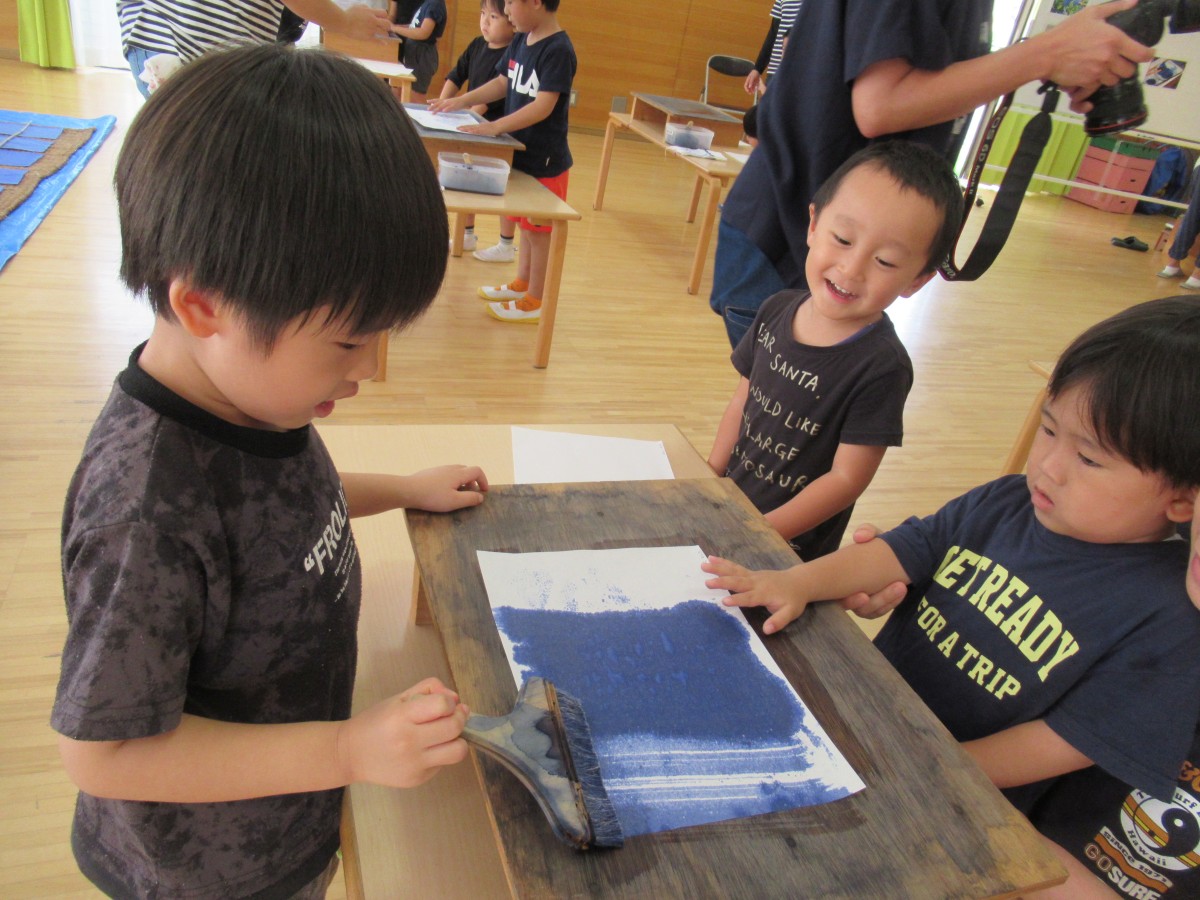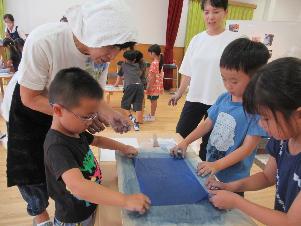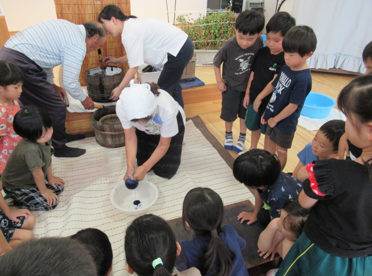 山田こども園の伝統行事でもあるアオバナ染め体験。伝統文化を教えてくださる地域の方への感謝の気持ちを育みながら、ふるさとの思いをつないでいきたいと思います。