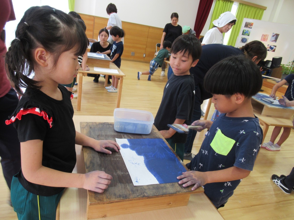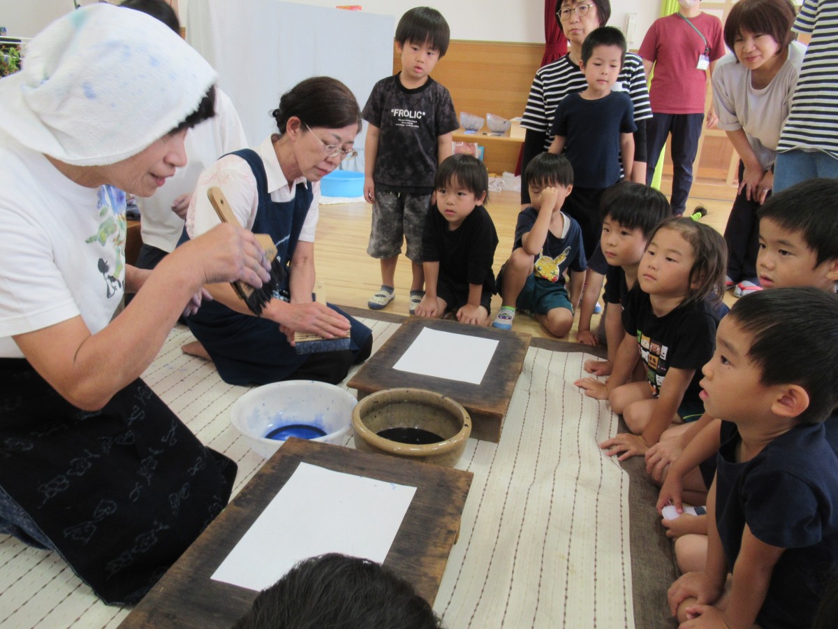 8月31日(木)は、子どもたちのアオバナ染め体験を支えてくださっている、“アオバナのおじいちゃん・おばあちゃん”をお招きし、青花紙の染め体験をしました。昔ながらの道具を用いたアオバナ液絞りの様子を見せていただいたり、実際に和紙に液を塗り重ねる染め体験をしたりして、ふるさとの伝統文化に触れた子どもたちです。