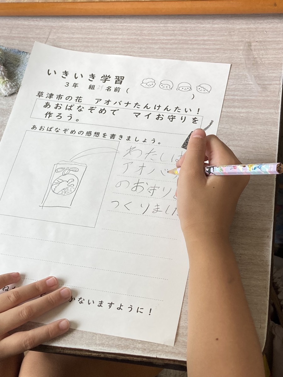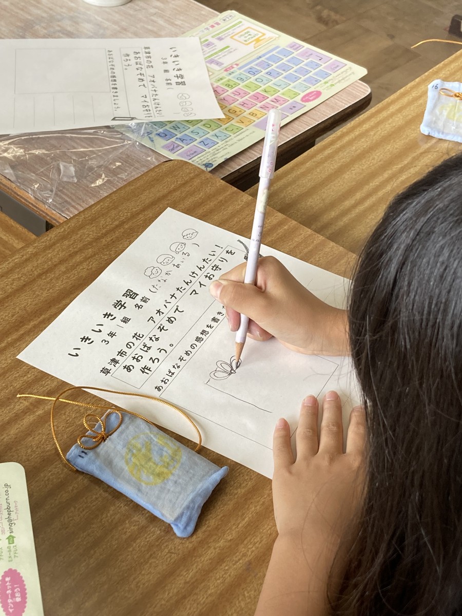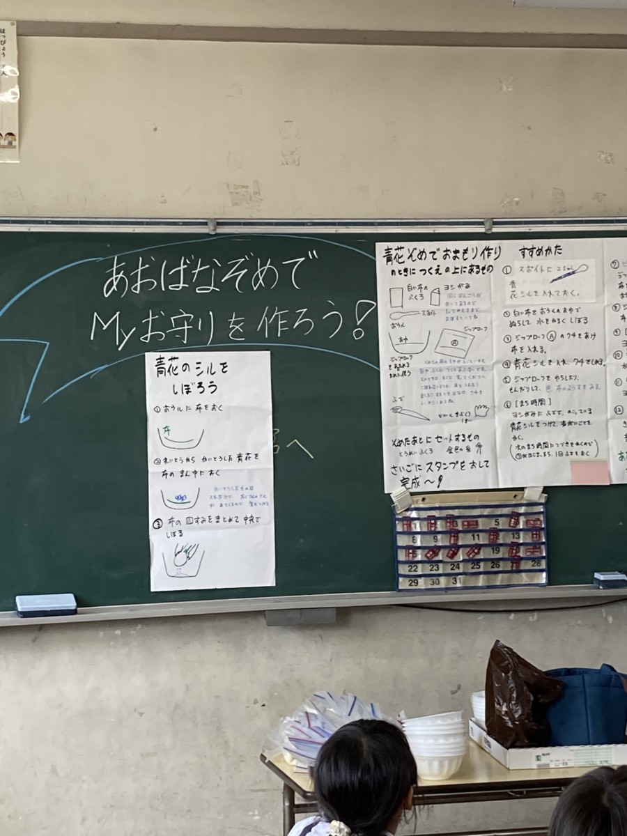 3年生は一学期からあおばな学習をしています。今回はあおばなぞめで自分のお守りを作りました。最初にあおばなを絞ってできた青い汁で願いごとや気に入った絵を描きました。小さな布袋を絞った後の花びらで染めました。それをアイロンで乾かし金色のスタンプを押しました。その袋に願い事をかいたヨシ紙を入れて最後には金色のリボンをつけて完成です。手を真っ青にしてあおばなを絞っている様子はみんな笑顔でした^_^