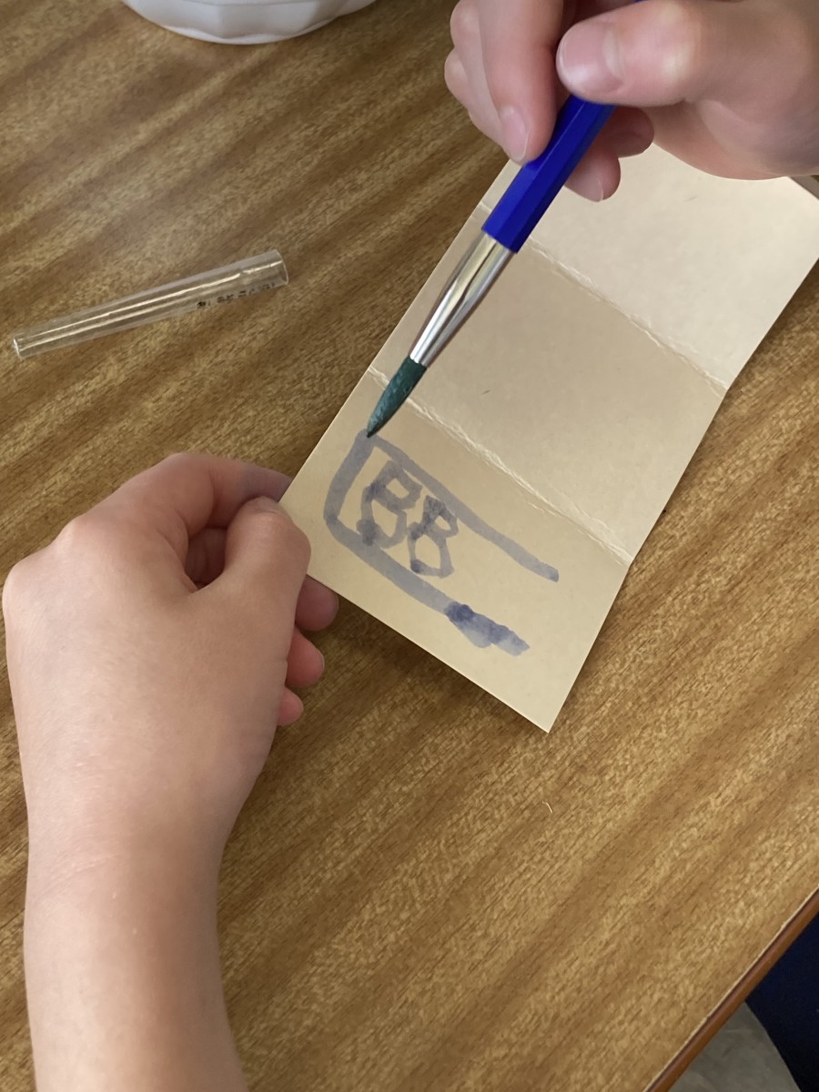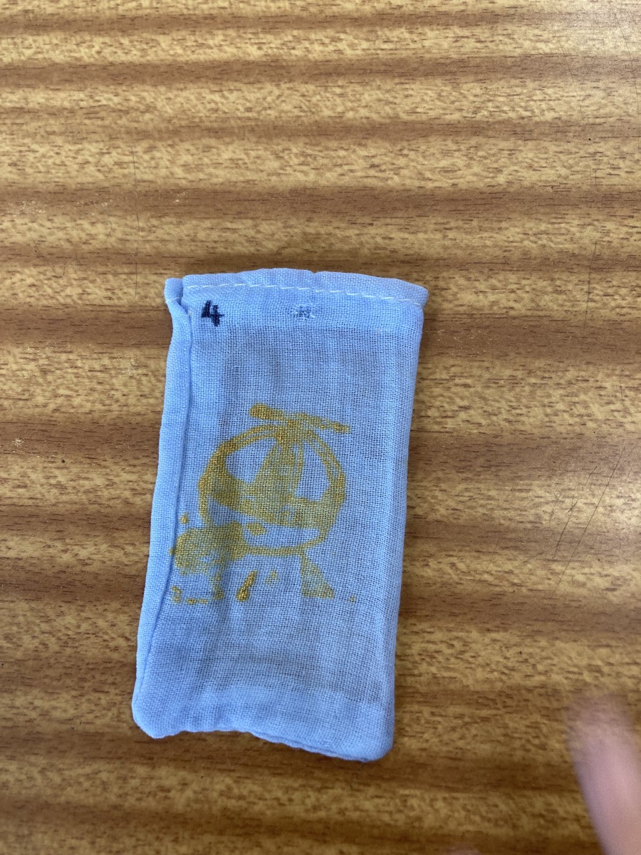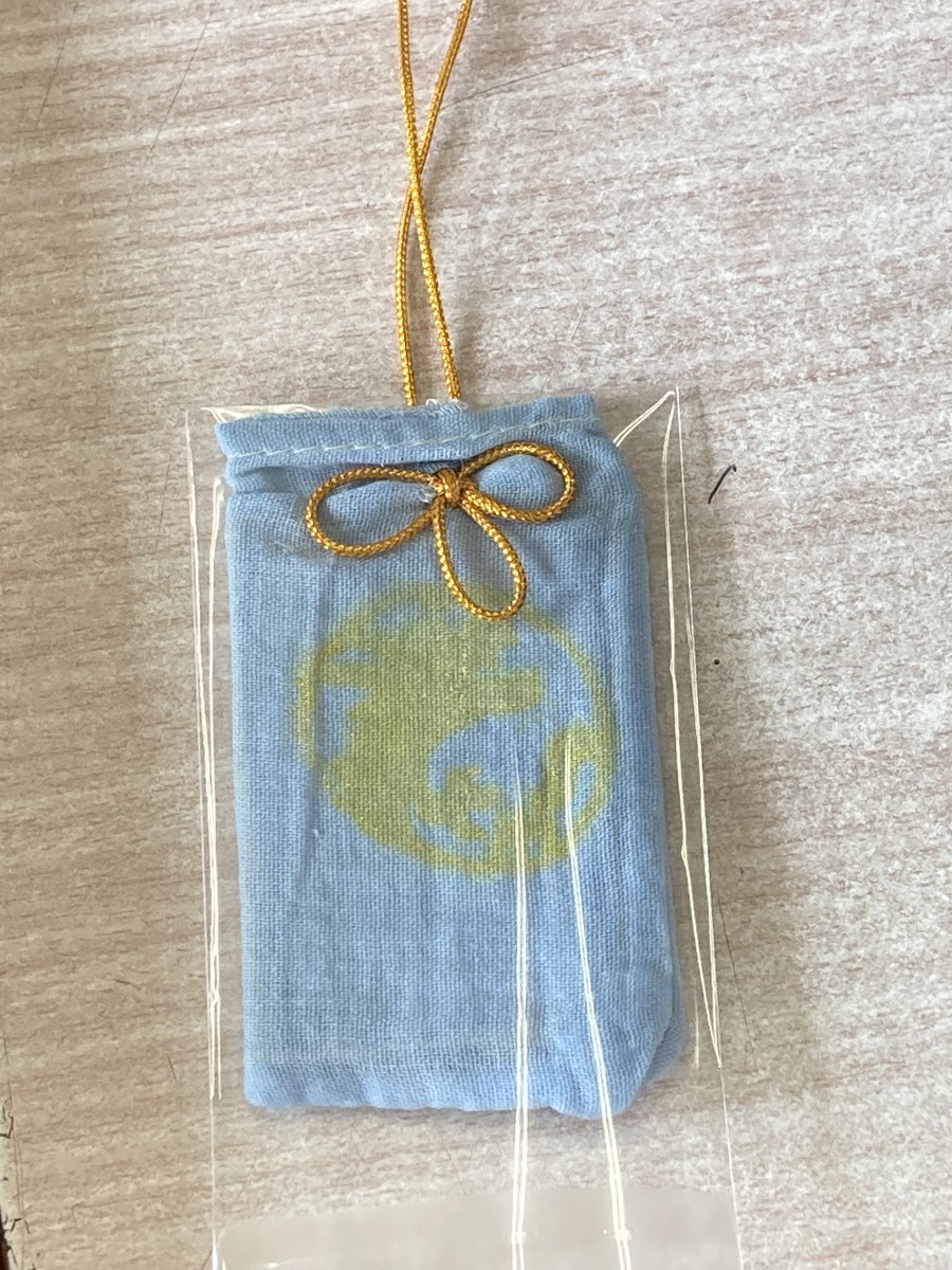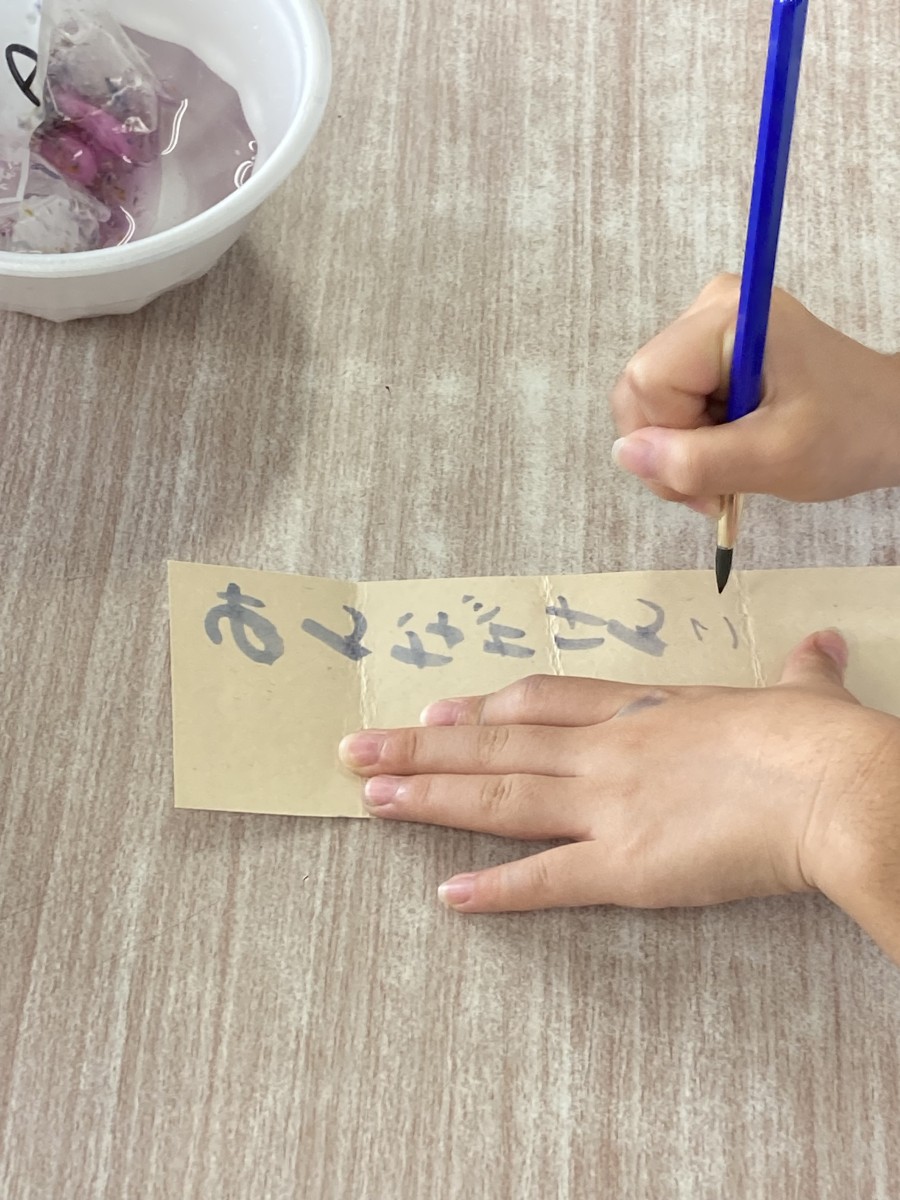 3年生は一学期からあおばな学習をしています。今回はあおばなぞめで自分のお守りを作りました。最初にあおばなを絞ってできた青い汁で願いごとや気に入った絵を描きました。小さな布袋を絞った後の花びらで染めました。それをアイロンで乾かし金色のスタンプを押しました。その袋に願い事をかいたヨシ紙を入れて最後には金色のリボンをつけて完成です。手を真っ青にしてあおばなを絞っている様子はみんな笑顔でした^_^