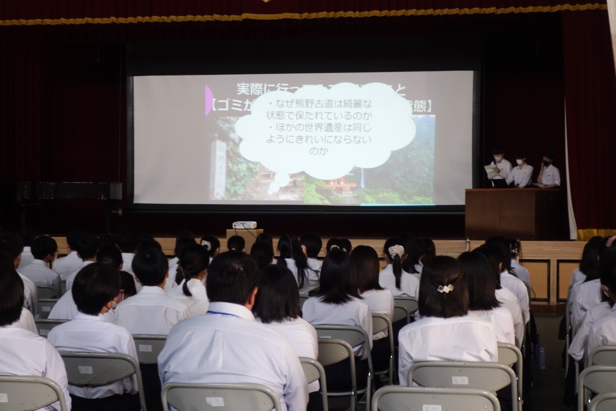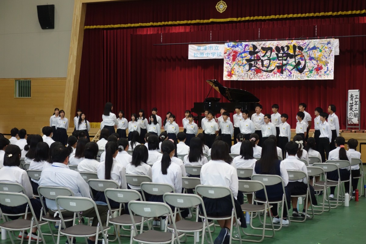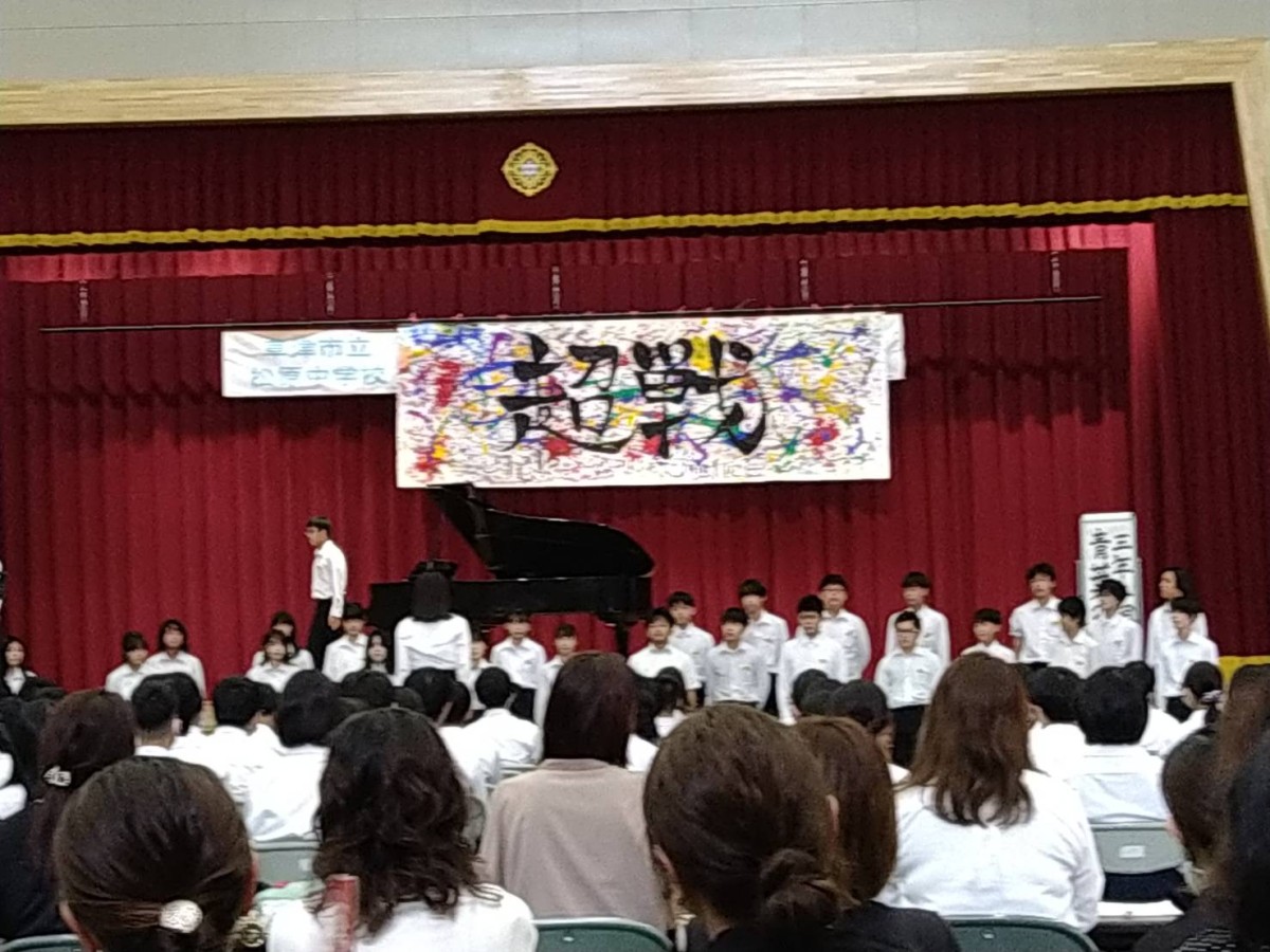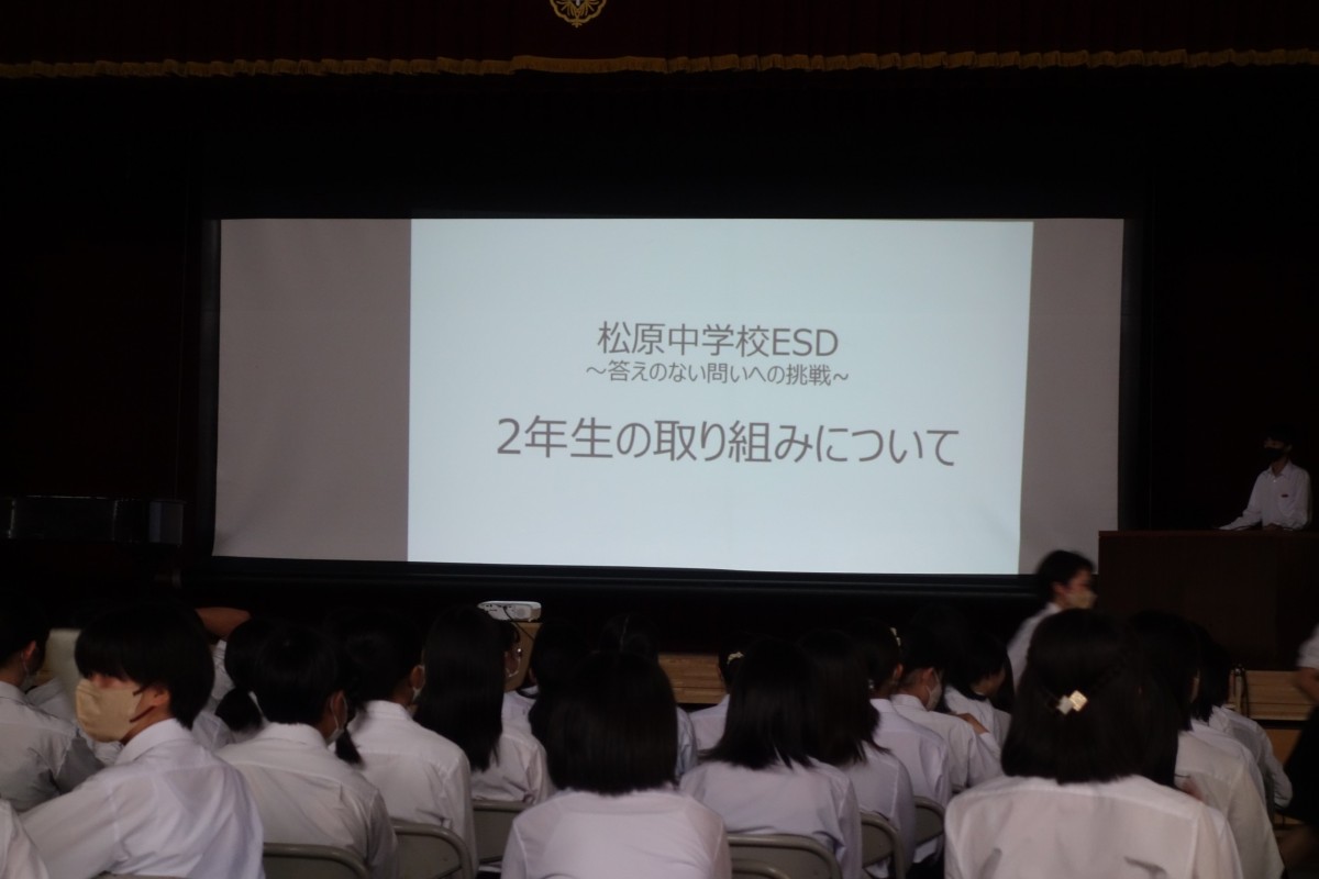 松中祭文化の部を開催しました。生徒会長から各学年への応援メッセージ「がむしゃらに楽しみましょう」の開会挨拶の後、合唱コンクールが行われました。どの学級も練習の成果を存分に発揮し、すばらしい歌声を響かせました。引き続いて「第1回松原スピリッツアワード」が開催され、2年生、3年生の代表によるESD取組の発表がありました。午後からは、吹奏楽部の演奏動画の視聴と結果発表、閉会式が行われました。日々の学習や部活動の成果が着実に積み上げられていることが実感できるすばらしい文化の部となりました。