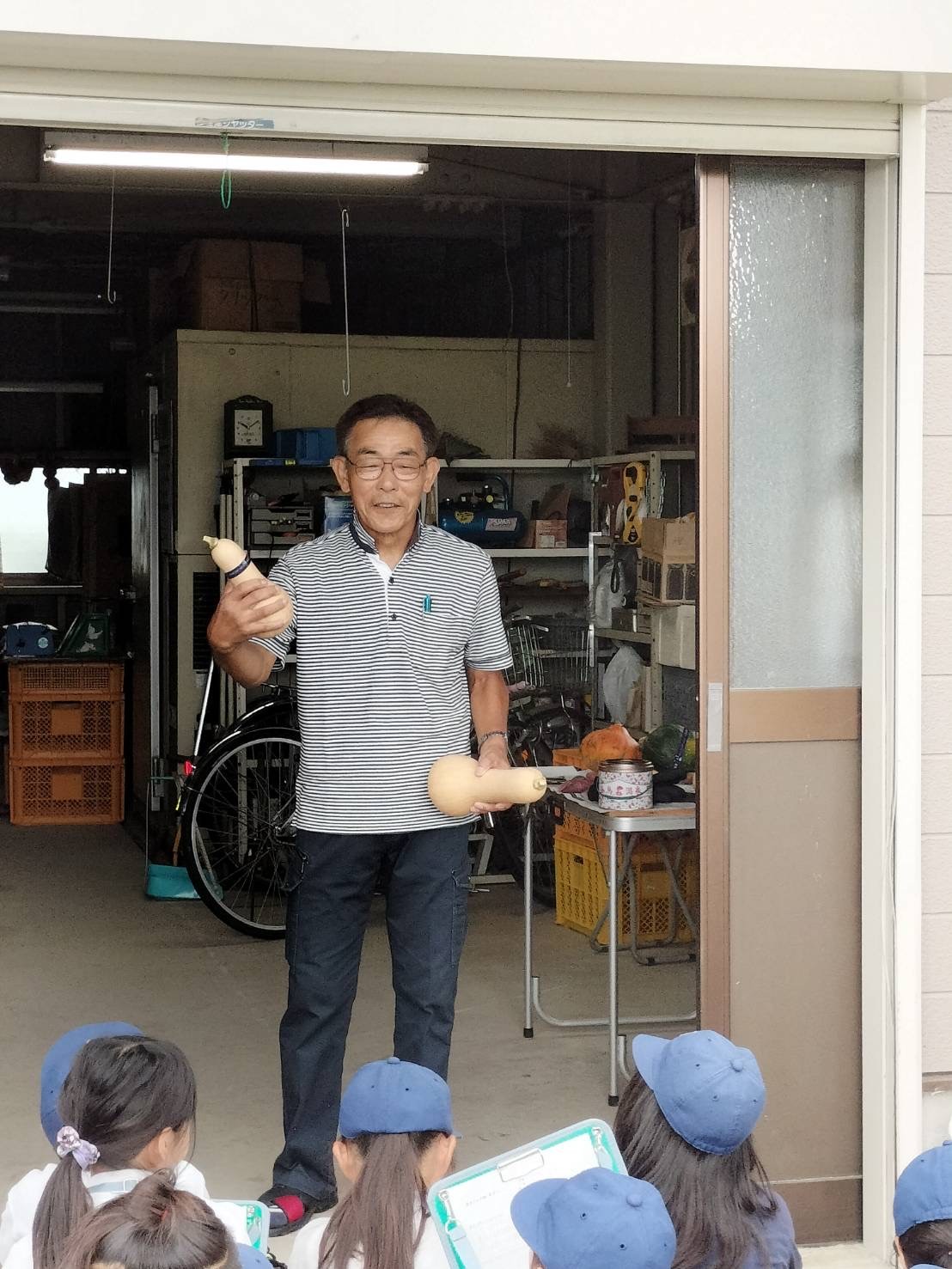 9月22日(金)、4年生が「山田をもっと好きになろう」の活動の一環で五条町の清水清之さんのお宅を訪問しました。定年退職後から始められた珍しい野菜作りのお話をお聴きして興味津々。数種類のかぼちゃや芋類の実物を目にして、身を乗り出すようにしてお話を聴いていました。