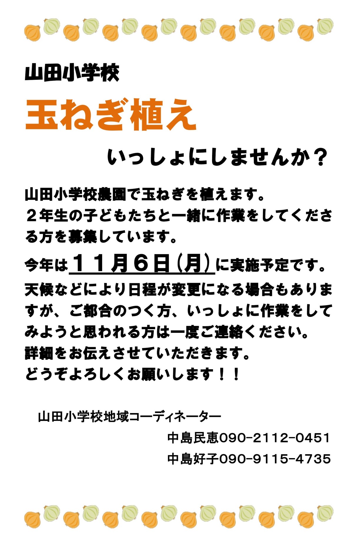 山田小学校農園で玉ねぎを植えます。2年生の子どもたちと一緒に作業をしてくださる方を募集しています。 今年は11月6日(月)に実施予定です。天候などにより日程が変更になる場合もありますが、ご都合のつく方、いっしょに作業をしてみようと思われる方は一度ご連絡ください。詳細をお伝えさせていただきます。どうぞよろしくお願いします!!