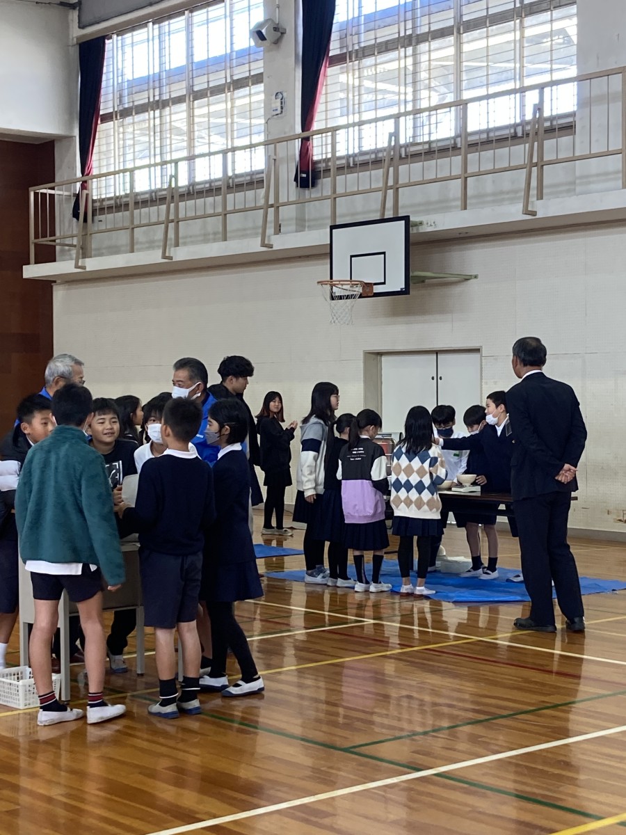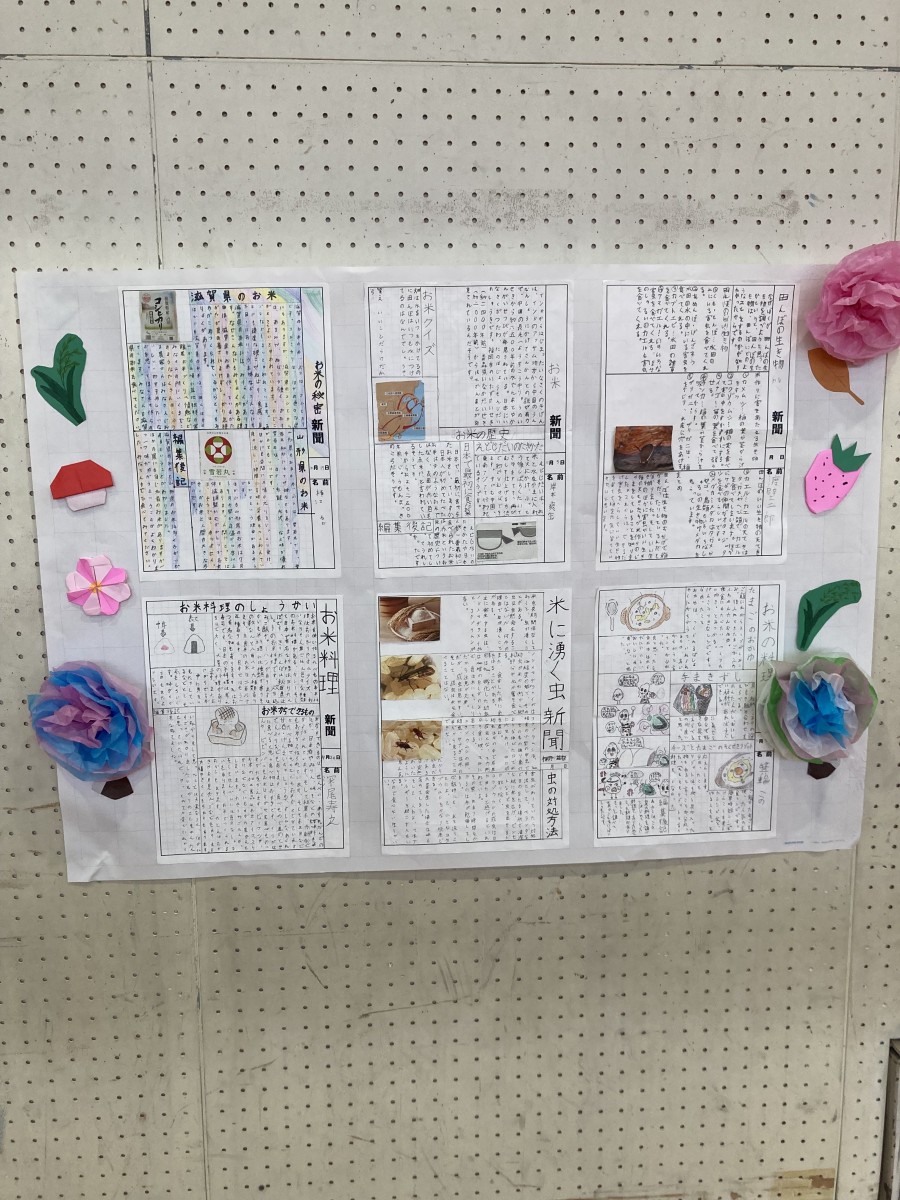 11月15日収穫祭が開かれました。五条ふるさと環境を守る会やJAのみなさんにお世話になり、田植えや稲刈りを体験して、ようやくお米を収穫できました。この日はお世話になった方々に感謝の気持ちを込めて、まず感謝状の授与をしました。そして司会や進行は子どもたちが行い、お米について調べたことをみなさんに発表しました。続いてグループ毎にお米のカルタを作ったりお箸で米粒をつまんでみたりするコーナーをつくり、みんなが見に回りました。壁には調べたことを新聞のように書いて貼って展示しました。収穫したお米は5年生がおにぎりにしました。