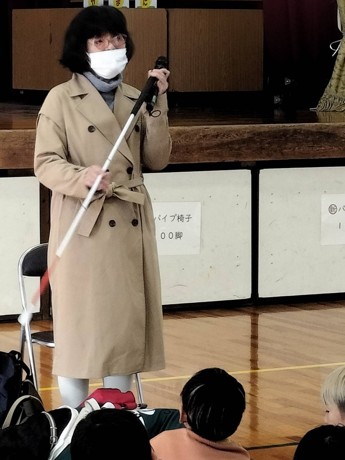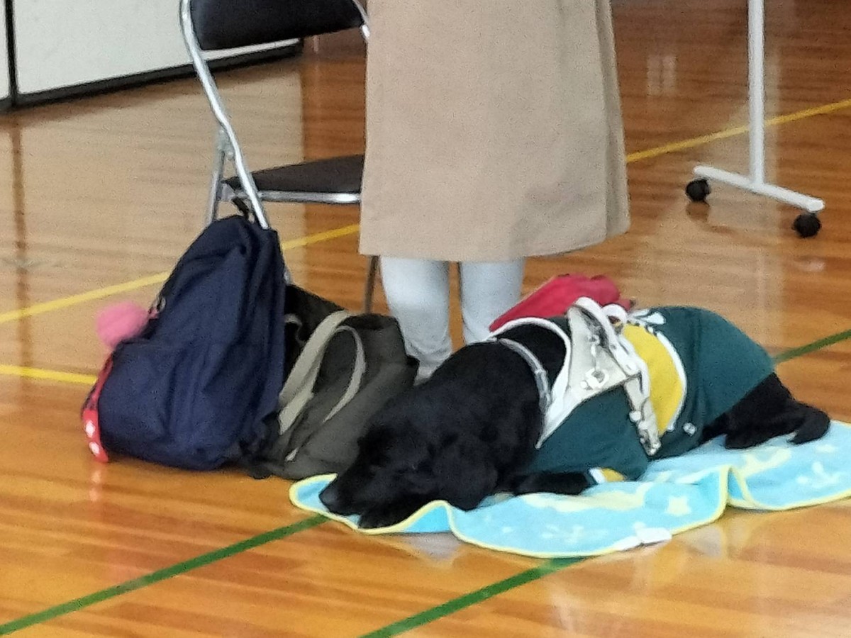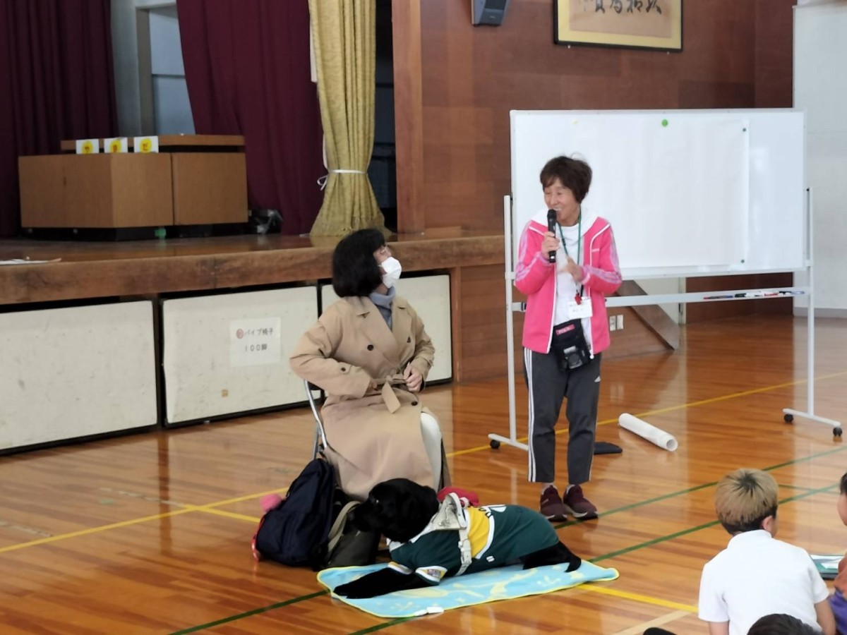 11月21日(火)3年生が「盲導犬と出会おう」の学習をしました。大津市の前田眞里さんが一緒に暮らしているラブラドール・レトリーバーのペリーくんと共に来校されました。目の不自由な人の目の代わりとなって安全にガイドをするのが仕事の盲導犬は県内に11頭しかいないそうです。盲導犬はバス、電車をはじめ飛行機にも一緒に乗れる心強い相棒です。でも、犬には信号の色が見分けられないので、前田さんが車の音を聴き分けて道を渡るのですが、最近の電気自動車は音が小さく静かに近づくので、わかりにくいそうです。ラブラドール・レトリーバーという犬種はおとなしく穏やかな性格で仕事が好き、体が大きく安定した歩きが出来るので盲導犬に向いているのだとお話されました。街で盲導犬と歩いている人を見かけたら 「何かお手伝いしましょうか 」と声をかけてほしい、犬が可愛いからと言って触ったり食べ物を与えたりしないでほしい、道に落ちている物を拾い食いすると困るので、道にごみを落とさないでほしい、など子ども達にお話されました。