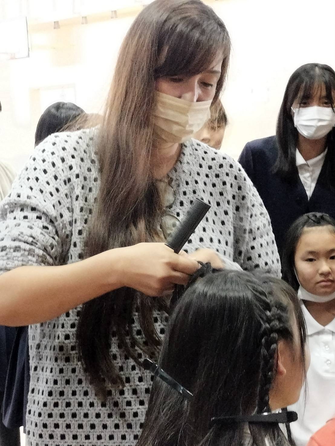 次に「美容師」の樫根祐子さん。実家が美容室なので、美容師になったという樫根さんは、ハサミとコームがあればどこでも仕事が出来ると、この仕事の素晴らしさを語ってくださいました。阪神・淡路大震災の時は運動場で被災者の髪をカットしたそうです。シャンプーで手が荒れたり腰痛になったり、トイレを我慢して膀胱炎になったりと、職業病の辛さもあるそうです。でも定年が無く、お母さんは82歳で現役だということも含めて「仕事が出来るのは人生が豊かになる」と話してくださいました。話の終わりに髪の長い子をモデルに編み込みの実演をされました。全員が取り囲んで見守る中、子ども達と会話をしながら手を動かす樫根さん。さすが!と感心しました。
