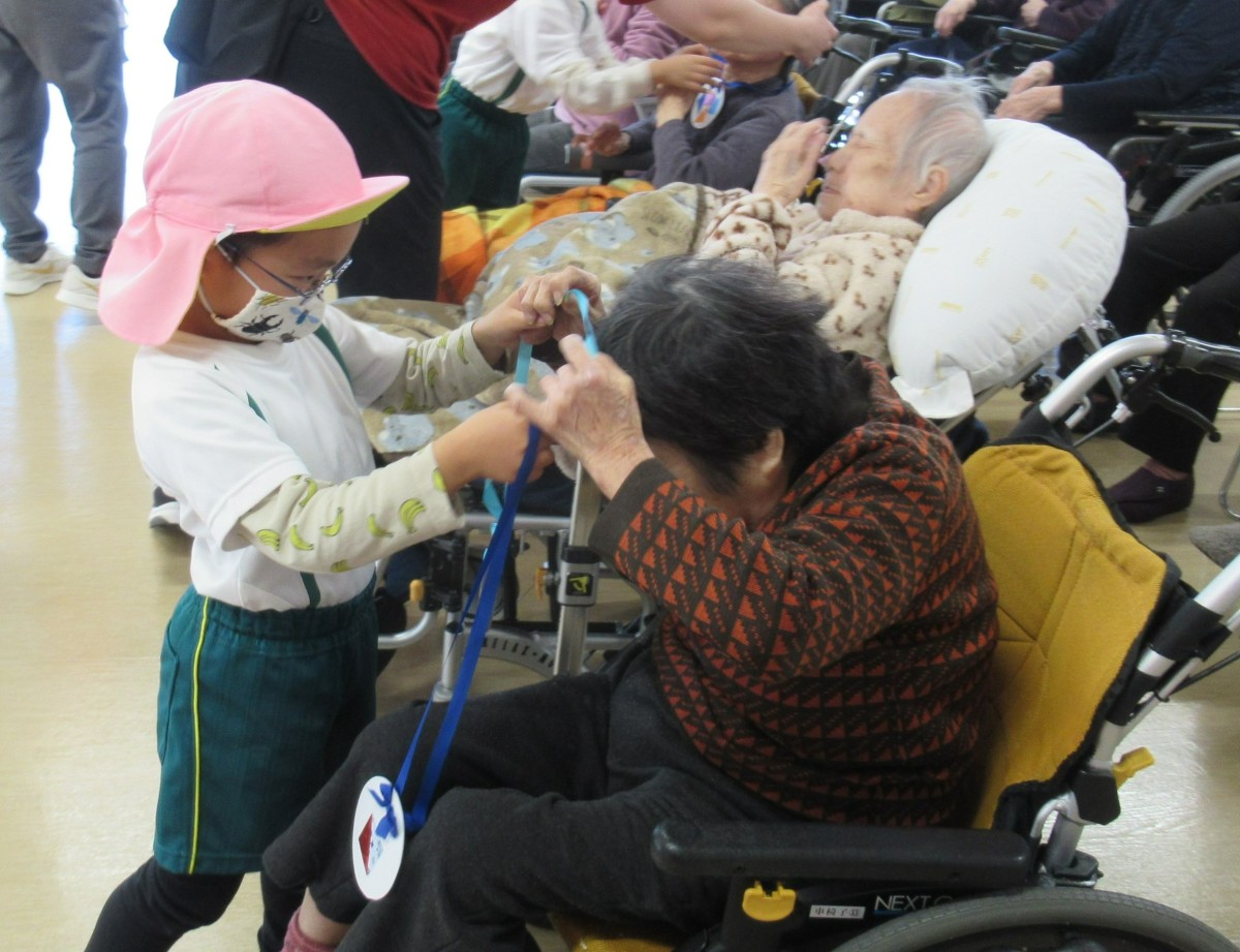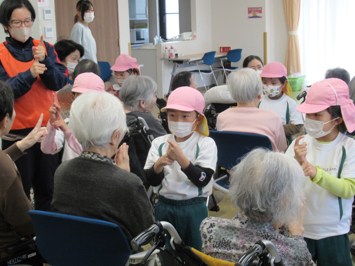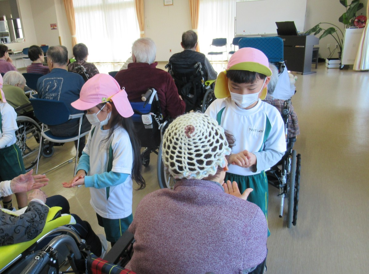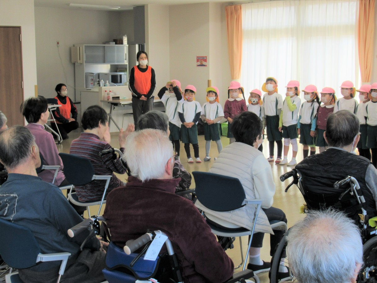 山田こども園では、平成30年より特別養護老人ホーム「えんゆうの郷」において、子どもたちと高齢者の方々との交流を実施してきました。ここ3年間はコロナ禍により直接的な交流を中断していましたが、毎年12月には「コロナが終息したら再会しましょう!」という思いを込めて、5歳児がプレゼントを届けることで交流を続けてきました。12月13日は、ついにその約束を果たすことに!4歳児と共に心を込めて作ったプレゼントを抱え、5歳児が園の代表としてえんゆうの郷へ。歌を披露したり、一緒に手遊びをしたりしながら、おじいさん・おばあさんとの温かな触れ合いを楽しみました。これからの社会を生き抜く子どもたちが、温かい心をもって高齢者の方や地域の方に接し、共に生きる喜びを味わうことで、世代を超えた心のつながりを築いていきたいと思います!