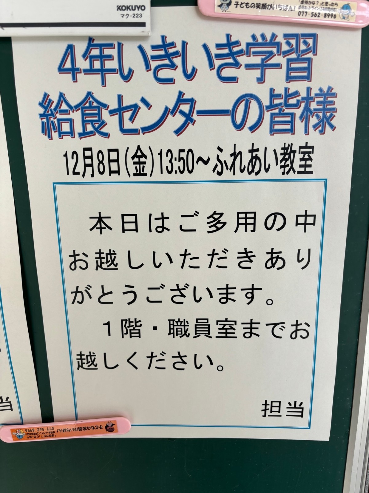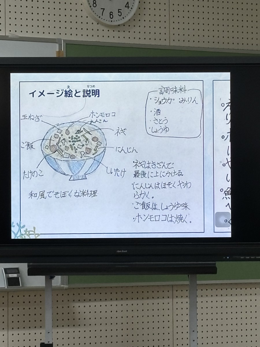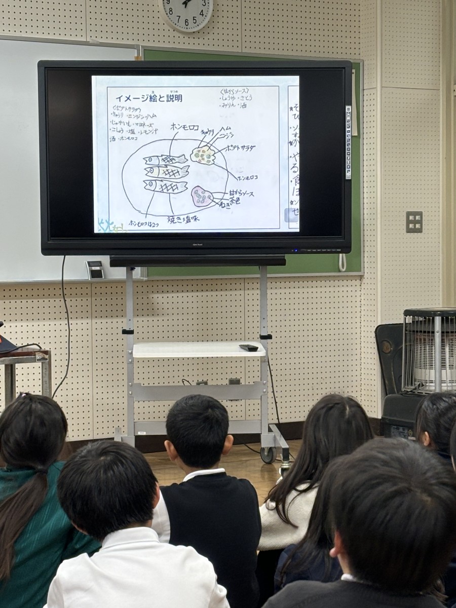 12/8には給食センターのみなさんをお招きして自分たちで考えたレシピをグループ毎に発表しました。このレシピはホンモロコを使った料理で全部で14グループの発表がありました。11月に立命館大学のBhoNoさんたちとも一緒にレシピを考えてきた取り組みです。レシピはいろいろあり混ぜご飯、パスタ、カレーなど考えに考えを重ねて作り上げられていました。どれかひとつでも給食のメニューに取りあげて欲しいという子ども達の願いが伝わってきました。