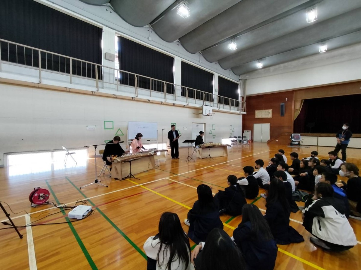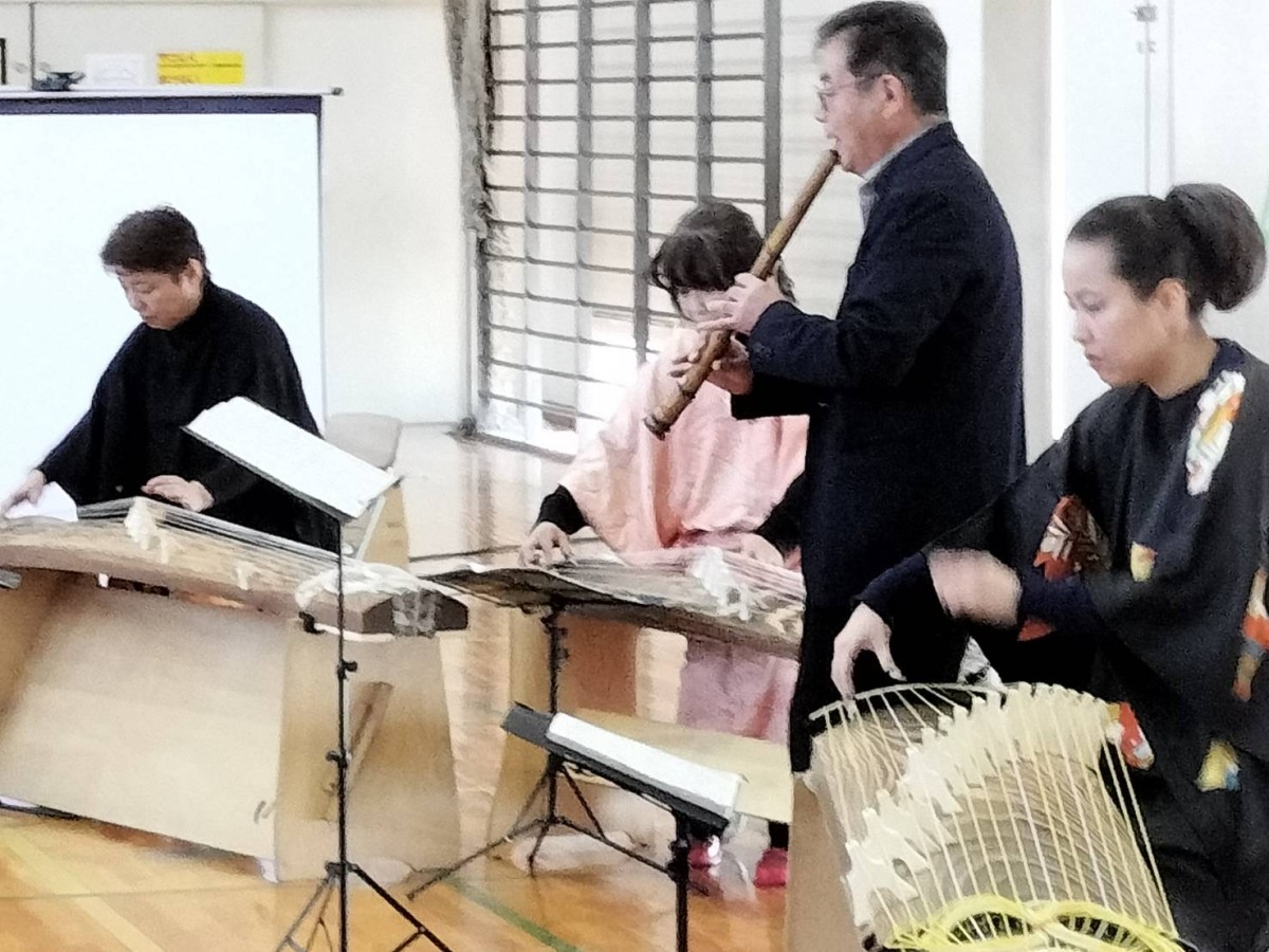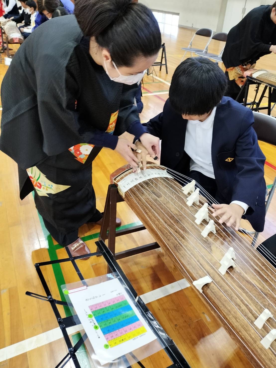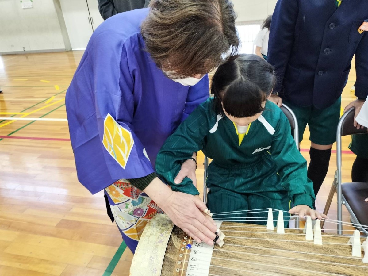 12月14日(木)4年生が音楽科の授業「おことと仲良くなろう」という学習で、和楽器の筝と尺八について学びました。《美音(みね)の会》の皆さんによる【春の海】と【雪月花によせて】の演奏を鑑賞し、それぞれの楽器について説明を聞きました。筝には十三絃と十七絃があること、尺八には五つの穴があり、吹き方で風や虫、鳥など自然を表現出来ることなどを知りました。その後、3グループに分かれて【さくらさくら】を爪弾く練習をしました。初めて指にツメを付けてドキドキしながらも楽しく音を出し、授業の終わりにはリレー方式で1曲をアンサンブル演奏しました。思った以上に良い音が出せて、みんなで1曲を仕上げたことが嬉しかったようです。中学校でも和楽器の学習があるそうなので、その時に今回の学びが生かされたらいいなと思います。