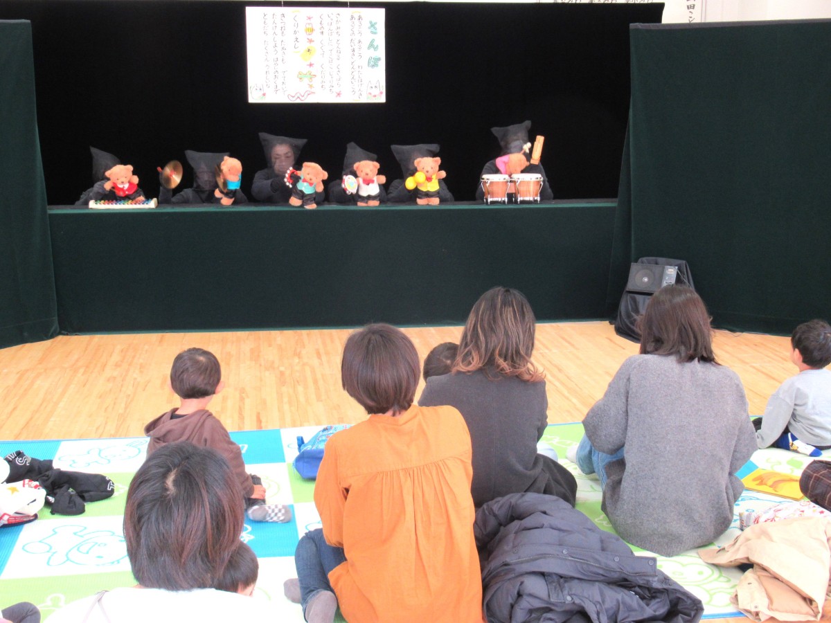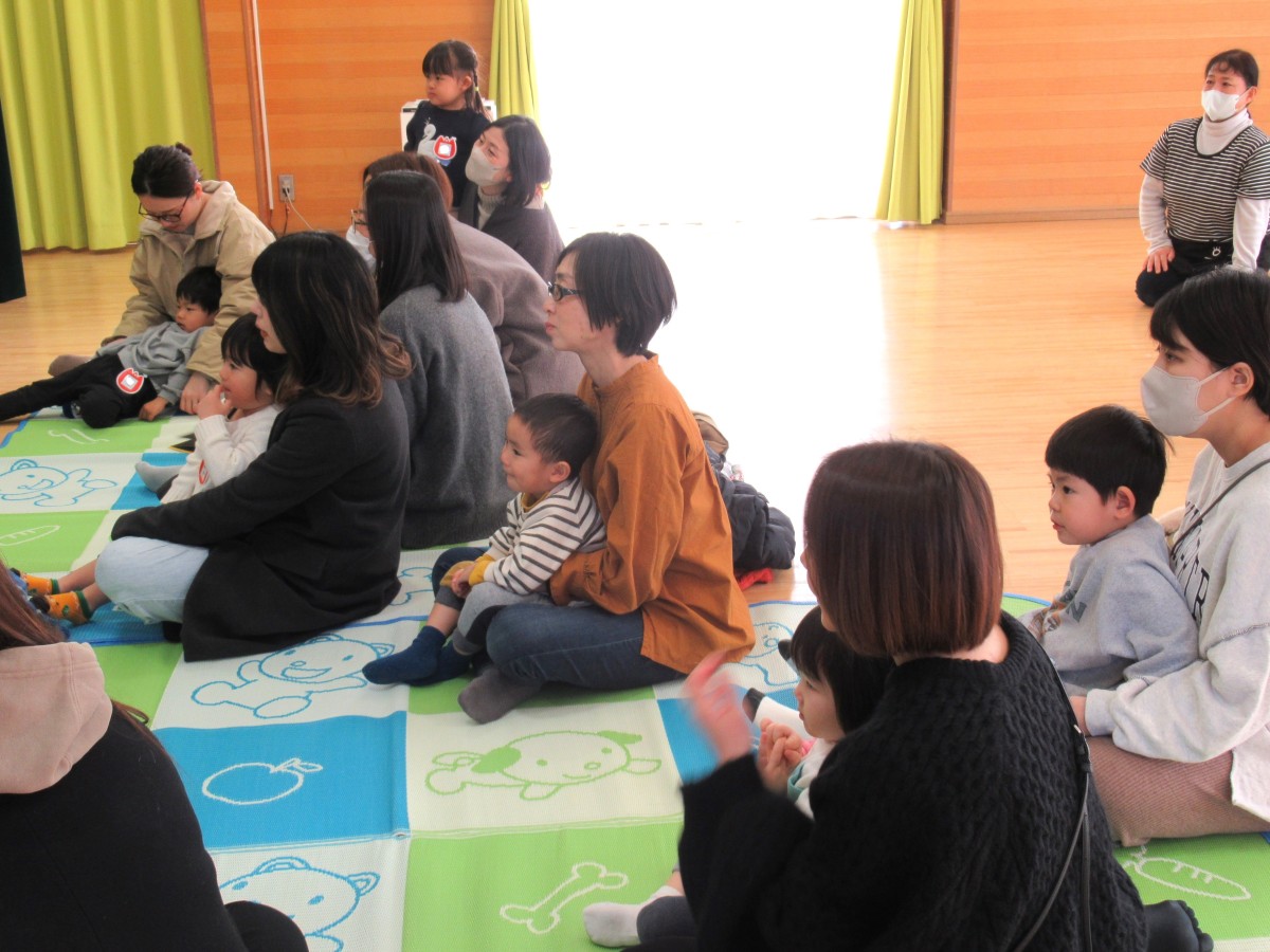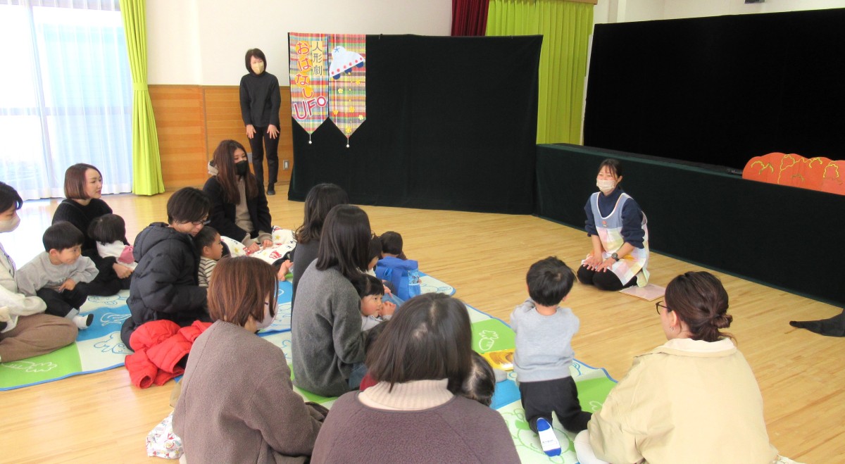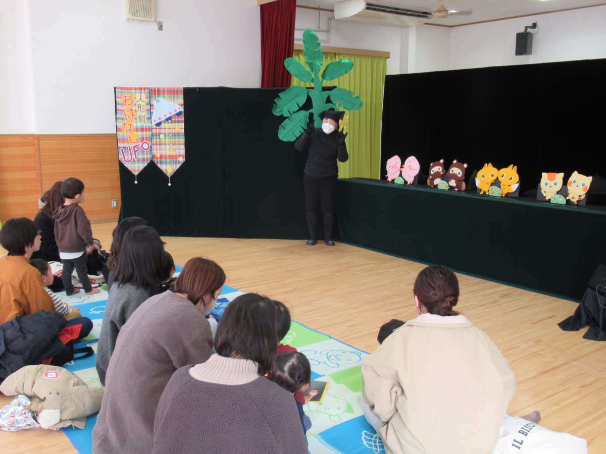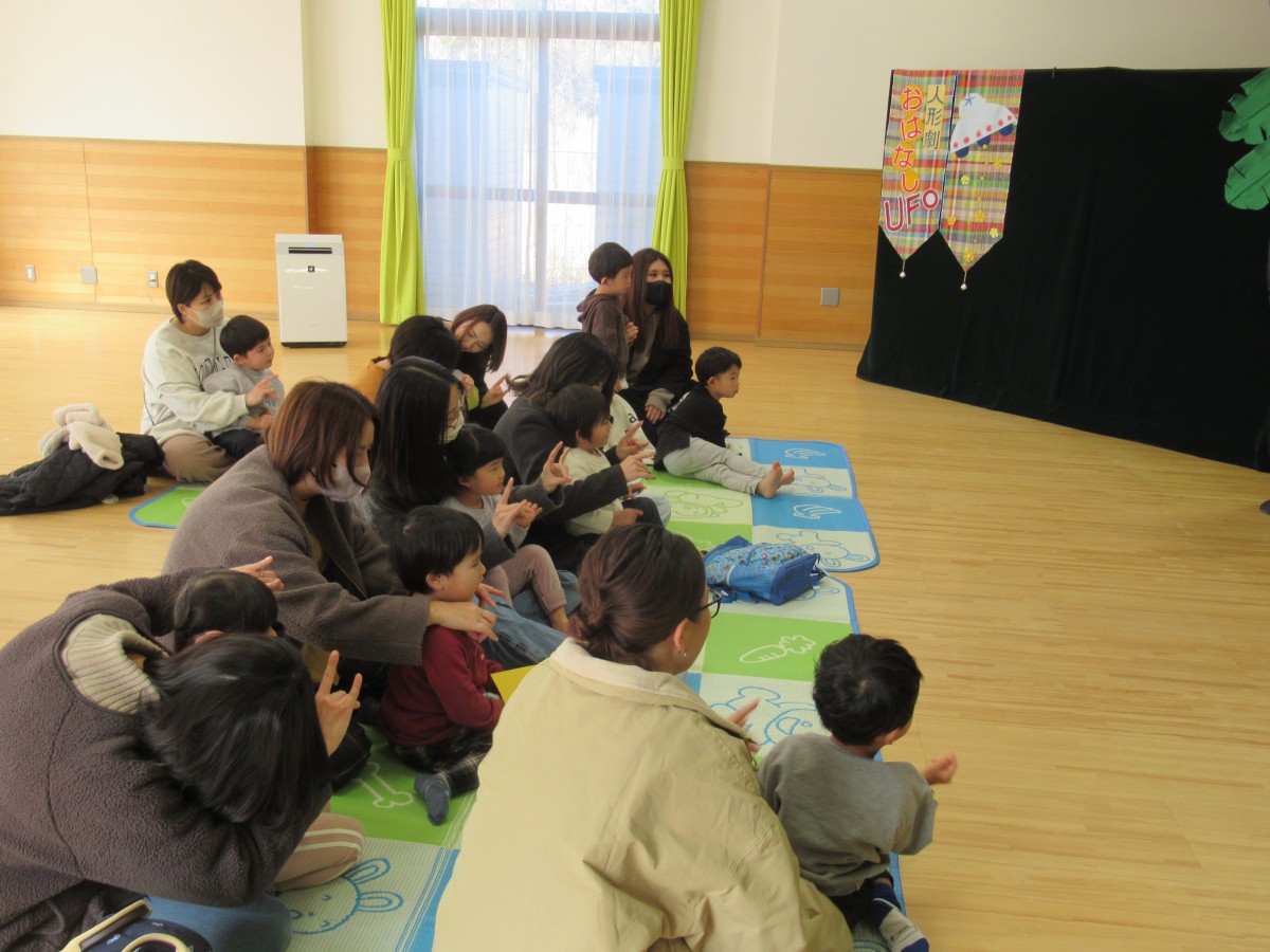山田こども園では、市内在宅2歳児とその保護者を対象とした未就園児活動「はな・はなクラブ」を実施しています。今年度は市内の2歳児親子14組が参加されており、年間8回の「はな・はなクラブ」を通して、様々な触れ合いを楽しめるよう進めているところです。1月17日は、外部講師として『おはなしUFO』さんを招いてのお話会を楽しみました。親子でいろいろなお話を見る機会を通して、子どもたちが“楽しいな”“もっと!”と心を豊かにし、お話の世界に親しんだ子どもたち。