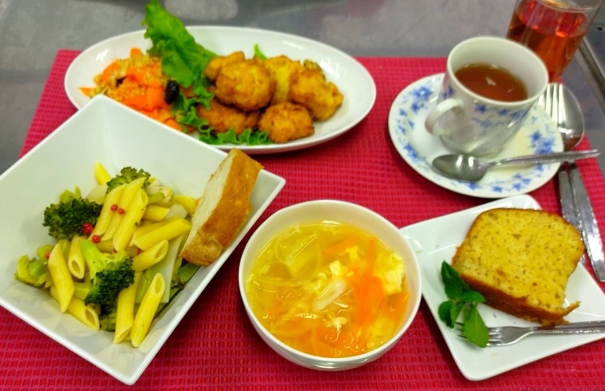 ・ブロッコリーのスパゲッティ、チキンナゲット、キャロットサラダ、スープ、しっとりバナナケーキです。