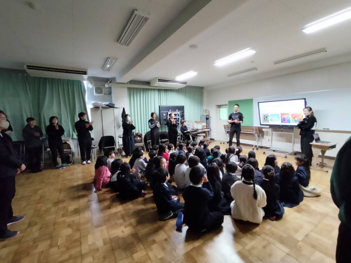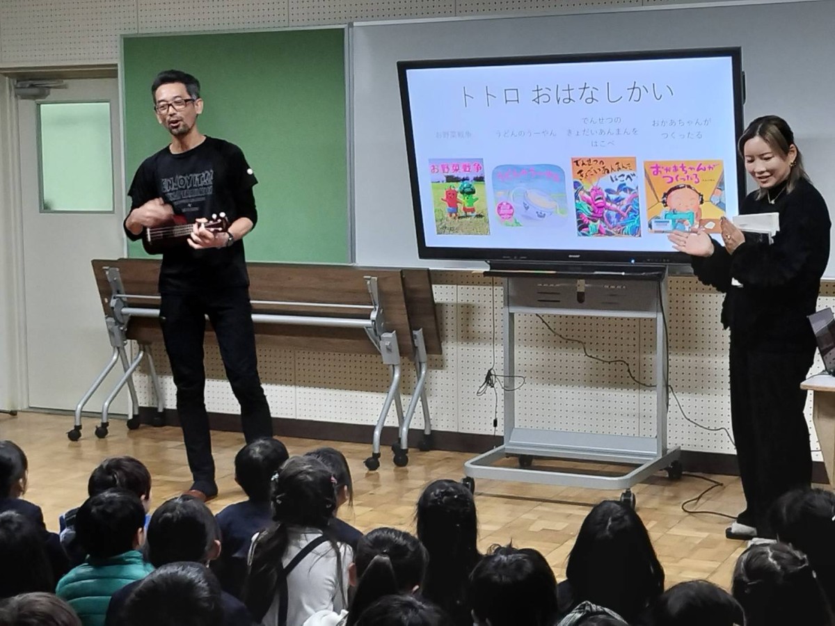 2月19日(月) 1、2、3年生を対象に【トトロお話会】が催され、参観させていただきました。チャックさんのウクレレ伴奏による楽しい歌から始まり、《映像+朗読+音楽(効果音)》で4冊の絵本を紹介されました。