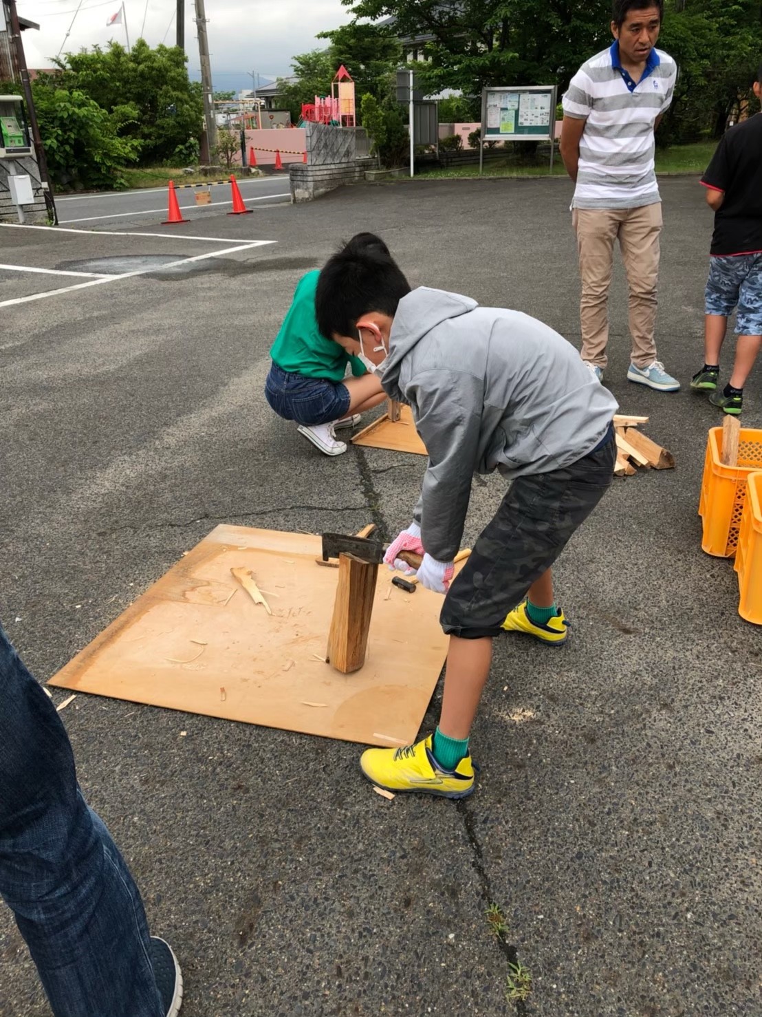 開講式と、第2講座の野外活動に向けた飯ごう炊飯練習・薪割り体験を実施しました。薪割り体験では、木を扱うことの難しさを体験し、火を簡単にコンロで扱うことのできる日常に感謝の気持ちがわきました。